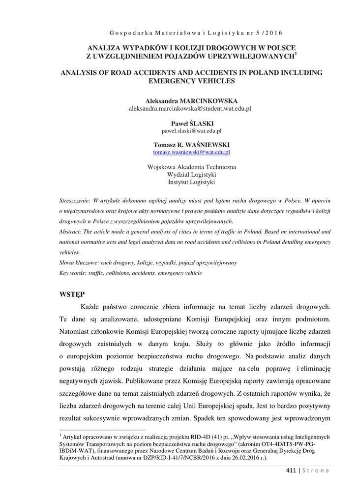 Gospodarka Materiałowa i Logistyka nr 5 /2016 ANALIZA WYPADKÓW I KOLIZJI DROGOWYCH W POLSCE Z UWZGLĘDNIENIEM POJAZDÓW UPRZYWILEJOWANYCH1 ANALYSIS OF ROAD ACCIDENTS AND ACCIDENTS IN POLAND INCLUDING EMERGENCY VEHICLES Aleksandra MARCINKOWSKA [email protected] Paweł ŚLASKI [email protected] Tomasz R. WAŚNIEWSKI [email protected] Wojskowa Akademia Techniczna Wydział Logistyki Instytut Logistyki Streszczenie: W artykule dokonano ogólnej analizy miast pod kątem ruchu drogowego w Polsce. W oparciu o międzynarodowe oraz krajowe akty normatywne i prawne poddano analizie dane dotyczące wypadków i kolizji drogowych w Polsce z wyszczególnieniem pojazdów uprzywilejowanych. Abstract: The article made a general analysis of cities in terms of traffic in Poland. Based on international and national normative acts and legal analyzed data on road accidents and collisions in Poland detailing emergency vehicles. Słowa kluczowe: ruch drogowy, kolizje, wypadki, pojazd uprzywilejowany Key words: traffic, collisions, accidents, emergency vehicle WSTĘP Każde państwo corocznie zbiera informacje na temat liczby zdarzeń drogowych. Te dane są analizowane, udostępniane Komisji Europejskiej oraz innym podmiotom. Natomiast członkowie Komisji Europejskiej tworzą coroczne raporty ujmujące liczbę zdarzeń drogowych zaistniałych w danym kraju. Służy to głównie jako źródło informacji o europejskim poziomie bezpieczeństwa ruchu drogowego. Na podstawie analiz danych powstają różnego rodzaju strategie działania mające na celu poprawę i eliminację negatywnych zjawisk. Publikowane przez Komisję Europejską raporty zawierają opracowane szczegółowe dane na temat zaistniałych zdarzeń drogowych. Z ostatnich raportów wynika, że liczba zdarzeń drogowych na terenie całej Unii Europejskiej spada. Jest to bardzo pozytywny rezultat sukcesywnie wprowadzanych zmian. Spadek ten spowodowany jest wprowadzonym 1 Artykuł opracowano w związku z realizacją projektu RID-4D (41) pt. „Wpływ stosowania usług Inteligentnych Systemów Transportowych na poziom bezpieczeństwa ruchu drogowego” (akronim OT4-4D/ITS-PW-PGIBDiM-WAT), finansowanego przez Narodowe Centrum Badań i Rozwoju oraz Generalną Dyrekcję Dróg Krajowych i Autostrad (umowa nr DZP/RID-I-41/7/NCBR/2016 z dnia 26.02.2016 r.). 411 | S t r o n a Gospodarka Materiałowa i Logistyka nr 5 /2016 oraz zatwierdzonym IV Europejskim Planem działania na rzecz bezpieczeństwa ruchu drogowego na lata 2011 - 2020. Głównym celem planu jest spadek liczby ofiar śmiertelnych o 50% do roku 2020 w każdym państwie. Komisja Europejska wyszczególniła także 7 celów strategicznych planu są to m.in.: 1) Poprawa środków bezpieczeństwa dla samochodów ciężarowych i osobowych, 2) Budowa bezpieczniejszych dróg, 3) Rozwój inteligentnych pojazdów, 4) Usystematyzowanie zasad egzaminowania i szkolenia kierowców, 5) Skuteczniejsze egzekwowanie przepisów prawa, 6) Ograniczenie liczby rannych 7) Nowe działania dotyczące motocyklistów (Duszyński, Dwulit, 2013). Plan zobowiązuje kraje członkowskie UE do wprowadzenia tych celów w życie we własnym kraju, dlatego też wszystkie one zostały zawarte w Narodowym Programie Bezpieczeństwa Ruchu Drogowego 2013 – 2020. 1. OGÓLNA ANALIZA MIAST POD KĄTEM RUCHU DROGOWEGO W POLSCE Według danych pochodzących z Głównego Urzędu Statystycznego w roku 2014 uczestniczyło i nadal uczestniczy w ruchu drogowym 20 003 863 samochodów osobowych zarejestrowanych w kraju oraz 106 057 autobusów. Jest to efekt rozrastającego się rynku motoryzacyjnego w Polsce i dużą z tego powodu liczbą pojazdów poruszających się w szczególności w centrach miast. W rezultacie tworzą się znaczne utrudnienia drogowe w postaci tzw. zatorów drogowych, które skutkują trudnościami nie tylko w poruszaniu się po centrum miast, ale również utrudniają pracę służbom ratowniczym oraz prewencyjnym dbającym o bezpieczeństwo obywateli. Wraz z wzrastającą liczbą pojazdów na drogach publicznych, zwiększa się ilość dróg, po których uczestnicy ruchu drogowego mogą się poruszać. Efekt wzrostu długości dróg publicznych zawdzięcza się przystąpieniu Polski do Unii Europejskiej w 2004 roku. Rysunek 1 przedstawia długość dróg publicznych w tys. km w latach 2009-2013 w Polsce bez podziału na drogi ekspresowe, autostrady, itp. 412 | S t r o n a Gospodarka Materiałowa i Logistyka nr 5 /2016 415 410 405 400 395 390 385 380 375 370 412 412 414 2011 2012 2013 406 384 2009 2010 długość dróg publicznych w tys.km w Polsce Rys. 1. Długość dróg publicznych w tys. km w Polsce w latach 2009-2013 Źródło: opracowanie własne na podstawie danych z Banku Danych Lokalnych GUS; stan z dnia 12.10.2015 r. Można z niego stwierdzić, że w ciągu 5 lat od 2009 roku przybyło 30 tys. kilometrów dróg. Rozwój infrastruktury drogowej w Polsce oparty jest głównie na rozbudowie dróg autostradowych, ekspresowych, natomiast mniejsza uwaga jest skierowana na infrastrukturę miejską. Procesy zachodzące w systemach miejskich są ściśle powiązane z potrzebami ich użytkowników, czyli ludzi (rys.2). Przykładem ścisłego powiązania i współpracy jest relacja przewoźnik i klient. Klient ma możliwość złożenia swoich sugestii, niezadowolenia z jakości obsługiwania, dostępności tras komunikacji miejskiej w danym mieście. W związku z czym przewoźnik może wziąć pod uwagę wszelkie informacje płynące od uczestników ruchu klientów przy wprowadzeniu zmian bądź tworzeniu nowych rozwiązań i ulepszeń. Ulepszenia oraz nowe rozwiązania stanowią informacją zwrotną na dane płynące od najniższego szczebla do szczebla operacyjnego. 413 | S t r o n a Gospodarka Materiałowa i Logistyka nr 5 /2016 Rys. 2. Miasto w ujęciu systemu Źródło: opracowanie własne na podstawie J. Figurski, Ekonomika Logistyki, WAT, Warszawa 2009, str.7. Rosnące problemy centrów miast związane są m.in. z wcią