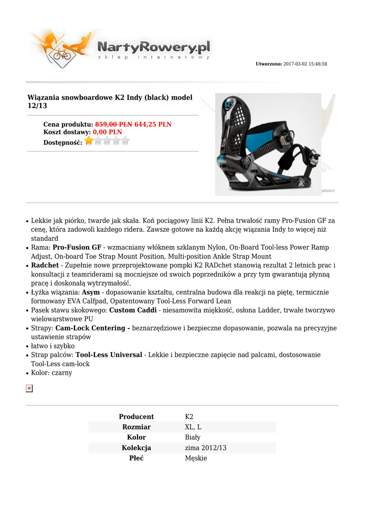 Utworzono: 2017-03-02 15:48:58 Wiązania snowboardowe K2 Indy (black) model 12/13 Cena produktu: 859,00 PLN 644,25 PLN Koszt dostawy: 0,00 PLN Dostępność: ● ● ● ● ● ● ● ● ● Lekkie jak piórko, twarde jak skała. Koń pociągowy linii K2. Pełna trwałość ramy Pro-Fusion GF za cenę, która zadowoli każdego ridera. Zawsze gotowe na każdą akcję wiązania Indy to więcej niż standard Rama: Pro-Fusion GF - wzmacniany włóknem szklanym Nylon, On-Board Tool-less Power Ramp Adjust, On-board Toe Strap Mount Position, Multi-position Ankle Strap Mount Radchet - Zupełnie nowe przeprojektowane pompki K2 RADchet stanowią rezultat 2 letnich prac i konsultacji z teamriderami są mocniejsze od swoich poprzedników a przy tym gwarantują płynną pracę i doskonałą wytrzymałość. Łyżka wiązania: Asym - dopasowanie kształtu, centralna budowa dla reakcji na piętę, termicznie formowany EVA Calfpad, Opatentowany Tool-Less Forward Lean Pasek stawu skokowego: Custom Caddi - niesamowita miękkość, osłona Ladder, trwałe tworzywo wielowarstwowe PU Strapy: Cam-Lock Centering - beznarzędziowe i bezpieczne dopasowanie, pozwala na precyzyjne ustawienie strapów łatwo i szybko Strap palców: Tool-Less Universal - Lekkie i bezpieczne zapięcie nad palcami, dostosowanie Tool-Less cam-lock Kolor: czarny Producent K2 Rozmiar XL, L Kolor Biały Kolekcja Płeć zima 2012/13 Męskie Adres: http://nartyrowery.pl/ Telefon: 34 365 66 09 Email: [email protected] Gadu-Gadu: Skype:
