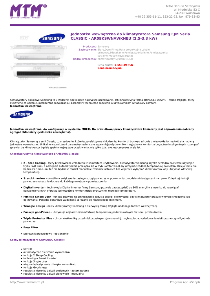 MTM Dariusz Seferyński ul. Młodnicka 52 C 04-239 Warszawa +48 22 353-11-11, 353-22-22, fax. 879-83-83 Jednostka wewnętrzna do klimatyzatora Samsung FJM Seria CLASSIC - AR09KSWNAWKNEU (2,5-3,3 kW) Producent: Samsung Zastosowanie: Biuro,Dom,Firma,Hala produkcyjna,Lokale usługowe,Mieszkanie,Pomieszczenia inne,Pomieszczenia socjalne,Pracownia,Warsztat Rodzaj urządzenia: Klimatyzatory System MULTI Cena brutto: 1 659,39 PLN Cena promocyjna Klimatyzatory pokojowe Samsung to urządzenia spełniające najwyższe oczekiwania. Ich innowacyjna forma TRIANGLE DESING - forma trójkąta, łączy efektywne chłodzenie, inteligentne rozwiązania i parametry techniczne zapewniają użytkownikom wyjątkowy komfort. Jednostka wewnętrzna. Jednostka wewnętrzna, do konfiguracji w systemie MULTI. Do prawidłowej pracy klimatyzatora konieczny jest odpowiednio dobrany agregat chłodniczy (jednostka zewnętrzna). Klimatyzator Samsung z serii Classic, to urządzenie, które łączy efektywne chłodzenie, komfort i troskę o zdrowie z niezwykłą formą trójkąta nadaną jednostce wewnętrznej. Unikalne wzornictwo i parametry techniczne zapewniają użytkownikom wyjątkowy komfort a bogactwo inteligentnych rozwiązań sprawia, że klimatyzator będzie spełniał najwyższe oczekiwania, nie tylko dziś, ale jeszcze przez wiele lat. Charakterystyka klimatyzatora SAMSUNG Classic: 2 - Step Cooling - łączy błyskawiczne chłodzenie z komfortem użytkowania. Klimatyzator Samsung szybko schładza powietrze używając trybu Fast Cool, a następnie automatycznie przełącza się w tryb Comfort Cool, by utrzymać żądaną temperaturę powietrza. Dzięki temu nie będzie Ci zimno, ani też nie będziesz musiał manualnie zmieniać ustawień lub włączać i wyłączać klimatyzatora, aby utrzymać właściwą temperaturę. Szeroki nawiew - umożliwia zwiększenie zasięgu strugi powietrza w porównaniu z modelami dostępnymi na rynku. Dzięki tej funkcji powietrze skutecznie dociera do każdego miejsca w pomieszczeniu. Digital Inverter - technologia Digital Inverter firmy Samsung pozwala zaoszczędzić do 80% energii w stosunku do rozwiązań konwencjonalnych oferując jednocześnie komfort dzięki precyzyjnej regulacji temperatury. Funkcja Single User - funkcja pozwala na zmniejszenie zużycia energii elektrycznej gdy klimatyzator pracuje w trybie chłodzenia lub ogrzewania. Ponadto ogranicza wydajność sprężarki do niezbędnego minimum. Triangle design - nowy klimatyzatory Samsung z niezwykłą formą trójkąta nadaną jednostce wewnętrznej. Funkcja good’sleep - utrzymuje najbardziej komfortową temperaturę podczas różnych faz snu i przebudzenia. Triple Protector Plus - chroni elektronikę przed niekorzystnymi zjawiskami tj. nagłe spięcia, wyładowania elektryczne czy wilgotność powietrza. Easy Filter Sterownik przewodowy - opcjonalnie. Cechy klimatyzatora SAMSUNG Classic: filtr HD automatyczne osuszanie wymiennika funkcja 2 Steep Cooling technologia Smart Inverter funkcja Single User włączanie/wyłączanie dźwięku komunikatu funkcja Good'sleep regulacja kierunku żaluzji poziomych - automatyczna regulacja kierunku żaluzji pionowych - manualna http://www.firmamtm.pl Program AptusShop6 MTM Dariusz Seferyński ul. Młodnicka 52 C 04-239 Warszawa +48 22 353-11-11, 353-22-22, fax. 879-83-83 liczba biegów wentylatora - 4 możliwość podłączenia sterownika przewodowego autodiagnostyka przy uruchomieniu chłodzenie ogrzewanie cyrkulacja osuszanie cichy turbo auto automatyczna zmiana trybu pracy automatyczny Restart Klimatyzacja w najwyższej klasie Klasa energetyczna A to dopiero początek drogi jaką obrał Samsung. Poznaj nowe wyjątkowo wydajne, ciche i funkcjonalne modele urządzeń, które gwarantują komfort i czyste powietrze. Przyjazny środowisku Samsung Chronimy naturę, w której żyjemy. Firma Samsung planuje przyszłość, myśląc o swoich klientach i środowisku. Realizując nadzieje o czystszym, zdrowszym życiu dla nas i przyszłych pokoleń oraz wdrażając przyjazne środowisku naturalnemu technologie, Samsung pracuje nad doskonalszym obrazem świata. Przyjazne środowisku systemy klimatyzacji Pracując stale nad ekologicznym podejściem do produkcji, firma Samsung wytwarza klimatyzatory działające w oparciu o przyjazny dla środowiska czynnik chłodniczy R410a, chroniąc dzięki temu warstwę ozonową naszej Planety. Większość produktów firmy Samsung uzyskała klasę energetyczną A oraz znak ENERGY STAR w USA. Energooszczędne klimatyzatory nie tylko obniżają wydatki na energię, ale również pomagają chronić środowisko naturalne. Najlepsza temperatura do głębokiego snu. Zależnie od etapu snu temperatura w pomieszczeniu automatycznie zmienia się w taki sposób, aby zasypianie było szybkie, właściwy sen głęboki, a poranna pobudka nie sprawiała problemu. Budząc się świeży i wypoczęty, wspaniale rozpoczynasz nowy dzień. Czym jest strefa Good sleep? Strefa trybu Good’sleep jest miejscem, gdzie możesz słodko spać dzięki wyjątkowej technologii Samsunga, opracowanej na podstawie badań naukowych nad snem. Obniżenie jakości snu wywiera szkodliwy wpływ na zdrowie psychiczne i fizyczne człowieka. Wywołuje poirytowanie, osłabienie koncentracji, http://www.firmamtm.pl Program AptusShop6 MTM Dariusz Seferyński ul. Młodnicka 52 C 04-239 Warszawa +48 22 353-11-11, 353-22-22, fax. 879-83-83 nieprawidłowości pracy autonomicznego układu nerwowego i pogorszenie odporności. Ponadto, hormony wzrostu, które odpowiadają za proces odbudowy po urazach i regenerację skóry, są wydzielane wyłącznie podczas snu. Jeżeli nie możesz dobrze spać, pogarsza się stan Twojej skóry i zdrowia. W Strefie Good’sleep nie ma takich zmartwień. 01 Faza zasypiania Wprowadza w sen przez obniżenie temperatury w pomieszczeniu 02 Faza głębokiego snu Relaksuje p0odnisząc powoli temperaturę 03 Faza pobudki Pozwala wybudzić się w komfortowej temperaturze. Gwaran