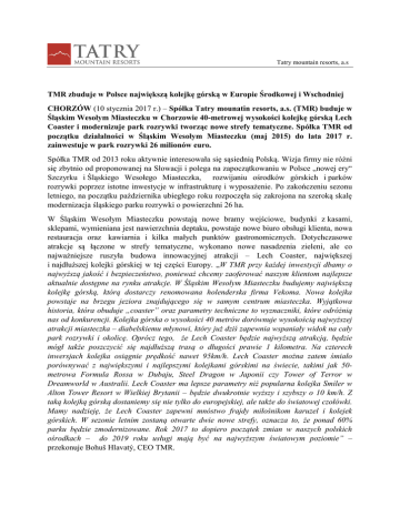 Tatry mountain resorts, a.s TMR zbuduje w Polsce największą kolejkę górską w Europie Środkowej i Wschodniej CHORZÓW (10 stycznia 2017 r.) – Spółka Tatry mounatin resorts, a.s. (TMR) buduje w Śląskim Wesołym Miasteczku w Chorzowie 40-metrowej wysokości kolejkę górską Lech Coaster i modernizuje park rozrywki tworząc nowe strefy tematyczne. Spółka TMR od początku działalności w Śląskim Wesołym Miasteczku (maj 2015) do lata 2017 r. zainwestuje w park rozrywki 26 milionów euro. Spółka TMR od 2013 roku aktywnie interesowała się sąsiednią Polską. Wizja firmy nie różni się zbytnio od proponowanej na Słowacji i polega na zapoczątkowaniu w Polsce „nowej ery“ Szczyrku i Śląskiego Wesołego Miasteczka, rozwijaniu ośrodków górskich i parków rozrywki poprzez istotne inwestycje w infrastrukturę i wyposażenie. Po zakończeniu sezonu letniego, na początku października ubiegłego roku rozpoczęła się zakrojona na szeroką skalę modernizacja śląskiego parku rozrywki o powierzchni 26 ha. W Śląskim Wesołym Miasteczku powstają nowe bramy wejściowe, budynki z kasami, sklepami, wymieniana jest nawierzchnia deptaku, powstaje nowe biuro obsługi klienta, nowa restauracja oraz kawiarnia i kilka małych punktów gastronomicznych. Dotychczasowe atrakcje są łączone w strefy tematyczne, wykonano nowe nasadzenia zieleni, ale co najważniejsze ruszyła budowa innowacyjnej atrakcji – Lech Coaster, największej i najdłuższej kolejki górskiej w tej części Europy. „W TMR przy każdej inwestycji dbamy o najwyższą jakość i bezpieczeństwo, ponieważ chcemy zaoferować naszym klientom najlepsze aktualnie dostępne na rynku atrakcje. W Śląskim Wesołym Miasteczku budujemy największą kolejkę górską, którą dostarczy renomowana holenderska firma Vekoma. Nowa kolejka powstaje na brzegu jeziora znajdującego się w samym centrum miasteczka. Wyjątkowa historia, która obuduje „coaster” oraz parametry techniczne to wyznaczniki, które odróżnią nas od konkurencji. Kolejka górska o wysokości 40 metrów dorównuje wysokością najwyższej atrakcji miasteczka – diabelskiemu młynowi, który już dziś zapewnia wspaniały widok na cały park rozrywki i okolicę. Oprócz tego, że Lech Coaster będzie najwyższą atrakcją, będzie mógł także poszczycić się najdłuższą trasą o długości prawie 1 kilometra. Na czterech inwersjach kolejka osiągnie prędkość nawet 95km/h. Lech Coaster można zatem śmiało porównywać z największymi i najlepszymi kolejkami górskimi na świecie, takimi jak 50metrowa Formula Rossa w Dubaju, Steel Dragon w Japonii czy Tower of Terror w Dreamworld w Australii. Lech Coaster ma lepsze parametry niż popularna kolejka Smiler w Alton Tower Resort w Wielkiej Brytanii – będzie dwukrotnie wyższy i szybszy o 10 km/h. Z taką kolejką górską dostaniemy się nie tylko do europejskiej, ale także do światowej czołówki. Mamy nadzieję, że Lech Coaster zapewni mnóstwo frajdy miłośnikom karuzel i kolejek górskich. W sezonie letnim zostaną otwarte dwie nowe strefy, oznacza to, że ponad 60% parku będzie zmodernizowane. Rok 2017 to dopiero początek zmian w naszych polskich ośrodkach – do 2019 roku usługi mają być na najwyższym światowym poziomie” – przekonuje Bohuš Hlavatý, CEO TMR. Lech jako symbol Polski Nazwa kolejki górskiej nawiązuje do okresu panowania pierwszych polskich władców, odwołuje się do legendy o Lechu, legendarnym założycielu Polski. W czasie tułaczki zauważył on gniazdo białego orła z dwoma pisklętami, co uznał za znak, że w tym miejscu powinien wybudować swoje „gniazdo”, czyli twierdzę – był to zalążek dzisiejszej Polski. Aby odwiedzający mogli poczuć atmosferę tamtych czasów, wokół kolejki górskiej powstanie wioska z zamkiem i atrakcyjnymi strefami tematycznymi. Zmodernizowany park będzie podzielony na 6 stref: Magical Village, Valley of Dreams, Magical Forest, Magical Mountains, Adventure Valley i Magical Lake. W tym roku sezon w Śląskim Wesołym Miasteczku zacznie się 29 kwietnia 2017 r., a otwarcie kolejki górskiej Lech Coaster zaplanowano na 1 lipca 2017 r. Wiecej informacji http://www.wesole-miasteczko.pl/. Śląskie Wesołe Miasteczko jest największym i najstarszym (1959) parkiem rozrywki w Polsce, zlokalizowanym na Górnym Śląsku, z unikalną „oazą zieleni“ w postaci Parku Śląskiego. Jedną z największych atrakcji parku rozrywki są samoloty podwieszone na 45metrowej wieży. Od 1985 roku w parku rozrywki działa diabelski młyn, z którego rozpościera się widok na dużą część Śląska. W 2007 roku otwarto 21-metrową kolejkę górską. Na terenie lunaparku znajduje się 50 atrakcji. Rocznie Śląskie Wesołe Miasteczko odwiedza średnio 200 tys. osób. TMR posiada 75% udziałów miasteczka i zarządza nim od maja 2015 roku. W ciągu pięciu lat spółka zobowiązała się zainwestować w modernizację Śląskiego Wesołego Miasteczka 120 mln PLN (30 mln EUR). __________________________________________________________________________________ Tatry mountain resorts, a.s. (TMR) jest największym podmiotem w dziedzinie turystyki w Europie Środkowej i Wschodniej. Firma jest właścicielem i prowadzi atrakcyjne ośrodki górskie, parki rozrywki, hotele, restauracje i sklepy oraz oferuje usługi sportowe. W Tatrach Niskich do TMR należy ośrodek Jasná Nízke Tatry oraz hotele Wellness hotel Grand Jasná, Boutique Hotel Tri studničky, Chalets Jasná De Luxe, Hotel Srdiečko oraz Hotel Rotunda.. TMR jest również właścicielem Aquaparku Tatralandia – największego słowackiego termalnego parku wodnego czynnego przez cały rok. W Tatralandii znajduje się tzw. Tropical Paradise – tropikalna hala z wodą morską oraz wodny Fun Park, aquapark oferuje zakwaterowanie w bungalowach i apartamentach Holiday Village Tatralandia. W Tatrach Wysokich spółka TMR prowadzi ośrodek narciarski Vysoké Tatry w miejcow