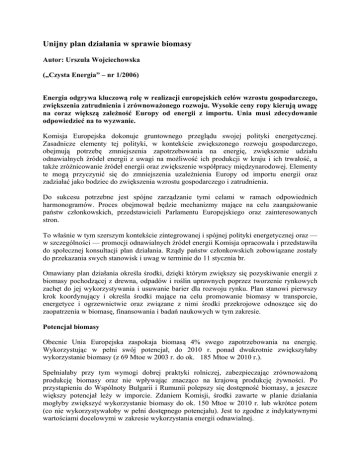 Unijny plan działania w sprawie biomasy Autor: Urszula Wojciechowska („Czysta Energia” – nr 1/2006) Energia odgrywa kluczową rolę w realizacji europejskich celów wzrostu gospodarczego, zwiększenia zatrudnienia i zrównoważonego rozwoju. Wysokie ceny ropy kierują uwagę na coraz większą zależność Europy od energii z importu. Unia musi zdecydowanie odpowiedzieć na to wyzwanie. Komisja Europejska dokonuje gruntownego przeglądu swojej polityki energetycznej. Zasadnicze elementy tej polityki, w kontekście zwiększonego rozwoju gospodarczego, obejmują potrzebę zmniejszenia zapotrzebowania na energię, zwiększenie udziału odnawialnych źródeł energii z uwagi na możliwość ich produkcji w kraju i ich trwałość, a także zróżnicowanie źródeł energii oraz zwiększenie współpracy międzynarodowej. Elementy te mogą przyczynić się do zmniejszenia uzależnienia Europy od importu energii oraz zadziałać jako bodziec do zwiększenia wzrostu gospodarczego i zatrudnienia. Do sukcesu potrzebne jest spójne zarządzanie tymi celami w ramach odpowiednich harmonogramów. Proces obejmował będzie mechanizmy mające na celu zaangażowanie państw członkowskich, przedstawicieli Parlamentu Europejskiego oraz zainteresowanych stron. To właśnie w tym szerszym kontekście zintegrowanej i spójnej polityki energetycznej oraz — w szczególności — promocji odnawialnych źródeł energii Komisja opracowała i przedstawiła do społecznej konsultacji plan działania. Rządy państw członkowskich zobowiązane zostały do przekazania swych stanowisk i uwag w terminie do 11 stycznia br. Omawiany plan działania określa środki, dzięki którym zwiększy się pozyskiwanie energii z biomasy pochodzącej z drewna, odpadów i roślin uprawnych poprzez tworzenie rynkowych zachęt do jej wykorzystywania i usuwanie barier dla rozwoju rynku. Plan stanowi pierwszy krok koordynujący i określa środki mające na celu promowanie biomasy w transporcie, energetyce i ogrzewnictwie oraz związane z nimi środki przekrojowe odnoszące się do zaopatrzenia w biomasę, finansowania i badań naukowych w tym zakresie. Potencjał biomasy Obecnie Unia Europejska zaspokaja biomasą 4% swego zapotrzebowania na energię. Wykorzystując w pełni swój potencjał, do 2010 r. ponad dwukrotnie zwiększyłaby wykorzystanie biomasy (z 69 Mtoe w 2003 r. do ok. 185 Mtoe w 2010 r.). Spełniałaby przy tym wymogi dobrej praktyki rolniczej, zabezpieczając zrównoważoną produkcję biomasy oraz nie wpływając znacząco na krajową produkcję żywności. Po przystąpieniu do Wspólnoty Bułgarii i Rumunii polepszy się dostępność biomasy, a jeszcze większy potencjał leży w imporcie. Zdaniem Komisji, środki zawarte w planie działania mogłyby zwiększyć wykorzystanie biomasy do ok. 150 Mtoe w 2010 r. lub wkrótce potem (co nie wykorzystywałoby w pełni dostępnego potencjału). Jest to zgodne z indykatywnymi wartościami docelowymi w zakresie wykorzystania energii odnawialnej. Koszty i korzyści Z kilku analiz naukowych i ekonomicznych wynika, że takie zwiększenie wykorzystania biomasy w 2010 r. mogłoby przynieść szereg korzyści. Należy do nich dywersyfikacja zaopatrzenia Europy w energię (poprzez zwiększenie udziału energii odnawialnej o 5% i obniżenie uzależnienia od energii importowanej z 48 do 42%), obniżenie emisji gazów cieplarnianych o 209 mln ton CO2eq rocznie, bezpośrednie zatrudnienie maksymalnie 250-300 tys. osób, w większości na obszarach wiejskich, oraz potencjalny nacisk na obniżenie cen ropy naftowej w wyniku mniejszego zapotrzebowania na ropę. Zakładając ceny paliw kopalnych na poziomie niższym od obecnego o ok. 10%, ich dający się bezpośrednio zmierzyć koszt można oszacować na 9 mld euro rocznie, z czego sześć przeznacza się na biopaliwa w transporcie i trzy na biomasę do celów produkcji energii elektrycznej. Jest to równoważne wzrostowi o ok. 1,5 centa na litrze benzyny lub oleju napędowego i 0,1 centa na 1 kWh energii elektrycznej. Można również oczekiwać korzyści ze zwiększenia czołowej pozycji technologicznej UE w tych sektorach bez dodatkowej emisji zanieczyszczeń czy innych form szkodzenia środowisku. Biopaliwa w transporcie W ciągu ostatnich czterech lat ceny ropy zwiększyły się trzykrotnie. Płynne biopaliwa, jako jedyny bezpośredni zamiennik ropy naftowej w transporcie, zasłużenie zyskały status sprawy niezwykle ważnej pod względem politycznym. Rozwój sektora transportowego nie umożliwił jeszcze stabilizacji emisji gazów cieplarnianych, pomimo znacznych wysiłków poczynionych przez tę branżę. Biopaliwa są kosztownym sposobem obniżania emisji gazów cieplarnianych, jednakże w sektorze transportu są one jednym z zaledwie dwóch środków, które mają uzasadnioną szansę osiągnięcia tego celu w znaczącej skali w najbliższej przyszłości (ten drugi środek to umowa producentów samochodów co do redukcji emisji C02 w nowych samochodach). Na początku roku Komisja przedstawi specjalny komunikat dotyczący biopaliw. Dyrektywa o biopaliwach określa jako wartości odniesienia następujący procentowy udział biopaliw w rynku: w 2005 r. miało to być 2%, a w 2010 r. — 5,75%. Nie udało się zrealizować wartości odniesienia określonej na rok 2005. Poszczególne państwa członkowskie wykazywały bardzo zróżnicowane wyniki, a i tak biopaliwa stanowiły łącznie zaledwie 1,4% udziału w rynku. Aby wdrożyć tę dyrektywę, wiele państw członkowskich opiera się na zwolnieniach podatkowych dotyczących paliwa. Podlegają one kontroli w ramach pomocy państwa. Zgodnie z wytycznymi w sprawie pomocy państwa w kwestiach ochrony środowiska, Komisja ma zasadniczo przychylne podejście do otrzymanych zgłoszeń. Pojawiło się jednakże kilka problemów praktycznych. Kilka państw członkowskich wprowadziło ostatnio zobowiązania dotyczące biopaliw i zobligowało firmy zajmujące się dostarczaniem pa