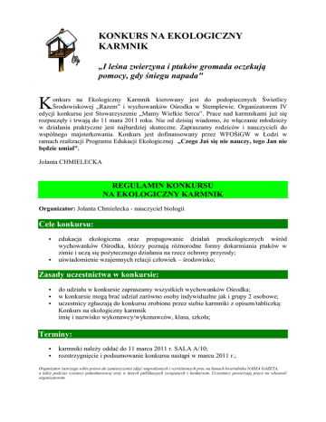 KONKURS NA EKOLOGICZNY KARMNIK „I leśna zwierzyna i ptaków gromada oczekują pomocy, gdy śniegu napada" onkurs na Ekologiczny Karmnik kierowany jest do podopiecznych Świetlicy Środowiskowej „Razem” i wychowanków Ośrodka w Stemplewie. Organizatorem IV edycji konkursu jest Stowarzyszenie „Mamy Wielkie Serca”. Prace nad karmnikami już się rozpoczęły i trwają do 11 mara 2011 roku. Nie od dzisiaj wiadomo, że włączanie młodzieży w działania praktyczne jest najbardziej skuteczne. Zapraszamy rodziców i nauczycieli do wspólnego majsterkowania. Konkurs jest dofinansowany przez WFOŚiGW w Łodzi w ramach realizacji Programu Edukacji Ekologicznej „Czego Jaś się nie nauczy, tego Jan nie będzie umiał”. K Jolanta CHMIELECKA REGULAMIN KONKURSU NA EKOLOGICZNY KARMNIK Organizator: Jolanta Chmielecka - nauczyciel biologii Cele konkursu: edukacja ekologiczna oraz propagowanie działań proekologicznych wśród wychowanków Ośrodka, którzy poznają różnorodne formy dokarmiania ptaków w zimie i uczą się pożytecznego działania na rzecz ochrony przyrody; uświadomienie wzajemnych relacji człowiek – środowisko; Zasady uczestnictwa w konkursie: do udziału w konkursie zapraszamy wszystkich wychowanków Ośrodka; w konkursie mogą brać udział zarówno osoby indywidualne jak i grupy 2 osobowe; uczestnicy zgłaszają do konkursu zrobione przez siebie karmniki z opisem/tabliczką: Konkurs na ekologiczny karmnik imię i nazwisko wykonawcy/wykonawców, klasa, szkoła; Terminy: karmniki należy oddać do 11 marca 2011 r. SALA A/10; rozstrzygnięcie i podsumowanie konkursu nastąpi w marcu 2011 r.; Organizator zastrzega sobie prawo do zamieszczenia zdjęć nagrodzonych i wyróżnionych prac na łamach kwartalnika NASZA GAZETA, a także podczas wystawy pokonkursowej oraz w innych publikacjach związanych z konkursem. Uczestnicy powierzają prace na własność organizatorom. Kryteria stosowane podczas oceny prac konkursowych: ocena prac przez komisję powołaną przez Organizatora; zgodność z regulaminem konkursu; oryginalność projektu przy zachowaniu funkcjonalności karmników; solidność wykonania; dobór materiałów; Nagrody: W konkursie zostaną przyznane dyplomy i nagrody. Fundatorzy nagród zostaną podani do wiadomości uczestnikom konkursu podczas ogłoszenia wyników. ZAPRASZAMY DO UDZIAŁU W KONKURSIE