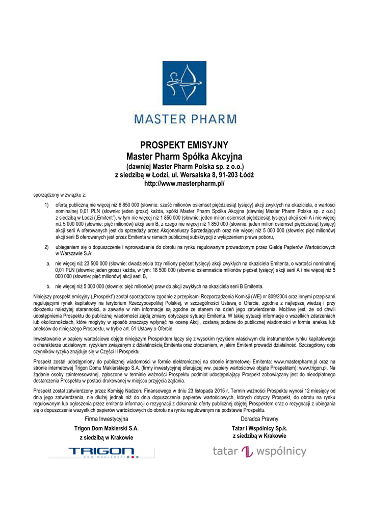 PROSPEKT EMISYJNY Master Pharm Spółka Akcyjna (dawniej Master Pharm Polska sp. z o.o.) z siedzibą w Łodzi, ul. Wersalska 8, 91-203 Łódź http://www.masterpharm.pl/ sporządzony w związku z: 1) ofertą publiczną nie więcej niż 6 850 000 (słownie: sześć milionów osiemset pięćdziesiąt tysięcy) akcji zwykłych na okaziciela, o wartości nominalnej 0,01 PLN (słownie: jeden grosz) każda, spółki Master Pharm Spółka Akcyjna (dawniej Master Pharm Polska sp. z o.o.) z siedzibą w Łodzi („Emitent”), w tym nie więcej niż 1 850 000 (słownie: jeden milion osiemset pięćdziesiąt tysięcy) akcji serii A i nie więcej niż 5 000 000 (słownie: pięć milionów) akcji serii B, z czego nie więcej niż 1 850 000 (słownie: jeden milion osiemset pięćdziesiąt tysięcy) akcji serii A oferowanych jest do sprzedaży przez Akcjonariuszy Sprzedających oraz nie więcej niż 5 000 000 (słownie: pięć milionów) akcji serii B oferowanych jest przez Emitenta w ramach publicznej subskrypcji z wyłączeniem prawa poboru, 2) ubieganiem się o dopuszczenie i wprowadzenie do obrotu na rynku regulowanym prowadzonym przez Giełdę Papierów Wartościowych w Warszawie S.A: a. nie więcej niż 23 500 000 (słownie: dwadzieścia trzy miliony pięćset tysięcy) akcji zwykłych na okaziciela Emitenta, o wartości nominalnej 0,01 PLN (słownie: jeden grosz) każda, w tym: 18 500 000 (słownie: osiemnaście milionów pięćset tysięcy) akcji serii A i nie więcej niż 5 000 000 (słownie: pięć milionów) akcji serii B, b. nie więcej niż 5 000 000 (słownie: pięć milionów) praw do akcji zwykłych na okaziciela serii B Emitenta. Niniejszy prospekt emisyjny („Prospekt”) został sporządzony zgodnie z przepisami Rozporządzenia Komisji (WE) nr 809/2004 oraz innymi przepisami regulującymi rynek kapitałowy na terytorium Rzeczypospolitej Polskiej, w szczególności Ustawą o Ofercie, zgodnie z najlepszą wiedzą i przy dołożeniu należytej staranności, a zawarte w nim informacje są zgodne ze stanem na dzień jego zatwierdzenia. Możliwe jest, że od chwili udostępnienia Prospektu do publicznej wiadomości zajdą zmiany dotyczące sytuacji Emitenta. W takiej sytuacji informacje o wszelkich zdarzeniach lub okolicznościach, które mogłyby w sposób znaczący wpłynąć na ocenę Akcji, zostaną podane do publicznej wiadomości w formie aneksu lub aneksów do niniejszego Prospektu, w trybie art. 51 Ustawy o Ofercie. Inwestowanie w papiery wartościowe objęte niniejszym Prospektem łączy się z wysokim ryzykiem właściwym dla instrumentów rynku kapitałowego o charakterze udziałowym, ryzykiem związanym z działalnością Emitenta oraz otoczeniem, w jakim Emitent prowadzi działalność. Szczegółowy opis czynników ryzyka znajduje się w Części II Prospektu. Prospekt został udostępniony do publicznej wiadomości w formie elektronicznej na stronie internetowej Emitenta: www.masterpharm.pl oraz na stronie internetowej Trigon Domu Maklerskiego S.A. (firmy inwestycyjnej oferującej ww. papiery wartościowe objęte Prospektem): www.trigon.pl. Na żądanie osoby zainteresowanej, zgłoszone w terminie ważności Prospektu podmiot udostępniający Prospekt zobowiązany jest do nieodpłatnego dostarczenia Prospektu w postaci drukowanej w miejscu przyjęcia żądania. Prospekt został zatwierdzony przez Komisję Nadzoru Finansowego w dniu 23 listopada 2015 r. Termin ważności Prospektu wynosi 12 miesięcy od dnia jego zatwierdzenia, nie dłużej jednak niż do dnia dopuszczenia papierów wartościowych, których dotyczy Prospekt, do obrotu na rynku regulowanym lub ogłoszenia przez emitenta informacji o rezygnacji z dokonania oferty publicznej objętej Prospektem oraz o rezygnacji z ubiegania się o dopuszczenie wszystkich papierów wartościowych do obrotu na rynku regulowanym na podstawie Prospektu. Firma Inwestycyjna Doradca Prawny Trigon Dom Maklerski S.A. Tatar i Wspólnicy Sp.k. z siedzibą w Krakowie z siedzibą w Krakowie Prospekt emisyjny Master Pharm S.A. SPIS TREŚCI Spis Treści I – Podsumowanie II – Czynniki Ryzyka 2 9 41 1. Czynniki ryzyka związane z działalnością Emitenta 41 1.1. Strategia rozwoju Grupy może okazać się błędna lub może być błędnie realizowana 41 1.2. Prowadzenie i finansowanie inwestycji w Grupie wiąże się z ryzykiem ograniczonych kompetencji istniejących w tym zakresie w Grupie oraz z ryzykiem niedostatecznego finansowania inwestycji 41 1.3. Zawieranie przez Spółki Grupy umów z podmiotami powiązanymi w rozumieniu przepisów Ustawy o Podatku Dochodowym od Osób Prawnych wiąże się z ryzykiem podatkowym 42 1.4. Jakość produktów Grupy może ulec pogorszeniu, spółki Grupy mogą ponosić odpowiedzialność za produkt 42 1.5. Umowy z odbiorcami mogą być niewykonywane lub nienależycie wykonywane przez spółki Grupy 43 1.6. Przyjęty przez Emitenta i spółki Grupy model współpracy z dostawcami i podwykonawcami jest narażony na zakłócenia funkcjonowania i może okazać się nieefektywny 43 1.7. Emitent jest eksponowany na ryzyko niewystarczającej dywersyfikacji odbiorców 44 1.8. Spółki Grupy mogą utracić posiadane certyfikaty systemów zapewnienia jakości 44 1.9. Spółki Grupy mogą odczuwać niekorzystne skutki zawierania kontraktów długoterminowych lub określających sztywne ceny 44 1.10. Spółki Grupy mogą odczuwać niekorzystne skutki realizacji jednorazowych zamówień 45 1.11. Emitent jest eksponowany na ryzyko kredytowe kontrahenta 45 1.12. Spółki Grupy (poza Emitentem) są eksponowane na ryzyko obniżonej płynności finansowej 45 1.13. Spółki Grupy mogą utracić kluczowych pracowników 46 1.14. Spółki Grupy są eksponowane na ryzyko naruszenia informacji chronionych w tym tajemnicy przedsiębiorstwa spółek Grupy 46 1.15. Emitent i jego akcjonariusze są eksponowani na ryzyka związane ze skoncentrowaną strukturą akcjonariatu 46 1.16. Emitent i jego akcjonariusze są eksponowani na ry