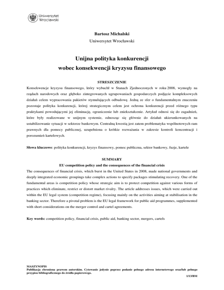 Unijna polityka konkurencji wobec konsekwencji kryzysu finansowego