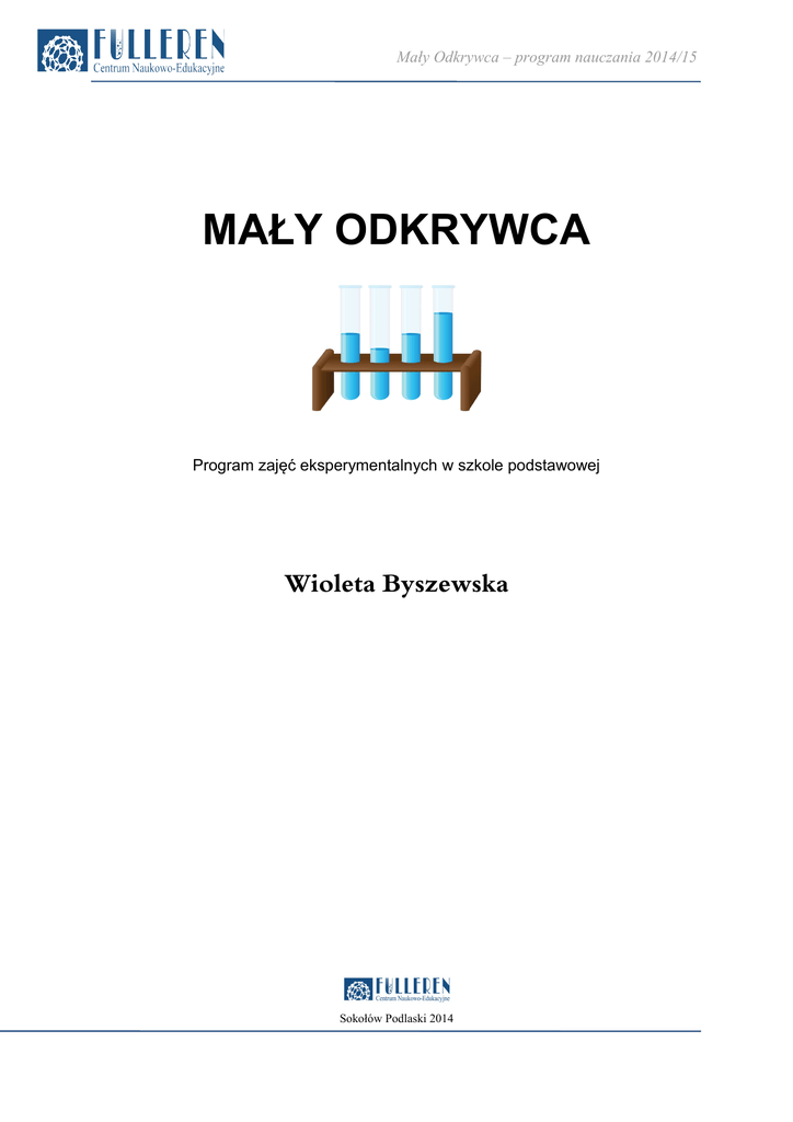 Mały Odkrywca – program nauczania 2014/15 MAŁY ODKRYWCA Program zajęć eksperymentalnych w szkole podstawowej Wioleta Byszewska Sokołów Podlaski 2014 Mały Odkrywca – program nauczania 2014/15 1 I. Wprowadzenie Mały Odkrywca to cykl zajęć eksperymentalnych, obejmujących 30 cotygodniowych spotkań chemika z dziećmi w ich szkole podstawowej. Główną ideą zajęć jest umożliwienie uczniowi aktywnego poznawania i doświadczania świata oraz zainspirowanie go do samodzielnego poszukiwania odpowiedzi na nurtujące go pytania. W trakcie zajęć uczniowie przenoszą się do prawdziwego laboratorium i zamieniają się w małych naukowców. Zajęcia mają na celu stworzenie uczniom okazji do zdobywania różnorodnych doświadczeń z uwzględnieniem osiągniętej dotychczas wiedzy oraz poszerzenie jej o umiejętności praktyczne. Zadaniem nauczyciela nie jest narzucenie uczniowi własnego obrazu świata, ale pomoc w jego samodzielnym kreowaniu. Mały Odkrywca to warsztaty laboratoryjne, które zapewnią dzieciom ogromną dawkę wiedzy praktycznej i teoretycznej z przedmiotów przyrodniczych. Zajęcia pozwolą poszerzyć szkolną teorię o umiejętności praktyczne, co jest ważne nie tylko w dalszej edukacji, ale także w życiu codziennym. Dzięki urozmaiconemu porgramowi, uczniowie przekonają się, że nauka to fantastyczna zabawa, a odkrywanie świata może być niezapomnianą przygodą. Rozbudzanie w dzieciach pasji do nauki już od najmłodszych lat z pewnością zaowocuje w dalszej edukacji. Mały Odkrywca – program nauczania 2014/15 II. program nauczania klasy 1-3 Program zajęć z cyklu Mały Odkrywca dla klas 1-3 został opracowany na poziomie początkującym. Uczniowie tych klas w formie eksperymentów przyrodniczych zrealizują następujące tematy i zagdanienia: 1) Pierwszy stopień wtajemniczenia Będą to zajęcia wprowadzające w świat eksperymentowania. Uczniowie zapoznają się z zasadami bezpiecznej pracy w laboratorium. Ponadto poznają właściwości niektórych pierwiastków i związków chemicznych, zapoznają się ze sprzętem laboratoryjnym oraz podstawowymi czynnościami i pojęciami laboratoryjnymi. 2) Chromatografia skarpetkowa Uczniowie zapoznają się z podstawową techniką pracy w laboratorium biochemicznym (chromatografią cienkowarstwową). Poznają także pojęcie barwy podstawowej oraz sposoby łączenia się barw i powstawania czerni i bieli (podstawy optyki). 3) Śpiewający warzywniak Zajęcia są wprowadzeniem do elektrochemii. Uczniowie samodzielnie skonstruują ogniwo owocowe. Dowiedzą się przy tym co to jest: prąd, bateria, a także jak zbudowane jest ogniowo. 4) Ale jaja Głowny, bohaterem tych zajęć będzie jajko. Uczniowie poznają chemię jajka. Dowiedzą się, jakie składniki chemiczne kryją się w kurzych jajach oraz jak można je zidentyfikować. Poznają ponadto pojęcie spalania oraz co jest odpowiedzialne za ten proces. Wykonają kilka zaskakujących eksperymentów chemicznych oraz fizycznych z wykorzystaniem jajek. 5) Atrament sympatyczny Uczniowie zapoznają się z pojęciem atramentu symaptycznego oraz z właściwościami związków, spotykanych na co dzień w naszych domach, takich jak: cytryna, ocet, czerwona kapusta. Następnie wykorzystają poznane właściwości do stworzenia i wywołania ukrytych wiadomości. 6) Chemiczne jojo Uczniowie w niezykle efektowny sposób wyprodukują dwutlenek węgla. Poznają właściwości tego związku i dowiedzą się, skąd bierze się on w przyrodzie i jakie są skutki jego nadmiaru (pojęcia: gazy cieplarniane, efekt cieplarniany). 7) Samopompujący się balonik Uczniowie nauczą się wykorzystywać w praktyce zdobytą już wiedzę na temat dwutlenku węgla oraz metod jego syntezy. Dopełnią także wiedzę na temat jego właściwości. Zajęcia będą wprowadzeniem w świat elektrostatyki. 8) Produkcja coca-coli Uczniowie nauczą się identyfikować wybrane substancje z życia codziennego na podstawie odczynu roztworu. Dowiedzą się co to jest odczyn roztworu oraz wskaźniki pH. 9) Tajemnice baniek mydlanych Zdradzimy tajemnice baniek mydlanych, tych małych i dużych, okrągłych i kwadratowych, a nawet świecących w ciemności. Na tej lekcji uczniowie poznają zjawisko napięcia powierzchniowego i samodzielnie przygotują zestaw do robienia baniek mydlanych. 2 Mały Odkrywca – program nauczania 2014/15 10) Kolorowy wir Uczniowie utrwalą wiadomości na temat napięcia powierzchniowego wody. Dowiedzą się ponadto czym jest od strony chemicznej i jaka jest zasada działania mydła. Na tej lekcji poruszymy także temat twardości wody oraz poznamy sposoby przedziwdziałania jej. 11) Korzonki w górę? Korzonki w dół? Ta lekcja to krok w stronę biologii. Uczniowie zapoznają się z budową roślin oraz czynnikami potrzebnymi do ich wzrostu. Ponadto samodzielnie przeprowadzą eksperyment, w którym sprawdzą czy roślina da się przechytrzyć i wypuścić korzenie w górę, a liście w dół. 12) Językowa mapa smaków Uczniowie poznają podstawowe wiadomości na temat zmysłów. Zapoznają się z budową powierzchni języka i na sobie wypróbują działanie kubków smakowych. 13) Tęczowy koktajl Na tej lekcji przybliżymy pojęcie: gęstości. Uczniowie przygotują m.in. kolorowy koktajl, który pozwoli im dokonać obserwacji i wyciągnąć wnioski na temat różnej gęstości, otaczających nas substancji. 14) Poduszkowiec Tym razem uczniowie zamienią się w konstruktorów, którzy zbudują małe poduszkowce, napędzane powietrzem. Dzięki temu zadaniu zapoznamy się z zasadą działania poduszkowca i poznamy pojęcie tarcia. 15) Chemiczna stacja pogodowa Uczniowie podczas lekcji nauczą się wykorzystywać wskaźniki pH oraz sole chemiczne w nietypowy sposób – do zrobienia magicznych kwiatów. Zajęcia będą połączeniem chemii i plastyki. 16) Lampa lawa Uczniowie samodzielnie stworzą lampę lawę na dwa sposoby. Na tej lekcji dowiedzą się na temat powstawa