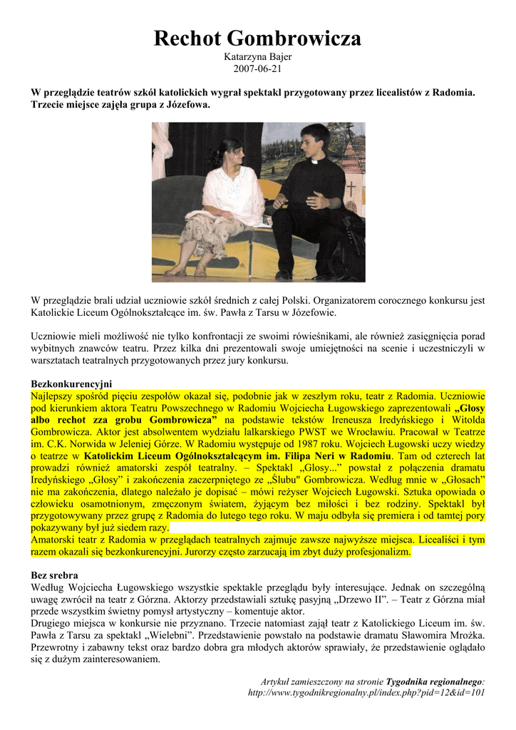 Rechot Gombrowicza Katarzyna Bajer 2007-06-21 W przeglądzie teatrów szkół katolickich wygrał spektakl przygotowany przez licealistów z Radomia. Trzecie miejsce zajęła grupa z Józefowa. W przeglądzie brali udział uczniowie szkół średnich z całej Polski. Organizatorem corocznego konkursu jest Katolickie Liceum Ogólnokształcące im. św. Pawła z Tarsu w Józefowie. Uczniowie mieli możliwość nie tylko konfrontacji ze swoimi rówieśnikami, ale również zasięgnięcia porad wybitnych znawców teatru. Przez kilka dni prezentowali swoje umiejętności na scenie i uczestniczyli w warsztatach teatralnych przygotowanych przez jury konkursu. Bezkonkurencyjni Najlepszy spośród pięciu zespołów okazał się, podobnie jak w zeszłym roku, teatr z Radomia. Uczniowie pod kierunkiem aktora Teatru Powszechnego w Radomiu Wojciecha Ługowskiego zaprezentowali „Głosy albo rechot zza grobu Gombrowicza” na podstawie tekstów Ireneusza Iredyńskiego i Witolda Gombrowicza. Aktor jest absolwentem wydziału lalkarskiego PWST we Wrocławiu. Pracował w Teatrze im. C.K. Norwida w Jeleniej Górze. W Radomiu występuje od 1987 roku. Wojciech Ługowski uczy wiedzy o teatrze w Katolickim Liceum Ogólnokształcącym im. Filipa Neri w Radomiu. Tam od czterech lat prowadzi również amatorski zespół teatralny. – Spektakl „Glosy...” powstał z połączenia dramatu Iredyńskiego „Głosy” i zakończenia zaczerpniętego ze „Ślubu" Gombrowicza. Według mnie w „Głosach” nie ma zakończenia, dlatego należało je dopisać – mówi reżyser Wojciech Ługowski. Sztuka opowiada o człowieku osamotnionym, zmęczonym światem, żyjącym bez miłości i bez rodziny. Spektakl był przygotowywany przez grupę z Radomia do lutego tego roku. W maju odbyła się premiera i od tamtej pory pokazywany był już siedem razy. Amatorski teatr z Radomia w przeglądach teatralnych zajmuje zawsze najwyższe miejsca. Licealiści i tym razem okazali się bezkonkurencyjni. Jurorzy często zarzucają im zbyt duży profesjonalizm. Bez srebra Według Wojciecha Ługowskiego wszystkie spektakle przeglądu były interesujące. Jednak on szczególną uwagę zwrócił na teatr z Górzna. Aktorzy przedstawiali sztukę pasyjną „Drzewo II”. – Teatr z Górzna miał przede wszystkim świetny pomysł artystyczny – komentuje aktor. Drugiego miejsca w konkursie nie przyznano. Trzecie natomiast zajął teatr z Katolickiego Liceum im. św. Pawła z Tarsu za spektakl „Wielebni”. Przedstawienie powstało na podstawie dramatu Sławomira Mrożka. Przewrotny i zabawny tekst oraz bardzo dobra gra młodych aktorów sprawiały, że przedstawienie oglądało się z dużym zainteresowaniem. Artykuł zamieszczony na stronie Tygodnika regionalnego: http://www.tygodnikregionalny.pl/index.php?pid=12&id=101