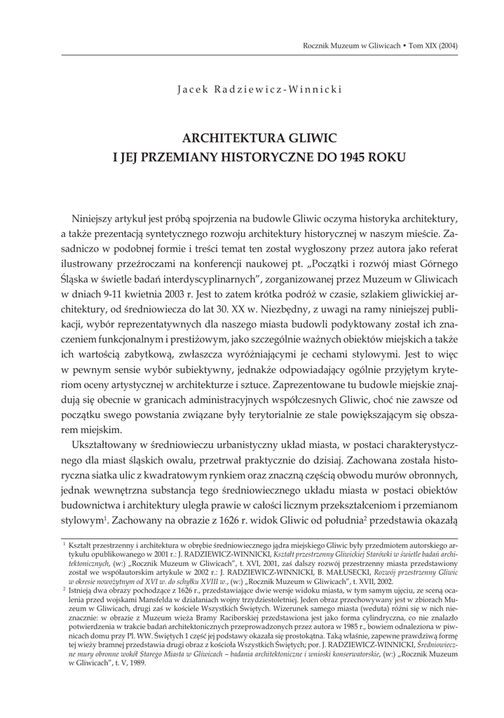 Rocznik Muzeum w Gliwicach • Tom XIX (2004) Jacek Radziewicz-Winnicki ARCHITEKTURA GLIWIC I JEJ PRZEMIANY HISTORYCZNE DO 1945 ROKU Niniejszy artykuł jest próbą spojrzenia na budowle Gliwic oczyma historyka architektury, a także prezentacją syntetycznego rozwoju architektury historycznej w naszym mieście. Zasadniczo w podobnej formie i treści temat ten został wygłoszony przez autora jako referat ilustrowany przeźroczami na konferencji naukowej pt. „Początki i rozwój miast Górnego Śląska w świetle badań interdyscyplinarnych”, zorganizowanej przez Muzeum w Gliwicach w dniach 9-11 kwietnia 2003 r. Jest to zatem krótka podróż w czasie, szlakiem gliwickiej architektury, od średniowiecza do lat 30. XX w. Niezbędny, z uwagi na ramy niniejszej publikacji, wybór reprezentatywnych dla naszego miasta budowli podyktowany został ich znaczeniem funkcjonalnym i prestiżowym, jako szczególnie ważnych obiektów miejskich a także ich wartością zabytkową, zwłaszcza wyróżniającymi je cechami stylowymi. Jest to więc w pewnym sensie wybór subiektywny, jednakże odpowiadający ogólnie przyjętym kryteriom oceny artystycznej w architekturze i sztuce. Zaprezentowane tu budowle miejskie znajdują się obecnie w granicach administracyjnych współczesnych Gliwic, choć nie zawsze od początku swego powstania związane były terytorialnie ze stale powiększającym się obszarem miejskim. Ukształtowany w średniowieczu urbanistyczny układ miasta, w postaci charakterystycznego dla miast śląskich owalu, przetrwał praktycznie do dzisiaj. Zachowana została historyczna siatka ulic z kwadratowym rynkiem oraz znaczną częścią obwodu murów obronnych, jednak wewnętrzna substancja tego średniowiecznego układu miasta w postaci obiektów budownictwa i architektury uległa prawie w całości licznym przekształceniom i przemianom stylowym1. Zachowany na obrazie z 1626 r. widok Gliwic od południa2 przedstawia okazałą 1 2 Kształt przestrzenny i architektura w obrębie średniowiecznego jądra miejskiego Gliwic były przedmiotem autorskiego artykułu opublikowanego w 2001 r.: J. RADZIEWICZ-WINNICKI, Kształt przestrzenny Gliwickiej Starówki w świetle badań architektonicznych, (w:) „Rocznik Muzeum w Gliwicach”, t. XVI, 2001, zaś dalszy rozwój przestrzenny miasta przedstawiony został we współautorskim artykule w 2002 r.: J. RADZIEWICZ-WINNICKI, B. MAŁUSECKI, Rozwój przestrzenny Gliwic w okresie nowożytnym od XVI w. do schyłku XVIII w., (w:) „Rocznik Muzeum w Gliwicach”, t. XVII, 2002. Istnieją dwa obrazy pochodzące z 1626 r., przedstawiające dwie wersje widoku miasta, w tym samym ujęciu, ze sceną ocalenia przed wojskami Mansfelda w działaniach wojny trzydziestoletniej. Jeden obraz przechowywany jest w zbiorach Muzeum w Gliwicach, drugi zaś w kościele Wszystkich Świętych. Wizerunek samego miasta (weduta) różni się w nich nieznacznie: w obrazie z Muzeum wieża Bramy Raciborskiej przedstawiona jest jako forma cylindryczna, co nie znalazło potwierdzenia w trakcie badań architektonicznych przeprowadzonych przez autora w 1985 r., bowiem odnaleziona w piwnicach domu przy Pl. WW. Świętych 1 część jej podstawy okazała się prostokątna. Taką właśnie, zapewne prawdziwą formę tej wieży bramnej przedstawia drugi obraz z kościoła Wszystkich Świętych; por. J. RADZIEWICZ-WINNICKI, Średniowieczne mury obronne wokół Starego Miasta w Gliwicach – badania architektoniczne i wnioski konserwatorskie, (w:) „Rocznik Muzeum w Gliwicach”, t. V, 1989. 244 ARTYKUŁY I ROZPRAWY – HISTORIA 1. Plan Gliwic z 1812 r. (Promnitz) panoramę miasta w obrębie jego średniowiecznych murów obronnych, z gotycką bryłą kościoła farnego pod wezwaniem Wszystkich Świętych, ratuszem i wieżami bram Bytomskiej i Raciborskiej. Wieża kościoła posiada tu jednak późniejszy barokowy hełm, zaś ratusz utrzymany jest już w stylu renesansowym. Ta historyczna weduta nie przetrwała jednak do naszych czasów w takiej jak na obrazie postaci, z powodu licznych kataklizmów, jakim ulegało miasto w swej burzliwej historii. Poddawana była bowiem stopniowym przemianom dziejowym, uzyskawszy ostatecznie kształt obecny, zdecydowanie różniący się od historycznego wizerunku na obrazie z 1626 r. Obecny wizerunek najstarszej części miasta – średniowiecznego jądra, jest jednak w pewnym sensie znamienny dla owych przemian, jakim uległo miasto na przestrzeni niemal czterech stuleci. Kościół Wszystkich Świętych zachował zasadniczo swą gotycką postać budowli halowej, charakterystycznej dla wielu świątyń na Śląsku i to zarówno z zewnątrz jak i we wnętrzu3, został jednak w procesie przemian pozbawiony najpierw gotyckiego a później barokowego hełmu wieży, wyróżniającego go na tle sylwety miasta, zaś jego wnętrze wyposażono w okresie baroku w odpowiadające stylistycznie tej epoce elementy, jak ołtarze, ambona, stalle itp. W porównaniu z panoramą na obrazie z 1626 r. zmieniły się także proporcje jego dachów, w średniowieczu znacznie wyższych niż obecnie. Dawniej w sąsiedztwie kościoła farnego istniały jeszcze szkoła parafialna oraz okalający świątynię cmentarz, lecz obecnie nie pozostały po nich żadne elementy przestrzenne. Pozostałości po cmentarzu wokół kościoła były jednak przedmiotem sondażowych badań archeologicznych, prowadzonych przez pracowników Muzeum w Gliwicach w ciągu kilku 3 J. RADZIEWICZ-WINNICKI, B. MAŁUSECKI, Średniowieczna architektura kościoła parafialnego p.w. Wszystkich Świętych w Gliwicach w świetle badań i materiałów archiwalnych, (w:) „Rocznik Muzeum w Gliwicach”, t. XIV, 1999. Jacek Radziewicz-Winnicki – Architektura Gliwic... 245 ubiegłych lat4. W najbliższym otoczeniu średniowiecznego jeszcze miasta, we wsi Szobiszowice powstał zapewne jeszcze pod koniec XIII w. parafialny kościółek Św. Bartłomieja, usytuowany przy historycznym szlaku do kasztelańskiego 