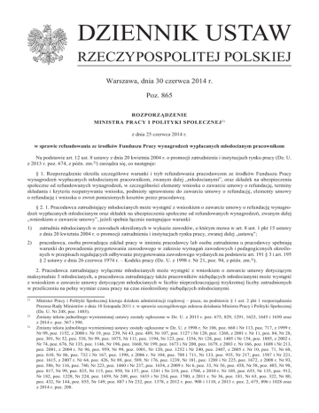 DZIENNIK USTAW RZECZYPOSPOLITEJ POLSKIEJ Warszawa, dnia 30 czerwca 2014 r. Poz. 865 ROZPORZĄDZENIE MINISTRA PRACY I POLITYKI SPOŁECZNEJ 1) z dnia 25 czerwca 2014 r. w sprawie refundowania ze środków Funduszu Pracy wynagrodzeń wypłacanych młodocianym pracownikom Na podstawie art. 12 ust. 8 ustawy z dnia 20 kwietnia 2004 r. o promocji zatrudnienia i instytucjach rynku pracy (Dz. U. z 2013 r. poz. 674, z późn. zm.2)) zarządza się, co następuje: § 1. Rozporządzenie określa szczegółowe warunki i tryb refundowania pracodawcom ze środków Funduszu Pracy wynagrodzeń wypłacanych młodocianym pracownikom, zwanym dalej „młodocianymi”, oraz składek na ubezpieczenia społeczne od refundowanych wynagrodzeń, w szczególności elementy wniosku o zawarcie umowy o refundację, terminy składania i kryteria rozpatrywania wniosku, podmioty uprawnione do zawarcia umowy o refundację, elementy umowy o refundację i wniosku o zwrot poniesionych kosztów przez pracodawcę. § 2. 1. Pracodawca zatrudniający młodocianych może wystąpić z wnioskiem o zawarcie umowy o refundację wynagrodzeń wypłacanych młodocianym oraz składek na ubezpieczenia społeczne od refundowanych wynagrodzeń, zwanym dalej „wnioskiem o zawarcie umowy”, jeżeli spełnia łącznie następujące warunki: 1) zatrudnia młodocianych w zawodach określonych w wykazie zawodów, o którym mowa w art. 8 ust. 1 pkt 15 ustawy z dnia 20 kwietnia 2004 r. o promocji zatrudnienia i instytucjach rynku pracy, zwanej dalej „ustawą”; 2) pracodawca, osoba prowadząca zakład pracy w imieniu pracodawcy lub osoba zatrudniona u pracodawcy spełniają warunki do prowadzenia przygotowania zawodowego w zakresie wymagań zawodowych i pedagogicznych określonych w przepisach regulujących odbywanie przygotowania zawodowego wydanych na podstawie art. 191 § 3 i art. 195 § 2 ustawy z dnia 26 czerwca 1974 r. – Kodeks pracy (Dz. U. z 1998 r. Nr 21, poz. 94, z późn. zm.3)). 2. Pracodawca zatrudniający wyłącznie młodocianych może wystąpić z wnioskiem o zawarcie umowy dotyczącym maksymalnie 3 młodocianych, a pracodawca zatrudniający także pracowników niebędących młodocianymi może wystąpić z wnioskiem o zawarcie umowy dotyczącym młodocianych w liczbie nieprzekraczającej trzykrotnej liczby zatrudnionych w przeliczeniu na pełny wymiar czasu pracy na czas nieokreślony niebędących młodocianymi. 1) 2) 3) Minister Pracy i Polityki Społecznej kieruje działem administracji rządowej – praca, na podstawie § 1 ust. 2 pkt 1 rozporządzenia Prezesa Rady Ministrów z dnia 18 listopada 2011 r. w sprawie szczegółowego zakresu działania Ministra Pracy i Polityki Społecznej (Dz. U. Nr 248, poz. 1485). Zmiany tekstu jednolitego wymienionej ustawy zostały ogłoszone w Dz. U. z 2013 r. poz. 675, 829, 1291, 1623, 1645 i 1650 oraz z 2014 r. poz. 567 i 598. Zmiany tekstu jednolitego wymienionej ustawy zostały ogłoszone w Dz. U. z 1998 r. Nr 106, poz. 668 i Nr 113, poz. 717, z 1999 r. Nr 99, poz. 1152, z 2000 r. Nr 19, poz. 239, Nr 43, poz. 489, Nr 107, poz. 1127 i Nr 120, poz. 1268, z 2001 r. Nr 11, poz. 84, Nr 28, poz. 301, Nr 52, poz. 538, Nr 99, poz. 1075, Nr 111, poz. 1194, Nr 123, poz. 1354, Nr 128, poz. 1405 i Nr 154, poz. 1805, z 2002 r. Nr 74, poz. 676, Nr 135, poz. 1146, Nr 196, poz. 1660, Nr 199, poz. 1673 i Nr 200, poz. 1679, z 2003 r. Nr 166, poz. 1608 i Nr 213, poz. 2081, z 2004 r. Nr 96, poz. 959, Nr 99, poz. 1001, Nr 120, poz. 1252 i Nr 240, poz. 2407, z 2005 r. Nr 10, poz. 71, Nr 68, poz. 610, Nr 86, poz. 732 i Nr 167, poz. 1398, z 2006 r. Nr 104, poz. 708 i 711, Nr 133, poz. 935, Nr 217, poz. 1587 i Nr 221, poz. 1615, z 2007 r. Nr 64, poz. 426, Nr 89, poz. 589, Nr 176, poz. 1239, Nr 181, poz. 1288 i Nr 225, poz. 1672, z 2008 r. Nr 93, poz. 586, Nr 116, poz. 740, Nr 223, poz. 1460 i Nr 237, poz. 1654, z 2009 r. Nr 6, poz. 33, Nr 56, poz. 458, Nr 58, poz. 485, Nr 98, poz. 817, Nr 99, poz. 825, Nr 115, poz. 958, Nr 157, poz. 1241 i Nr 219, poz. 1704, z 2010 r. Nr 105, poz. 655, Nr 135, poz. 912, Nr 182, poz. 1228, Nr 224, poz. 1459, Nr 249, poz. 1655 i Nr 254, poz. 1700, z 2011 r. Nr 36, poz. 181, Nr 63, poz. 322, Nr 80, poz. 432, Nr 144, poz. 855, Nr 149, poz. 887 i Nr 232, poz. 1378, z 2012 r. poz. 908 i 1110, z 2013 r. poz. 2, 675, 896 i 1028 oraz z 2014 r. poz. 208. Dziennik Ustaw – 2 – Poz. 865 § 3. 1. Pracodawca składa wniosek o zawarcie umowy do centrum edukacji i pracy młodzieży, zwanego dalej „centrum edukacji”, właściwego ze względu na miejsce odbywania przez młodocianego przygotowania zawodowego, bezpośrednio albo za pośrednictwem organizacji zrzeszającej pracodawców. 2. Wniosek o zawarcie umowy zawiera: 1) nazwę miejscowości i datę wypełnienia wniosku o zawarcie umowy; 2) nazwę pracodawcy, adres siedziby, miejsce prowadzenia działalności oraz numer konta bankowego, na które będzie przekazywana wypłata refundacji; 3) numer identyfikacji podatkowej NIP; 4) oznaczenie prowadzonej działalności według PKD; 5) formę prawną prowadzonej działalności; 6) nazwę(-wy) dokumentów poświadczających uprawnienia do prowadzenia przygotowania zawodowego młodocianych; 7) wykaz imienny młodocianych, których dotyczy wniosek o zawarcie umowy, obejmujący: a) imię i nazwisko młodocianego, b) numer PESEL młodocianego, c) datę zawarcia umowy o pracę w celu przygotowania zawodowego na czas nieokreślony, w tym czas trwania przygotowania zawodowego, d) nazwę zawodu lub zakres przyuczenia, w których odbywa się przygotowanie zawodowe, e) formę odbywania przygotowania zawodowego (nauka zawodu albo przyuczenie do wykonywania określonej pracy); 8) oświadczenia o: a) liczbie pracowników zatrudnionych w dniu składania wniosku o zawarcie umowy, z uwzględnieniem młodocianych i roku ich nauki, b) liczbie młodocianych, którzy w okresie ostatnich trzech lat przed dniem złożenia wniosku o zawarcie umowy ukończyli przygotowanie zawodowe u tego pracodawcy, c) liczbi