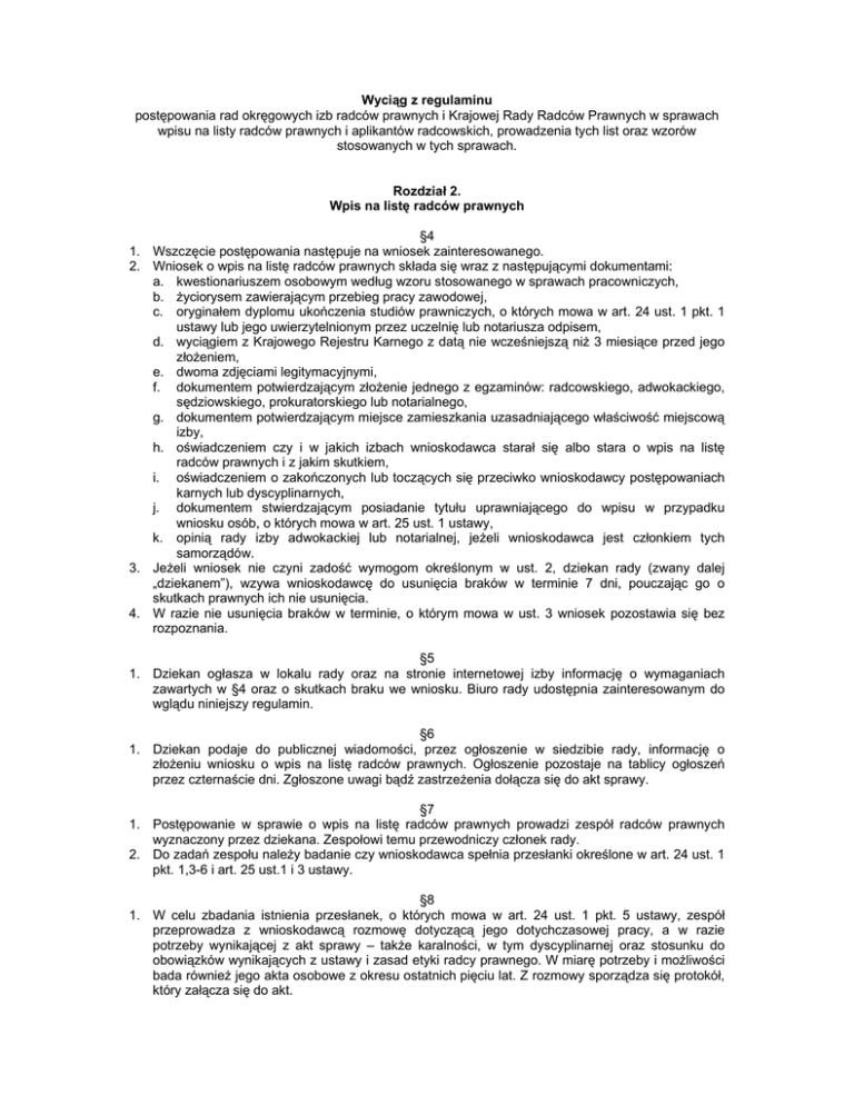 Wyciąg z regulaminu postępowania rad okręgowych izb radców prawnych i Krajowej Rady Radców Prawnych w sprawach wpisu na listy radców prawnych i aplikantów radcowskich, prowadzenia tych list oraz wzorów stosowanych w tych sprawach. Rozdział 2. Wpis na listę radców prawnych §4 1. Wszczęcie postępowania następuje na wniosek zainteresowanego. 2. Wniosek o wpis na listę radców prawnych składa się wraz z następującymi dokumentami: a. kwestionariuszem osobowym według wzoru stosowanego w sprawach pracowniczych, b. życiorysem zawierającym przebieg pracy zawodowej, c. oryginałem dyplomu ukończenia studiów prawniczych, o których mowa w art. 24 ust. 1 pkt. 1 ustawy lub jego uwierzytelnionym przez uczelnię lub notariusza odpisem, d. wyciągiem z Krajowego Rejestru Karnego z datą nie wcześniejszą niż 3 miesiące przed jego złożeniem, e. dwoma zdjęciami legitymacyjnymi, f. dokumentem potwierdzającym złożenie jednego z egzaminów: radcowskiego, adwokackiego, sędziowskiego, prokuratorskiego lub notarialnego, g. dokumentem potwierdzającym miejsce zamieszkania uzasadniającego właściwość miejscową izby, h. oświadczeniem czy i w jakich izbach wnioskodawca starał się albo stara o wpis na listę radców prawnych i z jakim skutkiem, i. oświadczeniem o zakończonych lub toczących się przeciwko wnioskodawcy postępowaniach karnych lub dyscyplinarnych, j. dokumentem stwierdzającym posiadanie tytułu uprawniającego do wpisu w przypadku wniosku osób, o których mowa w art. 25 ust. 1 ustawy, k. opinią rady izby adwokackiej lub notarialnej, jeżeli wnioskodawca jest członkiem tych samorządów. 3. Jeżeli wniosek nie czyni zadość wymogom określonym w ust. 2, dziekan rady (zwany dalej „dziekanem”), wzywa wnioskodawcę do usunięcia braków w terminie 7 dni, pouczając go o skutkach prawnych ich nie usunięcia. 4. W razie nie usunięcia braków w terminie, o którym mowa w ust. 3 wniosek pozostawia się bez rozpoznania. §5 1. Dziekan ogłasza w lokalu rady oraz na stronie internetowej izby informację o wymaganiach zawartych w §4 oraz o skutkach braku we wniosku. Biuro rady udostępnia zainteresowanym do wglądu niniejszy regulamin. §6 1. Dziekan podaje do publicznej wiadomości, przez ogłoszenie w siedzibie rady, informację o złożeniu wniosku o wpis na listę radców prawnych. Ogłoszenie pozostaje na tablicy ogłoszeń przez czternaście dni. Zgłoszone uwagi bądź zastrzeżenia dołącza się do akt sprawy. §7 1. Postępowanie w sprawie o wpis na listę radców prawnych prowadzi zespół radców prawnych wyznaczony przez dziekana. Zespołowi temu przewodniczy członek rady. 2. Do zadań zespołu należy badanie czy wnioskodawca spełnia przesłanki określone w art. 24 ust. 1 pkt. 1,3-6 i art. 25 ust.1 i 3 ustawy. §8 1. W celu zbadania istnienia przesłanek, o których mowa w art. 24 ust. 1 pkt. 5 ustawy, zespół przeprowadza z wnioskodawcą rozmowę dotyczącą jego dotychczasowej pracy, a w razie potrzeby wynikającej z akt sprawy – także karalności, w tym dyscyplinarnej oraz stosunku do obowiązków wynikających z ustawy i zasad etyki radcy prawnego. W miarę potrzeby i możliwości bada również jego akta osobowe z okresu ostatnich pięciu lat. Z rozmowy sporządza się protokół, który załącza się do akt.