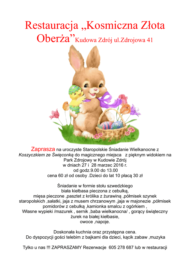 Restauracja „Kosmiczna Złota Oberża”Kudowa Zdrój ul.Zdrojowa 41 Zaprasza na uroczyste Staropolskie Śniadanie Wielkanocne z Koszyczkiem ze Święconką do magicznego miejsca z pięknym widokiem na Park Zdrojowy w Kudowie Zdrój w dniach 27 i 28 marzec 2016 r. od godz.9.00 do 13.00 cena 60 zł od osoby .Dzieci do lat 10 płacą 30 zł Śniadanie w formie stołu szwedzkiego biała kiełbasa pieczona z cebulką, mięsa pieczone ,pasztet z królika z żurawiną ,półmisek szynek staropolskich ,sałatki, jaja z musem chrzanowym ,jaja w majonezie ,półmisek pomidorów z cebulką ,kamionka smalcu z ogórkiem , Własne wypieki /mazurek , sernik ,baba wielkanocna/ , gorący świąteczny żurek na białej kiełbasie, owoce ,napoje. Doskonała kuchnia oraz przystępna cena. Do dyspozycji gości telebim z bajkami dla dzieci, kącik zabaw ,muzyka Tylko u nas !!! ZAPRASZAMY Rezerwacje 605 278 687 lub w restauracji