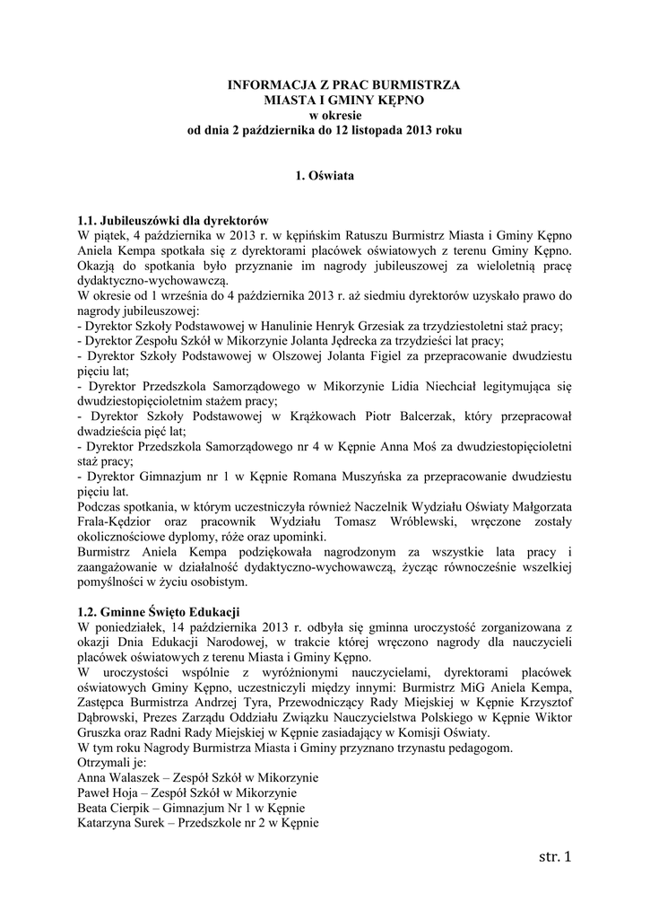 INFORMACJA Z PRAC BURMISTRZA MIASTA I GMINY KĘPNO w okresie od dnia 2 października do 12 listopada 2013 roku 1. Oświata 1.1. Jubileuszówki dla dyrektorów W piątek, 4 października w 2013 r. w kępińskim Ratuszu Burmistrz Miasta i Gminy Kępno Aniela Kempa spotkała się z dyrektorami placówek oświatowych z terenu Gminy Kępno. Okazją do spotkania było przyznanie im nagrody jubileuszowej za wieloletnią pracę dydaktyczno-wychowawczą. W okresie od 1 września do 4 października 2013 r. aż siedmiu dyrektorów uzyskało prawo do nagrody jubileuszowej: - Dyrektor Szkoły Podstawowej w Hanulinie Henryk Grzesiak za trzydziestoletni staż pracy; - Dyrektor Zespołu Szkół w Mikorzynie Jolanta Jędrecka za trzydzieści lat pracy; - Dyrektor Szkoły Podstawowej w Olszowej Jolanta Figiel za przepracowanie dwudziestu pięciu lat; - Dyrektor Przedszkola Samorządowego w Mikorzynie Lidia Niechciał legitymująca się dwudziestopięcioletnim stażem pracy; - Dyrektor Szkoły Podstawowej w Krążkowach Piotr Balcerzak, który przepracował dwadzieścia pięć lat; - Dyrektor Przedszkola Samorządowego nr 4 w Kępnie Anna Moś za dwudziestopięcioletni staż pracy; - Dyrektor Gimnazjum nr 1 w Kępnie Romana Muszyńska za przepracowanie dwudziestu pięciu lat. Podczas spotkania, w którym uczestniczyła również Naczelnik Wydziału Oświaty Małgorzata Frala-Kędzior oraz pracownik Wydziału Tomasz Wróblewski, wręczone zostały okolicznościowe dyplomy, róże oraz upominki. Burmistrz Aniela Kempa podziękowała nagrodzonym za wszystkie lata pracy i zaangażowanie w działalność dydaktyczno-wychowawczą, życząc równocześnie wszelkiej pomyślności w życiu osobistym. 1.2. Gminne Święto Edukacji W poniedziałek, 14 października 2013 r. odbyła się gminna uroczystość zorganizowana z okazji Dnia Edukacji Narodowej, w trakcie której wręczono nagrody dla nauczycieli placówek oświatowych z terenu Miasta i Gminy Kępno. W uroczystości wspólnie z wyróżnionymi nauczycielami, dyrektorami placówek oświatowych Gminy Kępno, uczestniczyli między innymi: Burmistrz MiG Aniela Kempa, Zastępca Burmistrza Andrzej Tyra, Przewodniczący Rady Miejskiej w Kępnie Krzysztof Dąbrowski, Prezes Zarządu Oddziału Związku Nauczycielstwa Polskiego w Kępnie Wiktor Gruszka oraz Radni Rady Miejskiej w Kępnie zasiadający w Komisji Oświaty. W tym roku Nagrody Burmistrza Miasta i Gminy przyznano trzynastu pedagogom. Otrzymali je: Anna Walaszek – Zespół Szkół w Mikorzynie Paweł Hoja – Zespół Szkół w Mikorzynie Beata Cierpik – Gimnazjum Nr 1 w Kępnie Katarzyna Surek – Przedszkole nr 2 w Kępnie str. 1 Barbara Sokołowska – Szkoła Podstawowa Nr 1 w Kępnie Anna Owczarska – Szkoła Podstawowa w Olszowie Alicja Świątek – Szkoła Podstawowa w Świbie Alina Sztermer – Przedszkole nr 5 w Kępnie Agnieszka Ostojska – Przedszkole nr 5 w Kępnie Magdalena Smogur – Szkoła Podstawowa w Kierznie Dagmara Przybyła – Gimnazjum Nr 2 w Kępnie Marta Krymiec – Szkoła Podstawowa nr 3 w Kępnie Aleksandra Pawlus - Szkoła Podstawowa nr 3 w Kępnie Ponadto podczas uroczystości wręczone zostały nagrody z okazji Dnia Edukacji Narodowej dla dyrektorów. Otrzymali je: Jan Rusajczyk – Dyrektor Szkoły Podstawowej nr 3 w Kępnie Henryk Grzesiak – Dyrektor Szkoły Podstawowej w Hanulinie Czesław Semba – Dyrektor Szkoły Podstawowej w Świbie Romana Muszyńska – Dyrektor Gimnazjum nr 1 w Kępnie Anna Moś – Dyrektor Przedszkola nr 4 w Kępnie Barbara Stryjakiewicz – Dyrektor Przedszkola nr 5 w Kępnie Na zakończenie Prezes Oddziału ZNP w Kępnie Wiktor Gruszka wręczył Romanowi Rychlewiczowi odznakę przyznaną przez Zarząd Główny ZNP za 50 lat działalności w tej organizacji. Uroczystość uświetniona została występem artystycznym uczniów Gimnazjum nr 1 im. Polskich Olimpijczyków w Kępnie. 1.3. Programy socjalne dla uczniów W związku z zakończeniem naboru oraz wydaniem decyzji administracyjnych trwa w Wydziale Oświaty rozliczanie pomocy materialnej dla uczniów przyznanej w formie stypendium szkolnego oraz w ramach Programu rządowego „Wyprawka Szkolna 2013”. Na rok szkolny 2013/2014 przyznano 171 stypendiów socjalnych. Natomiast z „wyprawki” w tym roku szkolnym skorzysta 284 uczniów. 1.4. Doradztwo metodyczne dla nauczycieli W ramach dofinansowania form doskonalenia zawodowego nauczycieli w dniu 5 listopada 2013 r. Urząd Miasta i Gminy – Wydział Oświaty zorganizował szkolenie z zakresu doradztwa metodycznego dla nauczycieli wychowania przedszkolnego nt.: „Praca z dziećmi o specjalnych potrzebach edukacyjnych w przedszkolu oraz prowadzenie niezbędnej dokumentacji w tym zakresie”. Szkolenie odbyło się w Przedszkolu Samorządowym Nr 2 w Kępnie. W szkoleniu wzięło udział 28 nauczycieli z przedszkoli samorządowych oraz oddziałów przedszkolnych przy szkołach podstawowych, dla których organem prowadzącym jest Gmina Kępno. str. 2 2. Promocja, Kultura i Sport 2.1. Otwarto Skwer Pocztowy W obecności zaproszonych gości, w tym Starosty Kępińskiego Włodzimierz Mazurkiewicza, radnych Rady Miejskiej i kępińskich regionalistów, w czwartek, 3 października 2013 r. uroczyście otwarto Skwer Pocztowy przy ul. Kościuszki. Zebranych powitał Zdzisław Zakrzewski - Naczelnik Wydziału Promocji, Informacji, Kultury i Sportu a następnie głos zabrała Burmistrz Miasta i Gminy Kępno Aniela Kempa. Pani Burmistrz mówiła o skwerku jako wspaniałym miejscu spotkań dla mieszkańców miasta, dla wypoczynku i relaksu. Informacje techniczne dotyczące inwestycji przedstawił Zastępca Burmistrza Andrzej Tyra. Zakończyła się 30 lipca tego roku i zamknęła się kosztem 312 tys. złotych. O skwerze i jego funkcjonalności oraz znaczeniu dla miasta mówił także Przewodniczący Rady Miejskiej Krzysztof Dąbrowski. Uroczyście wstęgę przecięli Burmistrz Aniela Kempa, Przewodniczący Krzysztof Dąbrowski, Prezes Towarzystwa Miło