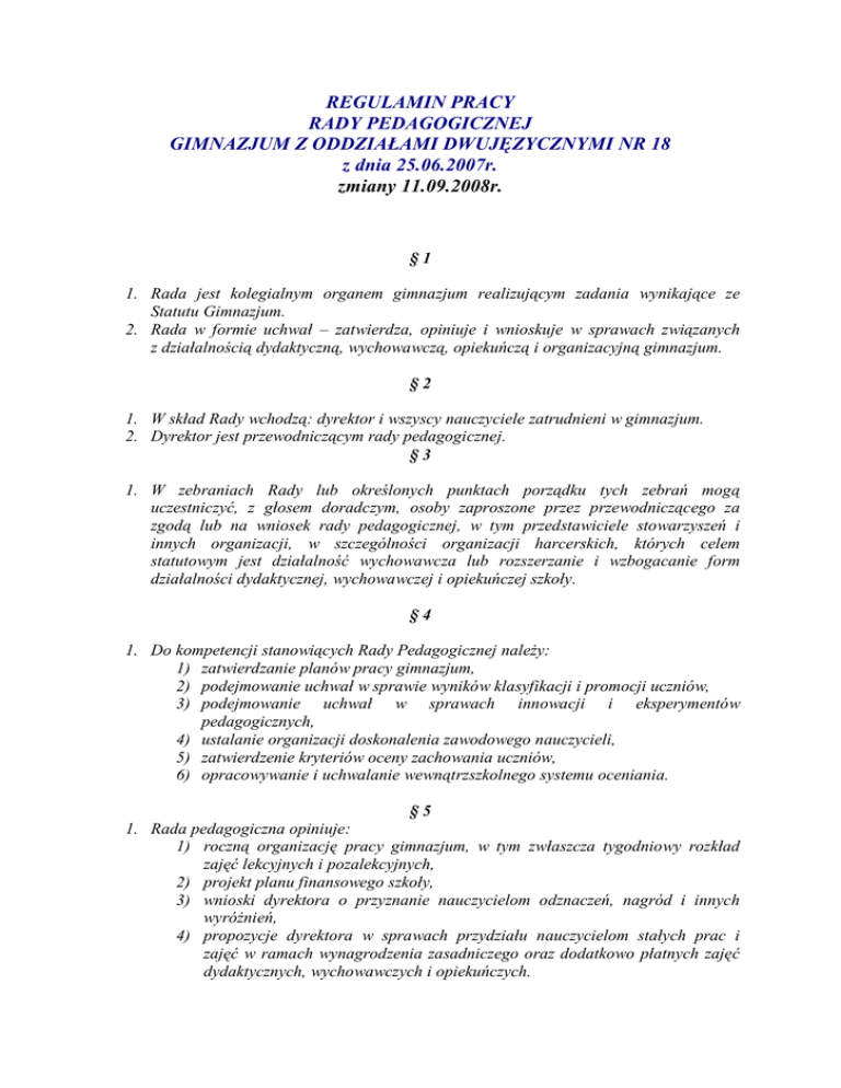 REGULAMIN PRACY RADY PEDAGOGICZNEJ GIMNAZJUM Z ODDZIAŁAMI DWUJĘZYCZNYMI NR 18 z dnia 25.06.2007r. zmiany 11.09.2008r. §1 1. Rada jest kolegialnym organem gimnazjum realizującym zadania wynikające ze Statutu Gimnazjum. 2. Rada w formie uchwał – zatwierdza, opiniuje i wnioskuje w sprawach związanych z działalnością dydaktyczną, wychowawczą, opiekuńczą i organizacyjną gimnazjum. §2 1. W skład Rady wchodzą: dyrektor i wszyscy nauczyciele zatrudnieni w gimnazjum. 2. Dyrektor jest przewodniczącym rady pedagogicznej. §3 1. W zebraniach Rady lub określonych punktach porządku tych zebrań mogą uczestniczyć, z głosem doradczym, osoby zaproszone przez przewodniczącego za zgodą lub na wniosek rady pedagogicznej, w tym przedstawiciele stowarzyszeń i innych organizacji, w szczególności organizacji harcerskich, których celem statutowym jest działalność wychowawcza lub rozszerzanie i wzbogacanie form działalności dydaktycznej, wychowawczej i opiekuńczej szkoły. §4 1. Do kompetencji stanowiących Rady Pedagogicznej należy: 1) zatwierdzanie planów pracy gimnazjum, 2) podejmowanie uchwał w sprawie wyników klasyfikacji i promocji uczniów, 3) podejmowanie uchwał w sprawach innowacji i eksperymentów pedagogicznych, 4) ustalanie organizacji doskonalenia zawodowego nauczycieli, 5) zatwierdzenie kryteriów oceny zachowania uczniów, 6) opracowywanie i uchwalanie wewnątrzszkolnego systemu oceniania. §5 1. Rada pedagogiczna opiniuje: 1) roczną organizację pracy gimnazjum, w tym zwłaszcza tygodniowy rozkład zajęć lekcyjnych i pozalekcyjnych, 2) projekt planu finansowego szkoły, 3) wnioski dyrektora o przyznanie nauczycielom odznaczeń, nagród i innych wyróżnień, 4) propozycje dyrektora w sprawach przydziału nauczycielom stałych prac i zajęć w ramach wynagrodzenia zasadniczego oraz dodatkowo płatnych zajęć dydaktycznych, wychowawczych i opiekuńczych. §6 1. Rada pedagogiczna analizuje wnioski dyrektora gimnazjum wynikające z nadzoru pedagogicznego oraz informacje o działalności gimnazjum nie rzadziej niż dwa razy do roku. §7 1. Rada Pedagogiczna ma prawo wystąpić z wnioskiem do dyrektora w sprawach dotyczących życia gimnazjum, doskonalenia organizacji pracy dydaktycznej, wychowawczej i opiekuńczej. §8 1. Rada Pedagogiczna może wystąpić z wnioskiem do organu prowadzącego o odwołanie nauczyciela ze stanowiska dyrektora lub z innego stanowiska kierowniczego w szkole. §9 1. Rada Pedagogiczna przygotowuje projekt statutu gimnazjum lub jego zmian i uchwala statut po zasięgnięciu opinii samorządu uczniowskiego i rady rodziców. § 10 1. Przewodniczący Rady: 1) przygotowuje i prowadzi zebrania Rady, 2) jest odpowiedzialny za zawiadomienie wszystkich jej członków o terminie i porządku zebrania, 3) nie rzadziej niż dwa razy w roku szkolnym przedstawia ogólne wnioski wynikające ze sprawowania nadzoru pedagogicznego i ogólne informacje o działalności gimnazjum, 4) realizuje uchwały Rady Pedagogicznej podjęte w ramach jej kompetencji stanowiących, 5) zapoznaje Radę z obowiązującymi przepisami prawa szkolnego. § 11 1. Obecność członków na zebraniach Rady jest obowiązkowa. 2. W przypadku ważnych okoliczności przewodniczący może zwolnić członka Rady Pedagogicznej z obecności na posiedzeniu. § 12 1. Członek Rady zobowiązany jest: 1) brać czynny udział w posiedzeniach Rady, 2) przyczyniać się do tworzenia dobrej atmosfery i należytego poziomu obrad, 3) realizować uchwały Rady Pedagogicznej, także wtedy kiedy zgłosił do nich swoje zastrzeżenia, 4) przestrzegać postanowień prawa szkolnego oraz wewnętrznych zarządzeń dyrektora, 5) składać przed Radą sprawozdania z wykonania przydzielonych zadań, 2. Osoby biorące udział w zebraniach rady pedagogicznej są obowiązane do nieujawniania spraw poruszanych na zebraniu rady pedagogicznej, które mogą naruszać dobro osobiste uczniów lub ich rodziców, a także nauczycieli i innych pracowników gimnazjum. § 13 1. Rada realizuje swoje zadania zgodnie z rocznym planem pracy gimnazjum. 2. Rada obraduje na zebraniach plenarnych lub w powołanych komisjach. § 14 1. Zebrania mogą być organizowane na wniosek organu sprawującego nadzór pedagogiczny, z inicjatywy dyrektora gimnazjum, organu prowadzącego lub na pisemny wniosek co najmniej 1/3 członków Rady. § 15 1. Zebrania plenarne Rady Pedagogicznej są organizowane przed rozpoczęciem roku szkolnego, w każdym semestrze w związku z klasyfikowaniem i promowaniem uczniów, po zakończeniu rocznych zajęć dydaktyczno – wychowawczych oraz w miarę bieżących potrzeb. § 16 1. Rada podejmuje uchwały na zebraniach plenarnych. 2. Uchwały są podejmowane w głosowaniu jawnym. W sprawach personalnych, a także na formalny wniosek członków Rady, głosowanie odbywa się w trybie tajnym. 3. Uchwały są podejmowane zwykłą większością głosów w obecności co najmniej połowy członków Rady. W razie równości głosów rozstrzyga głos przewodniczącego. 4. Uchwały Rady numerowane są w sposób ciągły w danym roku szkolnym. 5. Członek Rady ma prawo zgłosić do zaprotokołowania swoje zastrzeżenia dotyczące podjętej uchwały. 6. Uchwały obowiązują wszystkich pracowników. 7. Dyrektor ma prawo zawiesić uchwałę Rady podjętą niezgodnie z obowiązującymi przepisami lub przeciwną dobru gimnazjum. § 17 1. Rada powołuje w zależności od potrzeb stałe lub doraźne komisje. 2. Pracą komisji kieruje przewodniczący powołany przez Radę lub komisję. 3. Komisja informuje Radę o wynikach swojej pracy, formułując wnioski do zatwierdzenia. § 18 1. Z zebrania Rady sporządza się protokół. Protokoły sporządza w terminie 7 dni od daty zebrania wybrany/-i przez Radę na dany rok szkolny protokolant/- ci. 2. Protokół z zebrania Rady, wraz z listą obecności jej członków, podpisuje przewodniczący Rady i protokolant. Lista obecności stanowi załącznik do protokołu. 3. Członkow