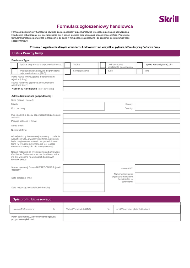 Formularz zgłoszeniowy handlowca Formularz zgłoszeniowy handlowca powinien zostać podpisany przez handlowca lub osobę przez niego upoważnioną. Handlowiec zobowiązany jest do zapoznania się z treścią aplikacji oraz deklaracji będącej jego częścią. Podpisując formularz handlowiec potwierdza jednocześnie, że dane w nim podane są poprawne i że zapoznał się i zrozumiał treść i zasady Umowy. Prosimy o wypełnienie danych w forularzu I odpowiedzi na wszystkie pytania, które dotyczą Państwa firmy Status Prawny firmy Business Type: Spółka z ograniczona odpowiedzialnością Spółka Jednoosobowa działalność gospodarcza Publiczna spółka akcyjna z ograniczona odpowiedzialnością (PLC) Stowarzyszenie Klub spółka komandytowa (LLP) Inne Pełna nazwa firmy (Zgodnie z dokumentami rejestracji firmy): Nazwa handlowa (Zgodnie z dokumentami rejestracji firmy): Numer ID handlowca (n.p.12345678): Adres działalności gospodarczej : Ulica (nazwa I numer): Miasto: County: Kod pocztowy: Country: Imię i nazwisko osobu odpowiedzialnej za kontakt ze Skrill: Pozycja pełniona w firmie: Adres email: Numer telefonu: Adres(y) strony internetowej – prosimy o podanie wszystkich URL, zwiazanych z firma, na ktorych będa przyjmowane płatności za pośrednictwem Skrill (w wypadku gdy strona nie jest jeszcze dostepna uznamy URL do strony testowej) Nazwa widoczna na wyciągu z konta bankowego Cardholder Statement – Nazwa handlowa, która ma być widoczna na wyciągach bankowych klientów sklepu Numer rejestracji firmy – NIP/REGON/KRS (jezeli dostepny) Numer VAT: Numer członkowski organizacji handlowej (jezeli jestes jej członkiem): Data założenia firmy: Data rozpoczęcia działalności (handlu): Opis profilu biznesowego: Internet/E-Commerce: % Pełen opis biznesu, za co dokładnie będą/są przyjmowane płatności: Virtual Terminal (MOTO): % = 100% obrotu z platności kartami Całkowity, aktualny lub przewidywany, obrót firmy w skali roku: PLN Całkowity, aktualny lub przewidywany, obrót firmy z płatności online w skali roku: PLN Przecietna wartość transakcji: PLN Aktualnie używane centrum autoryzacyjne (ang. Acquirer) – jeżeli dotyczy. Aktualnie uzywany system płatności/PSP/platforma sklepowa (n.p. Przelewy24, IAI, magento) Aktualne (lub przewidywane) rozbicie transakcji (do 100%) Lokalne (tylko Polska)% Europa % Inne % Akceptowane metody płatności online (do 100%)* *w wypadku jezeli wczesniej nie otrzymywaliście płatności kartami, prosimy zaznaczyć „inne >>100%” Płatności międzynarodowe Maestro % MasterCard Credit (karta kredytowa MasterCard) % Visa Credit (Karta kredytowa visa) % MasterCard Debit (płatności lokalne) z uwzględnieniem MasterCard Business Debit % % Płatności lokalne UK Maestro % Laser (Irlandia) % Solo % Inne % Visa Debit International (karta visa debetowa – płatności międzynarodowe ), z uzglednieniem Visa Business Debit i Electron Tak Jeżeli biznes jest sesonowy prosimy o sprecyzowanie: Q1 Procent Sprzedaży na kwartał (Q): % Nie Q2 Q3 % % W wypadku gdy akceptowane są depozyty przed dostarczeniem usługi/towaru prosimy o sprecyzowanie* *dotyczy jedynie specyficznych modeli biznesowych Tak Nie wielkosć depozytu wpłacanego przed dostawą (procent od całkowitej sumy transakcji): % Na ile czasu przed dostarczeniem usługi/towaru pobierany jest depozyt: dni W wypadku gdy całość płatności przyjmowana jest przed dostarczeniem usługi/towaru (z góry) prosimy o sprecyzowanie: tak Nie dni Czas dostawy towaru:: Jeżeli usługi/towary na stronie, za ktore przyjmowane a płatnosci z góry prosimy o spracyzowanie: Rodzaj usług/towaru: Rodzaj usług/towaru: Rodzaj usług/towaru: Rodzaj usług/towaru: Procent płatnosci kartami: Procent płatnosci kartami: Procent płatnosci kartami: Procent płatnosci kartami: % % % % Czas dodtawy: Czas dodtawy: Czas dodtawy: Czas dodtawy: dni dni dni dni Q4 % GWARANCJE Tak Czy pobierasz opłaty za dodatkowe gwarancje i/lub przedłużenie okresu gwarancyjnego? Średni okres trwania gwarancji, za które pobuerane sa opłaty : Nie Miesięcy/tygodni Procent usług/towaru zwróconego w okresie gwarancyjnym : % Jaka jest polityka zwrotów sklepu? Suskrypcje Tak Czy pobierasz lub planujesz pobierać opłaty za subskrypcje lub opłaty czlonkowckie przy pomocy kart? : Nie Sprecyzuj wszystkie dostepne na stronie opcje subskrypcji, za ktore pobierane sa/będa opłaty kartami: Procentowy udział płatnosci kartami w pobieraniu opłat za subskrypcje/członkostwo: % Czas trwania subskrypcji/członkostwa oraz procentowy udział płatności kartami: miesięcy % płatności kartami miesięcy % płatności kartami miesięcy Czy płatności za subskrybcje pobierane sa autamatycznie (automatycznie okresowo są odnawiany I pobierane z karty klienta): Yes %płatności kartami No Jezeli tak klient musi potwierdzić, że zgadza się na automatyczne pobieranie okresowych płatności z jego karty. Dodatkowe informacje adresowe (jeżeli Ciebie dotyczą) Jezeli Twoja firma jest zależna od innej firmy (spółka zależna), prosimy podac jej dane: Nazwa firmy: Numer rejestracji firmy (NIP/REGON/KRS): Dane adresowe firmy partnerskiej: Ulica: Miasto: Województwo: Kod pocztowy/Kraj: Dane zarządu firmy W zalezności od formy legalnej firmy następujacy członkowie zarządu powinni wypełnić ponizsze dane: • • • • Jednoosobawa dzialalnośc gospodarcza – właściciel firmy. Spółka – wszyscy wspólnicy; Spółka akcyjna – dwoje dyrektorów lub dyrektor (prezes) oraz kekretarz firmy. Spółka z ograniczana odpowiedzialnoscią – dwoje czlonków zarządu. Jezeli dyrektor nie jest osobą fizyczną prosimy o podanie danych na osobnym formularzu. Details must be provided for each Principal so requested who signs this Application. Pan Pani Imię: Nazwisko: Data urodzenia: Narodowość: Adres zamieszkania: Pozycja zajmowana w firmie: Okres zatrudnienia w firmie: Numer paszportu: Lata: Miesiące: Pan Pani Imię: Nazw