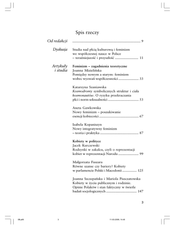 Spis rzeczy Od redakcji ........................................................................ 9 Dyskusja Studia nad p³ci¹ kulturow¹ i feminizm we wspó³czesnej nauce w Polsce teraniejszoæ i przysz³oæ ........................ 11 Artyku³y i studia Feminizm zagadnienia teoretyczne Joanna Mizieliñska Pomiêdzy nowym a starym: feminizm wobec wyzwañ wspó³czesnoci ..................... 33 Katarzyna Szaniawska Kosmodromy symbolicznych struktur i cia³a kosmonautów. O ryzyku przekraczania p³ci i norm seksualnoci ................................ 53 Aneta Gawkowska Nowy feminizm poszukiwanie esencji kobiecoci ......................................... 67 Izabela Kopaniszyn Nowy integratywny feminizm teoria i praktyka ........................................ 87 Kobiety w polityce Jacek Kurczewski Rodzynki w zakalcu, czyli o reprezentacji kobiet w reprezentacji Narodu ..................... 99 Ma³gorzata Fuszara Równe szanse czy bariery? Kobiety w parlamencie Polski i Macedonii ............... 125 Joanna Szczepañska i Mariola Piszczatowska Kobiety w ¿yciu publicznym i rodzinie. Opinie Polaków i stan faktyczny w wietle badañ socjologicznych ................................ 147 3 0B.p65 3 11-03-2009, 14:45 Kobiety i praca zawodowa Jolanta Arcimowicz Kobiety w s³u¿bie pañstwa rzecz o korpusie s³u¿by cywilnej w Polsce ............ 165 Agnieszka Majcher Szklany sufit w nauce? P³eæ a trajektorie karier akademickich ..................................... 183 Jerzy Kuniewski Praca i rodzina w opiniach i przemyleniach kobiet z Kaszub .............. 199 Medialne wizerunki kobiet Natalia Krzy¿anowska Medialny obraz (nie)obecnoci kobiet w sferze publicznej analiza relacji prasowych powiêconych tak zwanej seksaferze w Samoobronie RP ..................................... 217 Marta Juza Tradycyjny etos czy refleksyjny projekt to¿samoci? Obrazy ról spo³ecznych kobiet w serialach telewizyjnych i w dyskusjach internetowych ..................... 233 Ma³gorzata Bogunia-Borowska Magda M., czyli singielka w wielkim miecie medialny obraz stylu ¿ycia pokolenia trzydziestolatków ....................... 249 Beata £aciak Medialny obraz kobiet zajmuj¹cych kierownicze stanowiska .............................. 267 Z warsztatów badawczych Ma³gorzata Awdziejczyk Kobiety na rynku pracy. W kierunku równego traktowania ................................. 283 4 0B.p65 4 11-03-2009, 14:45 Ewa Stroiñska Telepraca szans¹ na aktywizacjê zawodow¹ kobiet ......................................... 299 Dominika Karasek Wizerunek kobiet ¿o³nierzy w prasie regionalnej i ogólnopolskiej ......................... 313 Recenzje i polemiki Helena Chmielewska-Szlajfer Anthony Giddens: Przemiany intymnoci... 327 Marta Trêbaczewska Anna Czekanowska, Kultury tradycyjne wobec wspó³czesnoci. Muzyka, poezja, taniec ............................................ 331 Henryk Klawe, Weronika Pawilno-Pacewicz Nowi mê¿czyni? Zmieniaj¹ce siê modele mêskoci we wspó³czesnej Polsce, pod red. M. Fuszary .................................... 339 Zofia Zaleska The emergence of memory. Conversations with W.G. Sebald, pod red. Lynne Sharon Schwartz ....... 345 Wspomnienia, po¿egnania Ma³gorzata Melchior Wspomnienie o Joannie Wiszniewicz ......... 353 Informacje bie¿¹ce i sprawozdania z konferencji Aneta Gawkowska Seminarium Kobieta 21 .......................... 357 Anna Wróbel Sympozjum Nowa Agora w Sejnach ....... 359 Magdalena Kiciñska Kobiety zdoby³y Sejm! Sprawozdanie z obchodów 90. rocznicy uzyskania przez kobiety praw wyborczych ................. 363 Nasi Autorzy ....................................................................... 367 5 0B.p65 5 11-03-2009, 14:45 Contents Editorial ............................................................................... 9 Discussion Gender Studies and Feminism in Contemporary Science in Poland: Present and Future .......... 11 Articles and Studies Feminism Theoretical Problems Joanna Mizieliñska Between the New and the Old. Feminism and the Challenge of the Present .................. 33 Katarzyna Szaniawska Cosmodromes of Symbolic Structures and Bodies of Cosmonauts. On the Risk on Transgressing Gender and the Norms of Sexuality ................................. 53 Aneta Gawkowska New Feminism. In Search of the Essence of Femininity ................................................. 67 Izabela Kopaniszyn New Integrative Feminism. Theory and Practice .... 87 Women in Politics Jacek Kurczewski Raisins in the Dough. On the Representation of Women within the Representation of the People .................................................. 99 Ma³gorzata Fuszara Equal Chances or Barriers? Women in the Parliaments of Poland and Macedonia ....... 125 Joanna Szczepañska i Mariola Piszczatowska Women in Public and Family Life. Poles Opinions vs Reality in the Light of Sociological Research .............. 147 6 0B.p65 6 11-03-2009, 14:45 Women and Professional Careers Jolanta Arcimowicz Women in the Service of the State. About the Civil Service Corps in Poland ........... 165 Agnieszka Majcher Glass Ceiling in Science? Gender and the Trajectories of Academic Careers ....... 183 Jerzy Kuniewski Career and Family in the Opinions and Reflections of Women from the Kaszuby Region ................................ 199 Media Images of Women Natalia Krzy¿anowska Media Image of Womens (Non)Existence in the Public Sphere. Analysis of Press Accounts of the Sex Scandal in Samoobrona RP (Self-Defence Party of the Republic of Poland) ....................... 217 Marta Juza Traditional Ethos or Reflective Identity Project? Images of Womens Social Roles in TV Series and Internet Debates ........... 233 Ma³gorzata Bogunia-Borowska Magda M., or a singles big city life. Media image of the thirty-somethings lifestyle .................................................... 249 Beata £aciak Media Image of Women in Executive Positions ................................................. 267 Ongoing Resea