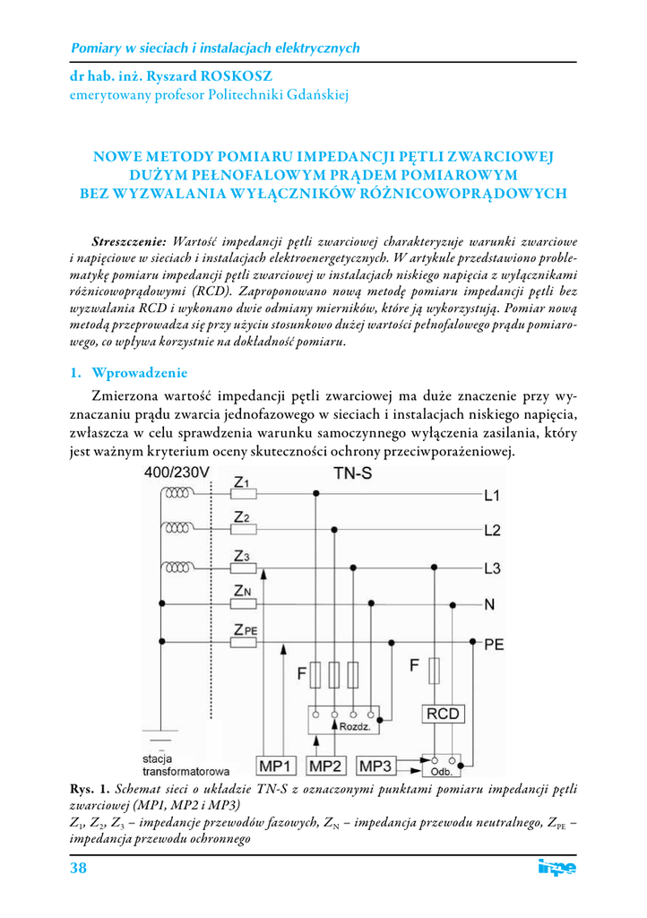 Pomiary w sieciach i instalacjach elektrycznych dr hab. inż. Ryszard Roskosz emerytowany profesor Politechniki Gdańskiej Nowe metody pomiaru impedancji pętli zwarciowej dużym pełnofalowym prądem pomiarowym bez wyzwalania wyłączników różnicowoprądowych Streszczenie: Wartość impedancji pętli zwarciowej charakteryzuje warunki zwarciowe i napięciowe w sieciach i instalacjach elektroenergetycznych. W artykule przedstawiono problematykę pomiaru impedancji pętli zwarciowej w instalacjach niskiego napięcia z wyłącznikami różnicowoprądowymi (RCD). Zaproponowano nową metodę pomiaru impedancji pętli bez wyzwalania RCD i wykonano dwie odmiany mierników, które ją wykorzystują. Pomiar nową metodą przeprowadza się przy użyciu stosunkowo dużej wartości pełnofalowego prądu pomiarowego, co wpływa korzystnie na dokładność pomiaru. 1. Wprowadzenie Zmierzona wartość impedancji pętli zwarciowej ma duże znaczenie przy wyznaczaniu prądu zwarcia jednofazowego w sieciach i instalacjach niskiego napięcia, zwłaszcza w celu sprawdzenia warunku samoczynnego wyłączenia zasilania, który jest ważnym kryterium oceny skuteczności ochrony przeciwporażeniowej. Rys. 1. Schemat sieci o układzie TN-S z oznaczonymi punktami pomiaru impedancji pętli zwarciowej (MP1, MP2 i MP3) Z1 , Z2 , Z3 – impedancje przewodów fazowych, Z N – impedancja przewodu neutralnego, Z PE – impedancja przewodu ochronnego 38 Pomiary w sieciach i instalacjach elektrycznych Dla celów ochrony przy uszkodzeniu w sieciach typu TN oraz TT przez samoczynne wyłączenie zasilania norma [1] wymaga, aby spodziewany prąd zwarciowy Iz osiągał co najmniej wartość prądu wyłączającego Ia poprzedzającego zabezpieczenia. Wartość prądu Ia wynika z charakterystyki czasowo-prądowej zabezpieczenia. Wyłączenie zwarcia w wymaganym czasie nastąpi wówczas, gdy prąd zwarciowy Iz = U/Z ≥ Ia , a więc gdy impedancja pętli zwarciowej spełnia warunek: Z ≤ U/Ia . W praktyce prąd Iz wyznacza się na podstawie pomiaru impedancji Z [2]. Na rysunku 1 przedstawiony jest schemat sieci badanej z oznaczonymi punktami pomiaru MP1, MP2 i MP3. Wynik pomiaru impedancji pętli zwarciowej w tych punktach może być różny zarówno co do modułu, jak i argumentu. Przykładowo w punkcie MP1, na wyjściu ze stacji transformatorowej, impedancja Z wynosi od kilku miliomów do jednego oma, przy X/R > 1 i do pomiaru impedancji pętli w tym miejscu potrzebne są mierniki o dużym pełnofalowym prądzie pomiarowym. Natomiast w punkcie MP3, w obwodzie za wyłącznikiem RCD, gdzie impedancja Z = 0,3…3 Ω, do pomiaru impedancji stosowane są często mierniki wykorzystujące skrajnie mały prąd pomiarowy, np. 15 mA. Pomiar impedancji w tym miejscu przy użyciu pełnofalowego kilkuokresowego prądu pomiarowego o dużej wartości grozi zbędnym wyzwalaniem wyłącznika RCD. 2. Podstawy teoretyczne metod pomiaru impedancji pętli zwarciowej Stosowane powszechnie metody i przyrządy do pomiaru impedancji pętli zwarciowej Z = R + jX [3, 4, 5, 6, 7, 8], opierają się na zasadzie tzw. sztucznego zwarcia, w której impedancję pętli wyznacza się pośrednio na podstawie pomiaru spadku napięcia przy przepływie prądu pomiarowego. Zasadę pomiaru przedstawiono na rysunku 2. Rysunek 2a pokazuje schemat zastępczy obwodu badanego, natomiast rysunki 2b i 2c przedstawiają odpowiednio wykres fazorowy i przebiegi napięć. W miejscu pomiaru wyznacza się dwie wartości napięcia: E – przy otwartym łączniku W oraz U – przy zamkniętym łączniku. Zamknięcie łącznika W, na przeciąg dwóch okresów napięcia sieci, powoduje włączenie obciążenia pomiarowego Z 0 i przepływ krótkotrwałego prądu pomiarowego I0 . Mierzoną impedancję Z ściśle określa zależność zespolona: Z =Z 0 ( ( E − U (1) E =Z 0 −1 U U Dokładne wyznaczenie impedancji pętli na podstawie zależności (1) wymaga spełnienia następujących warunków: 1) badany obwód jest liniowy, 2) napięcie źródłowe E jest sinusoidalne i jest mierzone w obwodzie nieobciążonym prądem pomiarowym, 3)napięcie U w obwodzie obciążonym jest mierzone po zaniku przebiegów przejściowych, 4) miernik umożliwia pomiar geometrycznej różnicy napięć (E – U). Nr 172-173 39 Pomiary w sieciach i instalacjach elektrycznych Rys. 2. Pomiar impedancji pętli zwarciowej w układzie TN: a) schemat zastępczy obwodu badanego, b) wykres fazorowy napięć i prądu, c) przebiegi czasowe napięć Oczekuje się również, aby prąd pomiarowy miał wystarczająco dużą wartość. Ma to na celu wykrycie wadliwych połączeń, przybliżenie warunków pomiaru do rzeczywistych warunków zwarcia oraz zwiększenie dokładności pomiaru. W praktyce spełnienie powyższych wymagań natrafia na poważne trudności i dlatego klasyczne metody pomiaru impedancji pętli Z p wykorzystują zależność przybliżoną: Zp = Z 0 E −U E = Z 0 − 1 , U U (2) otrzymaną przez zastąpienie fazorów napięcia (E, U) ich modułami (E, U), co ułatwia konstrukcję mierników. Wartość względnego błędu pomiaru impedancji jest określona wzorem: 40 Pomiary w sieciach i instalacjach elektrycznych Zp− Z δ Z p = (3) Z gdzie: Z – rzeczywista wartość modułu impedancji, Z p – zmierzona wartość modułu impedancji. Na błąd pomiaru impedancji pętli zwarciowej δZ p największy wpływ mają czynniki związane z pomiarem napięć, a przede wszystkim: • niezgodność argumentu impedancji pętli Z z argumentem obciążenia pomiarowego Z 0 , • odchylenia, wahania i odkształcenie napięcia sieciowego, • obciążenie robocze sieci występujące w pobliżu miejsca pomiaru, • stany przejściowe napięcia wywołane włączeniem i wyłączeniem obciążenia pomiarowego, • zależność rezystancji pętli od wartości prądu pomiarowego. Opisy przyrządów do pomiaru impedancji pętli zwarciowej, przedstawione w literaturze, charakteryzują się różnorodnością rozwiązań uk