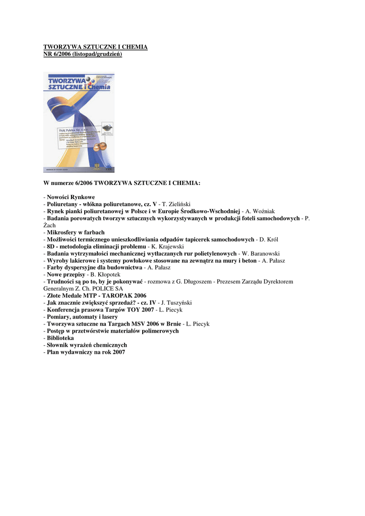 W numerze 6/2006 TWORZYWA SZTUCZNE I