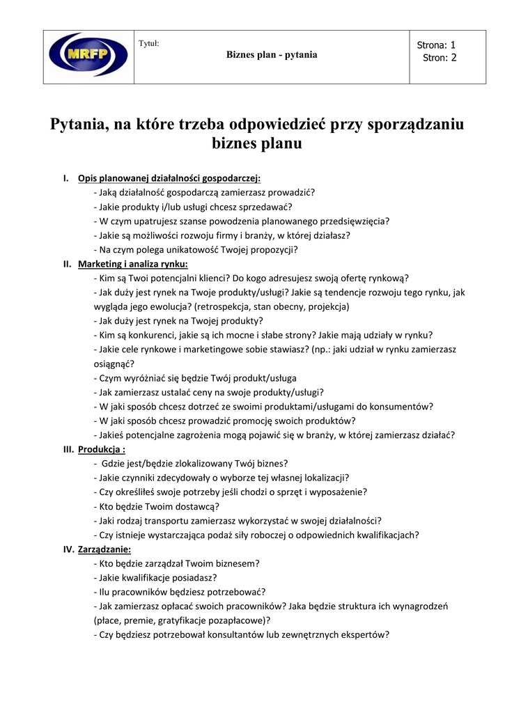 Tytuł: Biznes plan - pytania Strona: 1 Stron: 2 Pytania, na które trzeba odpowiedzieć przy sporządzaniu biznes planu I. Opis planowanej działalności gospodarczej: - Jaką działalność gospodarczą zamierzasz prowadzić? - Jakie produkty i/lub usługi chcesz sprzedawać? - W czym upatrujesz szanse powodzenia planowanego przedsięwzięcia? - Jakie są możliwości rozwoju firmy i branży, w której działasz? - Na czym polega unikatowość Twojej propozycji? II. Marketing i analiza rynku: - Kim są Twoi potencjalni klienci? Do kogo adresujesz swoją ofertę rynkową? - Jak duży jest rynek na Twoje produkty/usługi? Jakie są tendencje rozwoju tego rynku, jak wygląda jego ewolucja? (retrospekcja, stan obecny, projekcja) - Jak duży jest rynek na Twojej produkty? - Kim są konkurenci, jakie są ich mocne i słabe strony? Jakie mają udziały w rynku? - Jakie cele rynkowe i marketingowe sobie stawiasz? (np.: jaki udział w rynku zamierzasz osiągnąć? - Czym wyróżniać się będzie Twój produkt/usługa - Jak zamierzasz ustalać ceny na swoje produkty/usługi? - W jaki sposób chcesz dotrzeć ze swoimi produktami/usługami do konsumentów? - W jaki sposób chcesz prowadzić promocję swoich produktów? - Jakieś potencjalne zagrożenia mogą pojawić się w branży, w której zamierzasz działać? III. Produkcja : - Gdzie jest/będzie zlokalizowany Twój biznes? - Jakie czynniki zdecydowały o wyborze tej własnej lokalizacji? - Czy określiłeś swoje potrzeby jeśli chodzi o sprzęt i wyposażenie? - Kto będzie Twoim dostawcą? - Jaki rodzaj transportu zamierzasz wykorzystać w swojej działalności? - Czy istnieje wystarczająca podaż siły roboczej o odpowiednich kwalifikacjach? IV. Zarządzanie: - Kto będzie zarządzał Twoim biznesem? - Jakie kwalifikacje posiadasz? - Ilu pracowników będziesz potrzebować? - Jak zamierzasz opłacać swoich pracowników? Jaka będzie struktura ich wynagrodzeń (płace, premie, gratyfikacje pozapłacowe)? - Czy będziesz potrzebował konsultantów lub zewnętrznych ekspertów? Tytuł: Biznes plan - pytania Strona: 2 Stron: 2 - Jaką wybierzesz formę prawną dla prowadzenia swojej działalności? Dlaczego właśnie taką, a nie inną? - Czy będziesz potrzebował licencji i pozwoleń na prowadzenie swojej działalności? V. Ocena ryzyka: - Jakie dostrzegasz problemy i przeszkody w planowanej działalności? - W czym leży ryzyko podejmowanej działalności? - Czy masz przygotowany plan działania w przypadku zauważalnych oznak niepowodzenia Twojego biznesu? - Jak oceniłbyś szanse powodzenia Twojego przedsięwzięcia? VI. Finanse: - Jaki będzie Twój dochód w pierwszym roku działalności? Jak będzie on wyglądał w rozbiciu miesięcznym i kwartalnym? - Jakie poniesiesz koszty, aby uruchomić rozwinąć swój biznes? - Jak będą wyglądały przepływy pieniężne w pierwszym roku działalności w rozbiciu na poszczególne miesiące? - Kiedy nastąpi moment, w którym poniesione koszty zrównają się z dochodami (breakeven point)? - Jaki poziom sprzedaży jest niezbędny, aby osiągnąć założony zysk? - Jakie będą Twoje aktywa i zobowiązania w momencie rozpoczynania działalności? - Jakie będę Twoje całkowite potrzeby finansowe? - Jakie będą Twoje źródła finansowania? - Jak zamierzasz wykorzystać pieniądze od pożyczkodawców lub inwestorów? - Jakie będzie zabezpieczenie Twoich pożyczek? VII. Harmonogram: - W jakim czasie chcesz zrealizować swoje przedsięwzięcie? - Czy ustaliłeś terminy osiągania celów cząstkowych? - Czy osiągniecie celów chronologicznie późniejszych jest uwarunkowane realizacją celów wcześniejszych? VIII. Załączniki: - Czy załączyłeś do planu biznesowego dokumenty, analizy, wyniki badań, umowy i inne materiały, które wspierają Twoją argumentację? - Czy możesz wskazać osoby lub instytucje, które mogą udzielić rekomendacji Twojej firmie?