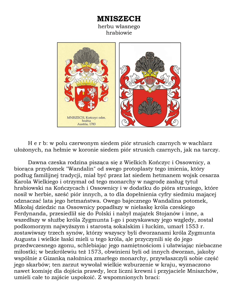 MNISZECH herbu własnego hrabiowie H e r b: w polu czerwonym siedem piór strusich czarnych w wachlarz ułożonych, na hełmie w koronie siedem piór strusich czarnych, jak na tarczy. Dawna czeska rodzina pisząca się z Wielkich Kończyc i Ossownicy, a biorąca przydomek "Wandalin" od swego protoplasty tego imienia, który podług familijnej tradycji, miał być przez lat siedem hetmanem wojsk cesarza Karola Wielkiego i otrzymał od tego monarchy w nagrodę zasług tytuł hrabiowski na Kończycach i Ossownicy i w dodatku do pióra strusiego, które nosił w herbie, sześć piór innych, a to dla dopełnienia cyfry siedmiu mającej odznaczać lata jego hetmaństwa. Owego bajecznego Wandalina potomek, Mikołaj dziedzic na Ossownicy popadłszy w niełaskę króla czeskiego Ferdynanda, przesiedlił się do Polski i nabył majątek Stojanów i inne, a wszedłszy w służbę króla Zygmunta I-go i pozyskawszy jego względy, został podkomorzym najwyższym i starostą sokalskim i łuckim, umarł 1553 r. zostawiwszy trzech synów, którzy wszyscy byli dworzanami króla Zygmunta Augusta i wielkie łaski mieli u tego króla, ąle przyczynili się do jego przedwczesnego zgonu, schlebiając jego namiętnościom i ułatwiając niebaczne miłostki; w bezkrólewiu też 1573, obwinieni byli od innych dworzan, jakoby wspólnie z Gizanką nałożnicą zmarłego monarchy, przywłaszczyli sobie część jego skarbów; ten zarzut wywołał wielkie wzburzenie w kraju, wyznaczono nawet komisję dla dojścia prawdy, lecz liczni krewni i przyjaciele Mniszchów, umieli całe to zajście uspokoić. Z wspomnionych braci: l) Jan starosta krasnystawski, z żony Jadwigi Firley wojewodzianki krakowskiej, zostawił dwóch synów bezpotomnych. 2) Mikołaj starosta lwowski, główny ulubieniec i powiernik Zygmunta Augusta, zdolny i naukowo niepospolicie wykształcony, lecz niepopularny między szlachtą dla stosunków z Gizanką i dumy, z żony Zofii Działyńskiej kasztelanki dobrzyńskiej zostawił potomstwo zgasłe w drugim pokoleniu. 3) Jerzy wojewoda sandomierski 1590, † 1613, obałamucony zręczną intrygą, której celem było osadzenie na tronie moskiewskim Samozwańca Dymitra, i skuszony nadzieją udzielnego księstwa smoleńskiego dla siebie i swojej rodziny, oddał w małżeństwo temu Samozwańcowi swoją córkę Marynę i pozyskał dla niego poparcie króla Zygmunta III i wielu z możnych panów polskich, jakoż w samej rzeczy Dymitr opanował tron carski, lecz w kilka dni po uroczystych zaślubinach i koronacji Maryny 1606 r. stracił życie w buncie, na którego czele stanęli Szuyscy, a Maryna wraz z ojcem uwieziona została, uwolniona w 1608r. w skutek silnej interwencji króla Zygmunta III, połączyła się z drugim Samozwańcem Dymitrem i rozwinęła niepospolitą działalność i energię w dobijaniu się o tron moskiewski; po zabiciu drugiego męża, niepowściągniona w ambicji, przyjąwszy opiekę a podobno i zaślubiwszy Zaruckiego hetmana kozaków dońskich, zakłócała przez lat kilka państwo moskiewskie, lecz w 1614 Zarucki rozbity na głowę i schwytany został wbity na pal, a Maryna wraz z synem Dymitrem (urodzonym w związku z Zaruckim) utopiona w przerembli w Wołdze; prócz tego Dymitra miała podobno więcej jeszcze dzieci, i w lat blisko trzydzieści po jej zgonie, niejaki Jan Łuba szlachcic podlaski twierdząc że jest jej i Dymitra I Samozwańca synem, brał tytuł carewiecza a nawet cara, lecz te jego pretensje na żądanie cara Michała Romanowa, powściągnął król Władysław IV osobną konstytucją sejmową. Z żony Jadwigi Tarło chorążanki sandomierskiej, najmajętniejszej z panien polskich owego czasu, zostawił wojewoda Jerzy pięciu synów i tyleż córek, z synów czterech zeszło bezpotomnie ze świata, a piąty Franciszek-Bernard kasztelan sandecki 1638, poprzednio dworzanin królów Zygmunta III i Władysława IV, królowi Janowi Kazimierzowi stale wierny, odrzucił świetne propozycje honorów i majątku księcia siedmiogrodzkiego Rakoczego, chcącego przeciągnąć go na swoją stronę, umarł 1661 r., zostawiwszy z żony Barbary Stadnickiej dwie córki i trzech synów; z córek Urszula zaślubiła ks. Konstantego Wiśniowieckiego wojewodę bełzkiego a Franciszka, Bonawenturę Bełzeckiego; z synów dwóch zmarło bezdzietnie, najstarszy zaś Jerzy wojewoda wołyński † 1693, ożeniony z Anną Chodkiewicz kasztelanką wileńską, miał z niej dwie córki (starszą za Samuelem ks. Czartoryskim, młodszą za Stefanem Leszczyńskim wojewodą bełzkim) i czterech synów, z których trzech znowu, jak w innych pokoleniach, bezpotomnych, a czwarty Józef marszałek wielki koronny 1714, a kasztelan krakowski w 1742, stronnik dworu saskiego, um. 1744, miał dwie żony Eleonorę Ogińską miecznikównę litewską i Konstancję Tarło wojewodziankę lubelską, z pierwszej żony były córki Teresa 1° v. Stadnicka, 2° v. za Józefem ks. Lubomirskim wojewodą czerniechowskim i Anna zakonnica Benedyktynka, z drugiej żony córki Elżbieta hr. Wielopolska koniuszyna koronna i Ludwika za Józefem Potockim kasztelanem krakowskim, hetmanem wielkim koronnym i dwóch synów: 1) Jerzy-August marszałek nadworny koronny 1742, a kasztelan krakowski 1773, zaślubiwszy Marię-Amelię hr. Brühl córkę ulubieńca i wszechwładnego ministra króla Augusta III, wspólnie z teściem przez lat kilkanaście zarządzał rzeczpospolitą, ale nie mając ani odpowiednich zdolności i energii, ani sił stosownych, nie mógł powściągnąć ni dumnej oligarchii, ni burzliwej szlachty, a zmuszony do prowadzenia słabej i samolubnej polityki teścia, wiele przyłozył się do następnych klęsk kraju i jego upadku, umarł 1778 r., zostawiwszy jedynaczkę córkę Józefę Amelię, żonę słynnego Szczęsnego Potockiego wojewody ruskiego, zmarłą 1798 r. 2) Jan- Karol drugi syn kasztelana krakowskiego Józefa jenerał-leitnant i podkomorzy wielki koronny, poseł do Turcji 1755, umarł 1759, 