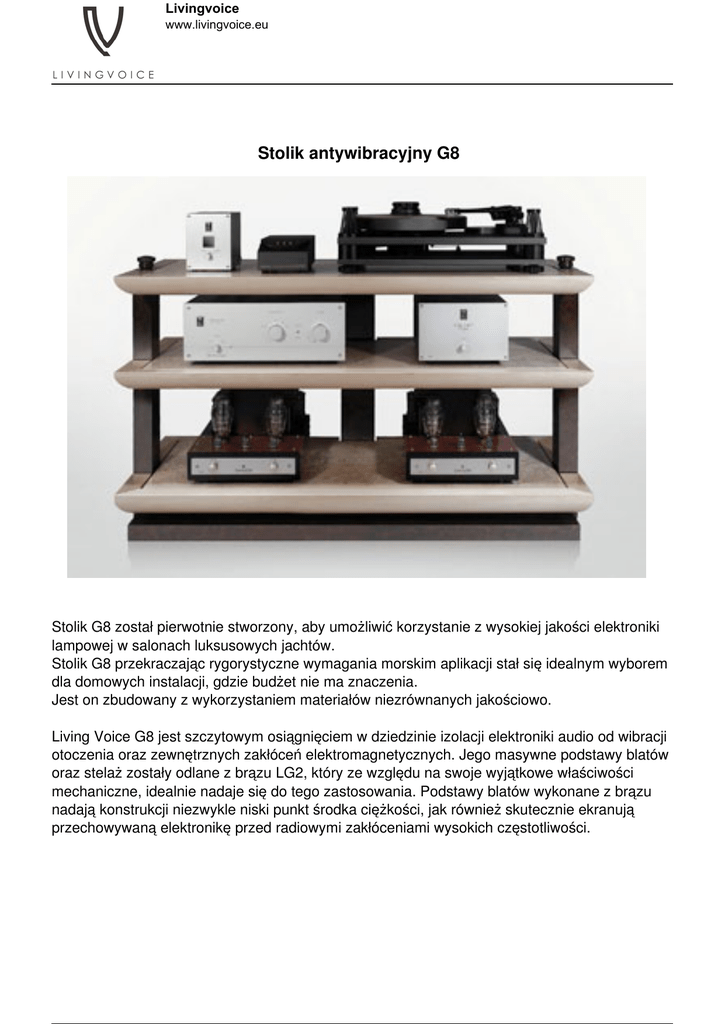 Livingvoice www.livingvoice.eu Stolik antywibracyjny G8 Stolik G8 został pierwotnie stworzony, aby umożliwić korzystanie z wysokiej jakości elektroniki lampowej w salonach luksusowych jachtów. Stolik G8 przekraczając rygorystyczne wymagania morskim aplikacji stał się idealnym wyborem dla domowych instalacji, gdzie budżet nie ma znaczenia. Jest on zbudowany z wykorzystaniem materiałów niezrównanych jakościowo. Living Voice G8 jest szczytowym osiągnięciem w dziedzinie izolacji elektroniki audio od wibracji otoczenia oraz zewnętrznych zakłóceń elektromagnetycznych. Jego masywne podstawy blatów oraz stelaż zostały odlane z brązu LG2, który ze względu na swoje wyjątkowe właściwości mechaniczne, idealnie nadaje się do tego zastosowania. Podstawy blatów wykonane z brązu nadają konstrukcji niezwykle niski punkt środka ciężkości, jak również skutecznie ekranują przechowywaną elektronikę przed radiowymi zakłóceniami wysokich częstotliwości. Powered by TCPDF (www.tcpdf.org)