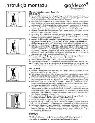 Instrukcja montażu www.grafdeco.pl Klejenie tapet samoprzylepnych: Na sucho: 1. 2. 3. 4. 5. 6. Tą techniką możemy kleić fototapety na powierzchniach suchych, nietłustych, gładkich, niepylących typu: płyta kartonowo-gipsowa, gładzie gipsowe, beton, ściany malowane ale również meble, lodówki, drzwi itd. Przy ścianach malowanych farbami lateksowymi, pylących, tłustych przed naklejaniem, powierzchnię ściany należy zagruntować preparatem przeznaczonym do danej powierzchni (klejem do tapet lub gruntem do ścian) oraz poczekać aż wyschnie. Przed przystąpieniem do naklejania fototapety, ścianę należy przygotować tj. umyć, odtłuścić (można użyć płynu do mycia szyb), odkurzyć lub uzupełnić ubytki. Podłoże, na które zamierzamy przykleić fototapetę powinno być czyste, odtłuszczone benzyną ekstrakcyjną i suche. Następnie należy fototapetę rozwinąć, przyłożyć do ściany i narysować na ścianie pionową linię pomocniczą zgodnie z krawędzią fototapety. Czynności te należy wykonać przy pomocy ołówka i poziomicy. Klejenie zaczynamy od góry (jeżeli fototapeta składa się z kilku części, klejenie zaczynamy od lewej strony i górnej części zgodnie z numeracją na tylnej stronie fototapety), odlepiamy 20-30 cm papieru podkładowego, zwijamy pod spód. 7. Przykładamy folię równo i przyklejamy ręką lub raklą pas ok. 10 cm, następnie sprawdzamy czy wszystko jest prosto. Fototapeta powinna przylegać do na rysowanej wcześniej linii pomocniczej. Jeśli coś nam wyszło krzywo, odklejamy fototapetę i naklejamy ponownie. Następnie odwijamy odcinek ok. 30-50 cm, odciągając papier podkładowy i naklejamy wykonując ruchy od środka do zewnątrz, wypychając powietrze spod fototapety. 8. Kolejne bryty przyklejamy w ten sam sposób, precyzyjnie przyklejając obok siebie na zakładkę 1 cm, tak aby wzór pasował do siebie. 9. Ewentualny nadmiar tapety należy usunąć ostrym nożykiem. 10.Jeżeli powstaną pęcherzyki, należy przebić je ostrą szpilką i wygładzić ręką lub raklą. 11.Otwory na gniazdka, włączniki i kinkiety wycinamy nożykiem pamiętając, aby wycięcie było zawsze mniejsze od mocowanego później na ścianie elementu. Na mokro: 1. 2. 3. 4. 5. 6. 7. 8. 9. Podłoże, na które zamierzamy przykleić fototapetę powinno być czyste, odtłuszczone benzyną ekstrakcyjną i suche. Techniką na mokro kleimy tylko na powierzchniach gładkich typu: szkło, metal, plastik, lakierowane drewno (czyli na meblach, oknach, lodówkach, itp.). Do butelki ze spryskiwaczem (np. po płynie do mycia szyb) nalewamy wodę oraz dodajemy pięć kropli płynu do mycia naczyń. Wodą spryskujemy powierzchnię. Odklejamy 20-30 cm papieru podkładowego z fototapety i zwijamy pod spód. Następnie spryskujemy wodą folię na powierzchni z klejem oraz początek podłoża, na którym zamierzamy przykleić fototapetę. Przykładamy fototapetę równo i przyklejamy dokładnie pas z odsłoniętym klejem. Jedna osoba wygładza raklą powierzchnię naklejaną, usuwając na zewnątrz bąbelki powietrza i wody, druga naciąga cały pas, podwijając co chwilę papier podkładowy. Każdorazowo po odklejeniu kolejnej partii papieru podkładowego spryskujemy wodą obie powierzchnie. Kolejne bryty przyklejamy w ten sam sposób, precyzyjnie przyklejając obok siebie na zakładkę 1 cm, tak aby wzór pasował do siebie. Ewentualny nadmiar tapety należy usunąć ostrym nożykiem. Otwory na gniazdka, włączniki i kinkiety wycinamy również nożykiem pamiętając, aby wycięcie było zawsze mniejsze od mocowanego później na ścianie elementu. Fototapeta zwiąże się trwale z podłożem dopiero po odparowaniu wody czyli po ok. 48 godz. Po ok. 12 godzinach należy sprawdzić czy fototapeta przylega dokładnie do powierzchni, jeżeli powstaną pęcherzyki, należy przebić je ostrą szpilką i wygładzić ręką lub raklą. UWAGA! Niezależnie od sposobu klejenia, po rozpakowaniu fototapety, należy ją rozwinąć oraz sprawdzić, czy wszystkie jej części pasują do siebie.