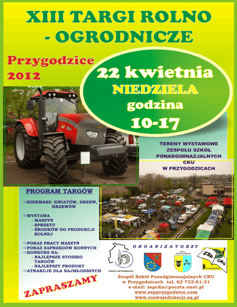 XIII TARGI ROLNO - OGRODNICZE Przygodzice 22 kwietnia 2012 NIEDZIELA godzina 10-17 TERENY WYSTAWOWE ZESPOŁU SZKÓŁ PONADGIMNAZJALNYCH CKU W PRZYGODZICACH PROGRAM TARGÓW đ KIERMASZ: KWIATÓW, DRZEW, KRZEWÓW đ WYSTAWA - MASZYN - SPRZĘTU - ŚRODKÓW DO PRODUKCJI ROLNEJ đ POKAZ PRACY MASZYN O R G A N I Z A T O R ZY đ POKAZ ZAPRZĘGÓW KONNYCH đ KONKURS NA: - NAJLEPSZE STOISKO TARGÓW - NAJLEPSZY PRODUKT đ ATRAKCJE DLA NAJMŁODSZYCH Y M A SZ A R ZAP Zespół Szkół Ponadgimnazjalnych CKU w Przygodzicach tel. 62 733-61-31 e-mail: [email protected] www.zspprzygodzice.com www.rozwojedukacji.aq.pl