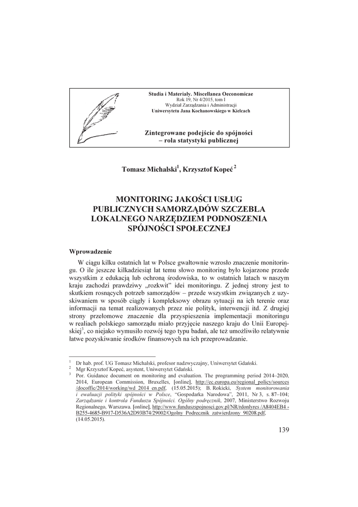 Studia i Materiały. Miscellanea Oeconomicae Rok 19, Nr 4/2015, tom I Wydział Zarządzania i Administracji Uniwersytetu Jana Kochanowskiego w Kielcach Zintegrowane podejście do spójności – rola statystyki publicznej Tomasz Michalski1, Krzysztof Kopeć 2 MONITORING JAKOŚCI USŁUG PUBLICZNYCH SAMORZĄDÓW SZCZEBLA LOKALNEGO NARZĘDZIEM PODNOSZENIA SPÓJNOŚCI SPOŁECZNEJ Wprowadzenie W ciągu kilku ostatnich lat w Polsce gwałtownie wzrosło znaczenie monitoringu. O ile jeszcze kilkadziesiąt lat temu słowo monitoring było kojarzone przede wszystkim z edukacją lub ochroną środowiska, to w ostatnich latach w naszym kraju zachodzi prawdziwy „rozkwit” idei monitoringu. Z jednej strony jest to skutkiem rosnących potrzeb samorządów – przede wszystkim związanych z uzyskiwaniem w sposób ciągły i kompleksowy obrazu sytuacji na ich terenie oraz informacji na temat realizowanych przez nie polityk, interwencji itd. Z drugiej strony przełomowe znaczenie dla przyspieszenia implementacji monitoringu w realiach polskiego samorządu miało przyjęcie naszego kraju do Unii Europejskiej3, co niejako wymusiło rozwój tego typu badań, ale też umożliwiło relatywnie łatwe pozyskiwanie środków finansowych na ich przeprowadzanie. Dr hab. prof. UG Tomasz Michalski, profesor nadzwyczajny, Uniwersytet Gdański. Mgr Krzysztof Kopeć, asystent, Uniwersytet Gdański. 3 Por. Guidance document on monitoring and evaluation. The programming period 2014–2020, 2014, European Commission, Bruxelles, [online], http://ec.europa.eu/regional_policy/sources /docoffic/2014/working/wd_2014_en.pdf, (15.05.2015); B. Rokicki, System monitorowania i ewaluacji polityki spójności w Polsce, “Gospodarka Narodowa”, 2011, Nr 3, s. 87–104; Zarządzanie i kontrola Funduszu Spójności. Ogólny podręcznik, 2007, Ministerstwo Rozwoju Regionalnego, Warszawa. [online], http://www.funduszspojnosci.gov.pl/NR/rdonlyres /A8404EB4 B255-4685-B917-D536A2D93B74/29002/Ogolny_Podrecznik_zatwierdzony_90208.pdf, (14.05.2015). 1 2 139 Według najbardziej szerokiej definicji możemy monitoring ująć jako ogólnie rozumiany proces regularnego gromadzenia oraz analizowania danych jakościowych i ilościowych, a także systematyczne pomiary określonych zjawisk, przeprowadzane przez z góry określony czas, najczęściej w ściśle ustalonych interwałach czasowych, według ściśle określonych metod i obejmujące określony przedmiot badań4. Patrząc od strony praktycznej przeprowadzanych badań o charakterze monitoringu możemy je podzielić na dotyczące zjawisk i procesów (np. poziom bezrobocia, losy absolwentów szkół, stopień zanieczyszczenia środowiska) oraz odnoszące się do działań (realizowanych zadań, przeprowadzanych programów, wdrażanych rozwiązań itd.). Praktyczne znaczenie ma jeszcze podział na opracowania o charakterze naukowym5, podręcznikowym6 oraz na raporty przedstawiające wyniki badań7. 4 5 6 J.T. Czochański, Monitoring rozwoju regionalnego. Aspekty metodologiczne i implementacyjne, „Studia KPZK PAN”, 2013, T. CXLIX. np. J. T. Czochański, Monitoring rozwoju…, op.cit.; A. Kaminska, Ewaluacja i monitoring projektów badawczo-rozwojowych jako narzędzie wspomagające zarządzanie projektami. Studium przypadku międzynarodowego projektu p.n. „Matches – Towards the Modernization of Higher Education Institutions in Uzbekistan”, „Studia i Materiały. Miscellanea Oeconomicae”, 2014, 18(4), s. 91–111; A. Mytlewski, Monitoring ekonomiczny przedsiębiorstw, Wydawnictwo Uniwersytetu Gdańskiego, Gdańsk 2007; J. Namieśnik, W. Chrzanowski, P. Szpinek (red.), Nowe horyzonty i wyzwania w analityce i monitoringu środowiskowym, Centrum Doskonałości Analityki i Monitoringu Środowiskowego, Gdańsk 2003; Z. Zwoliński (red.), GIS – teledetekcja środowiska, Bogucki Wydawnictwo Naukowe, Poznań 2012. np. A. Bartoszewicz, J. Herbst, Ł. Ostrowski, K. Starzyk, J. J. Wygnański, Od diagnozy do strategii. Partycypacyjne planowanie usług publicznych w samorządach lokalnych, Urząd m.st. Warszawy, PBiIS „Stocznia”, Warszawa 2014, [online], http://stocznia.org.pl/wpcontent/uploads/2014/01/od_diagnozy_do_strategii.pdf, (12.05.2015); B. Bukowska, P. Jabłoński, J. Sierosławski (red.), Podręcznik do monitorowania problemu narkotyków i narkomanii na poziomie lokalnym, Krajowe Biuro ds. Przeciwdziałania Narkomanii, Warszawa 2008; M. Czerwińska, J. Gajdsz, A. Hildebrandt, K. Kopeć, B. Kupc-Muszyńska, T. Michalski, M. Nowicki, P. Susmarski, M. Tarkowski, Jak zaprojektować i wdrożyć system monitoringu jakości usług publicznych i jakości życia? Podręcznik wdrażania, Instytut Badań nad Gospodarką Rynkową, Gdańsk, 2014, [online] http://monitoring.ibngr.pl/wp-content/uploads/2015/02/Jakzaprojektowac-i-wdrozyc-system.-Podrecznik-wdrazania.pdf, (12.05.2015); W. Dziemianowicz, K. Szmigiel-Rawska, N. Baczyńska, J. Charkiewicz, B. Iwańczak, M. Rybacka, A. Sekuła, Podręcznik metodologiczny systemu monitoringu innowacyjności województwa mazowieckiego wraz ze Słownikiem, GEOPROFIT, ECORYS, Warszawa, 2013, [online], http://www.ris.mazovia.pl /sites/default/files/podrecznik_metodologiczny_systemu_monitoringu_innowacyjnosci_wojewod ztwa_mazowieckiego.pdf, (14.05.2015); T. Janicka-Panek, Monitorowanie (skuteczne i nieuciążliwe) podstawy programowej wychowania przedszkolnego i edukacji wczesnoszkolnej, Ośrodek Rozwoju Edukacji, Warszawa, 2014, [online], http://www.bc.ore.edu.pl/Content /600/monitorowanie_interaktywny.pdf, (17.05.2015); T. Kudłacz, M. Kopeć, Koncepcja systemu monitorowania polityk publicznych w województwie lubuskim, Lubuskie Regionalne Obserwatorium Terytorialne, Zielona Góra, 2013, [online], http://lubuskie.pl/uploads /pliki/strategia/Koncepcja_monitorowania_polityk_publicznych_w_WL_KUD%C5%81ACZ.pdf, (14.05.2015); A. Malczewski (red.), Monitorowanie problemu narkotyków i narkomanii, Mazowieckie Centrum Polityki Społecznej, Warszawa 2013; P. Prokop