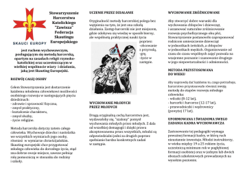 Stowarzyszenie Harcerstwa Katolickiego "Zawisza" Federacja Skautingu Europejskiego jest ruchem wychowawczym, posługującym się metodą harcerską, opartym na zasadach religii rzymskokatolickiej oraz uczestniczącym w wielkiej wspólnocie wiary i działania, jaką jest Skauting Europejski. UCZENIE PRZEZ DZIAŁANIE WYCHOWANIE ZRÓŻNICOWANE Oryginalność metody harcerskiej polega bez wątpienia na tym, że jest ona szkołą działania. Zastęp harcerski nie jest miejscem, gdzie zdobywa się wiedzę w sposób bierny, ale wspólnotą praktycznej nauki życia poprzez: -obcowanie z przyrodą, -grę, -życie w zastępie. Aby stworzyć dobre warunki dla wychowania chłopców i dziewcząt, i uszanować naturalne zróżnicowanie rozwoju psychofizycznego obu płci, Stowarzyszenie postanowiło zaproponować rodzicom umieszczenie dziewcząt w jednostkach żeńskich, a chłopców w jednostkach męskich. Organizowanie od czasu do czasu wspólnych zajęć pozwala na wzajemne poznanie i szanowanie drugiego w jego niepowtarzalności i odmienności. METODA PRZYSTOSOWANA DO WIEKU ROZWÓJ CAŁEJ OSOBY Celem Stowarzyszenia jest dostarczenie każdemu młodemu człowiekowi możliwości osobistego rozwoju w następujących pięciu dziedzinach: - zdrowie i sprawność fizyczna, - zmysł praktyczny, - kształcenie charakteru, - zmysł służby, - życie religijne. Metoda harcerska dotyczy zatem całego człowieka. Wychowuje dziecko i nastolatka we wszystkich wymiarach jego osoby, również w wymiarze chrześcijańskim. Skauting europejski chce przygotować młodego człowieka do dorosłego życia, stąd zna dobrze swoje miejsce, zawsze pełniąc rolę pomocniczą w stosunku do rodziny i szkoły. Aby naprawdę dać każdemu to, czego potrzebuje, harcerstwo przystosowało również swoją WYCHOWANIE MŁODYCH PRZEZ MŁODYCH Drugą oryginalną cechą harcerstwa jest, wydawałoby się, "szalony" pomysł wychowania młodych przez młodych. Z dala od wszelkiej demagogii i dzięki prawu akceptowanemu przez wszystkich, młodzi są odpowiedzialni jedni za drugich poprzez spełnianie bardzo konkretnych zadań w zastępie. metodę do etapów rozwoju młodego człowieka: - wilczki (8-12 lat), - harcerki i harcerze (12-17 lat), - przewodniczki i wędrownicy (powyżej 17 lat). UFORMOWANA I ŚWIADOMA SWEGO ZADANIA KADRA WYCHOWAWCZA Zastosowanie tej pedagogiki wymaga poważnej formacji kadry, w którą ruch nieustannie inwestuje. Młodzi instruktorzy, w wieku między 19 a 25 rokiem życia, uczestniczą minimum rok w pogłębionej formacji osobistej oraz w jednym lub dwóch obozach szkoleniowych prowadzonych na wysokim poziomie. Akcja „Skauci Europy w Łodzi” Rozpoczynamy swoją działalność w ŁODZI, w Grocie Solnej u Sióstr Urszulanek przy parafii św. Urszuli Ledóchowskiej na ul. Obywatelskiej 60 www.skauci-europy.pl Krok 1. ZOSTAŃ SKAUTEM WOLONTARIUSZEM! Kontakt: Ważne kryteria: dh Magdalena Biernacka tel: 726 83 26 83 e-mail: [email protected] - masz mnóstwo pomysłów, chęci do ks. Marek Kołosowski Tel: 602 262 210 e-mail: [email protected] Grota Solna u Sióstr Urszulanek ul. Obywatelska 60 Łódź www.parafia-urszula.pl UWAGA!!! Pierwsze spotkanie ze SKAUTAMI EUROPY dla rodziców, dzieci, młodzieży i chętnych wolontariuszy JUŻ w niedzielę 30 MARCA po Mszy Świętej na godz. 11:00 w GROCIE SOLNEJ Sióstr Urszulanek. ZAPRASZAMY!!! działania i niespożytkowanej energii - jesteś spragniona/y Boga i wciąż Ci Go mało! - chcesz zdobywać wiedzę i uczestniczyć w kursach i szkoleniach (np. pierwsza pomoc, śpiew, ekspresja, wspinaczka, kajakarstwo, obozy szkoleniowopedagogaiczne dla szefów i wiele innych) - nie znosisz nudy! - masz dryg do służby, pomagania i uczenia - chcesz dołożyć swoje 5 groszy, by zmienić ten świat na ciut lepszy! - potrafisz wziąć plecak i po prostu wyruszyć w drogę - pragniesz kształtować siebie i stawać się lepszym Krok 2. DO DZIEŁA! Jeśli jesteś w wieku 18-100 lat i wszystkie powyższe kryteria się zgadzają to znaczy, że jesteś świetnym kandydatem na instruktora harcerstwa! Jeśli masz od 12-17 lat zrób coś dla siebie i innych! Załóż przy naszej pomocy zastęp i wejdź do Wielkiej Gry i PRZYGODY wraz z przyjaciółmi, z którymi stworzysz DRUŻYNĘ! Zgłoś się do nas! Z harcerskim pozdrowieniem „Czuwaj”