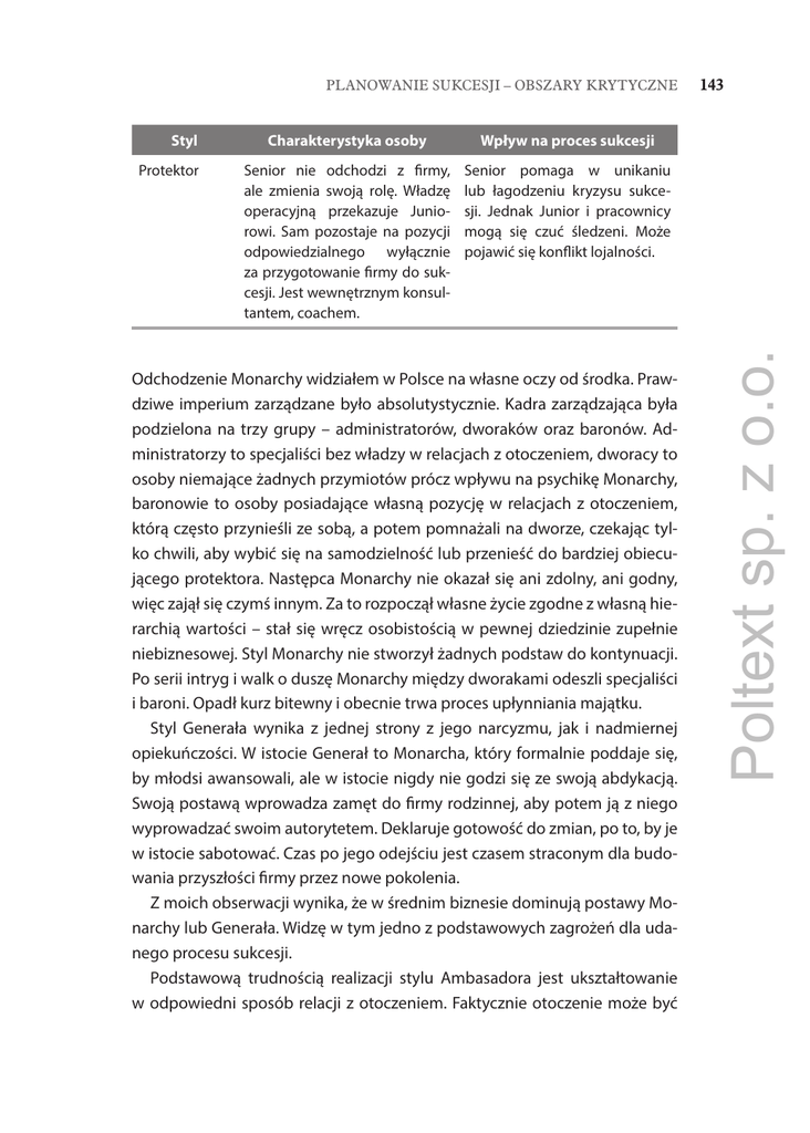 Styl Protektor Charakterystyka osoby Wpływ na proces sukcesji Senior nie odchodzi z firmy, ale zmienia swoją rolę. Władzę operacyjną przekazuje Juniorowi. Sam pozostaje na pozycji odpowiedzialnego wyłącznie za przygotowanie firmy do sukcesji. Jest wewnętrznym konsultantem, coachem. Senior pomaga w unikaniu lub łagodzeniu kryzysu sukcesji. Jednak Junior i pracownicy mogą się czuć śledzeni. Może pojawić się konflikt lojalności. Odchodzenie Monarchy widziałem w Polsce na własne oczy od środka. Prawdziwe imperium zarządzane było absolutystycznie. Kadra zarządzająca była podzielona na trzy grupy – administratorów, dworaków oraz baronów. Administratorzy to specjaliści bez władzy w relacjach z otoczeniem, dworacy to osoby niemające żadnych przymiotów prócz wpływu na psychikę Monarchy, baronowie to osoby posiadające własną pozycję w relacjach z otoczeniem, którą często przynieśli ze sobą, a potem pomnażali na dworze, czekając tylko chwili, aby wybić się na samodzielność lub przenieść do bardziej obiecującego protektora. Następca Monarchy nie okazał się ani zdolny, ani godny, więc zajął się czymś innym. Za to rozpoczął własne życie zgodne z własną hierarchią wartości – stał się wręcz osobistością w pewnej dziedzinie zupełnie niebiznesowej. Styl Monarchy nie stworzył żadnych podstaw do kontynuacji. Po serii intryg i walk o duszę Monarchy między dworakami odeszli specjaliści i baroni. Opadł kurz bitewny i obecnie trwa proces upłynniania majątku. Styl Generała wynika z jednej strony z jego narcyzmu, jak i nadmiernej opiekuńczości. W istocie Generał to Monarcha, który formalnie poddaje się, by młodsi awansowali, ale w istocie nigdy nie godzi się ze swoją abdykacją. Swoją postawą wprowadza zamęt do firmy rodzinnej, aby potem ją z niego wyprowadzać swoim autorytetem. Deklaruje gotowość do zmian, po to, by je w istocie sabotować. Czas po jego odejściu jest czasem straconym dla budowania przyszłości firmy przez nowe pokolenia. Z moich obserwacji wynika, że w średnim biznesie dominują postawy Monarchy lub Generała. Widzę w tym jedno z podstawowych zagrożeń dla udanego procesu sukcesji. Podstawową trudnością realizacji stylu Ambasadora jest ukształtowanie w odpowiedni sposób relacji z otoczeniem. Faktycznie otoczenie może być 143 Poltext sp. z o.o. PLANOWANIE SUKCESJI – OBSZARY KRYTYCZNE