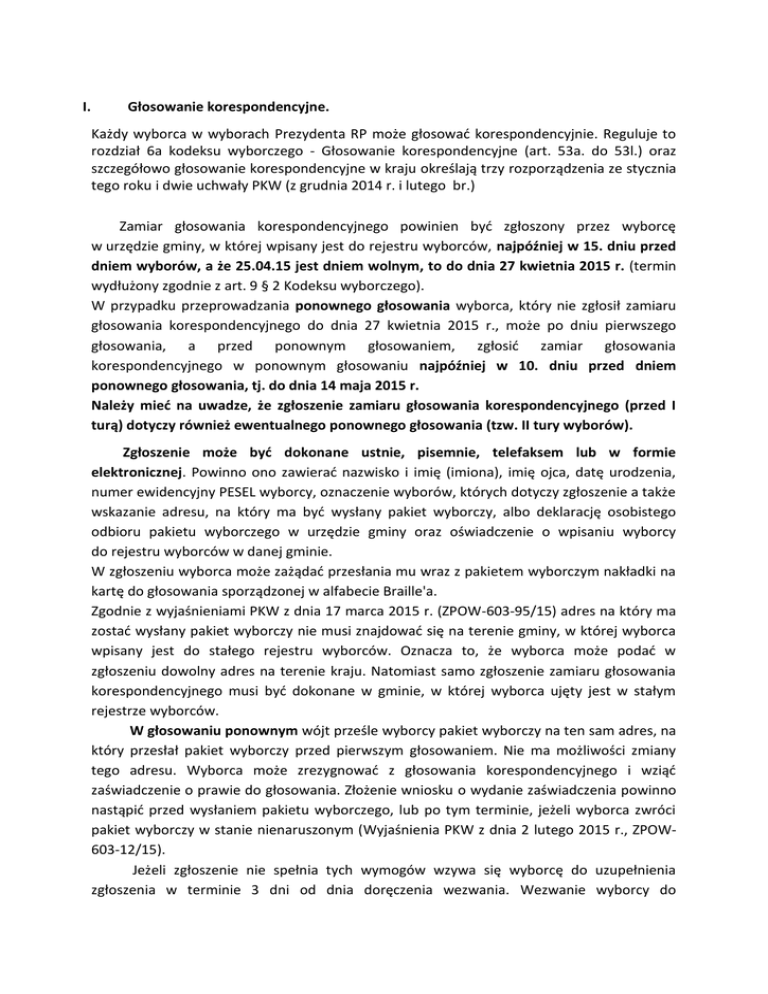 I. Głosowanie korespondencyjne. Każdy wyborca w wyborach Prezydenta RP może głosować korespondencyjnie. Reguluje to rozdział 6a kodeksu wyborczego - Głosowanie korespondencyjne (art. 53a. do 53l.) oraz szczegółowo głosowanie korespondencyjne w kraju określają trzy rozporządzenia ze stycznia tego roku i dwie uchwały PKW (z grudnia 2014 r. i lutego br.) Zamiar głosowania korespondencyjnego powinien być zgłoszony przez wyborcę w urzędzie gminy, w której wpisany jest do rejestru wyborców, najpóźniej w 15. dniu przed dniem wyborów, a że 25.04.15 jest dniem wolnym, to do dnia 27 kwietnia 2015 r. (termin wydłużony zgodnie z art. 9 § 2 Kodeksu wyborczego). W przypadku przeprowadzania ponownego głosowania wyborca, który nie zgłosił zamiaru głosowania korespondencyjnego do dnia 27 kwietnia 2015 r., może po dniu pierwszego głosowania, a przed ponownym głosowaniem, zgłosić zamiar głosowania korespondencyjnego w ponownym głosowaniu najpóźniej w 10. dniu przed dniem ponownego głosowania, tj. do dnia 14 maja 2015 r. Należy mieć na uwadze, że zgłoszenie zamiaru głosowania korespondencyjnego (przed I turą) dotyczy również ewentualnego ponownego głosowania (tzw. II tury wyborów). Zgłoszenie może być dokonane ustnie, pisemnie, telefaksem lub w formie elektronicznej. Powinno ono zawierać nazwisko i imię (imiona), imię ojca, datę urodzenia, numer ewidencyjny PESEL wyborcy, oznaczenie wyborów, których dotyczy zgłoszenie a także wskazanie adresu, na który ma być wysłany pakiet wyborczy, albo deklarację osobistego odbioru pakietu wyborczego w urzędzie gminy oraz oświadczenie o wpisaniu wyborcy do rejestru wyborców w danej gminie. W zgłoszeniu wyborca może zażądać przesłania mu wraz z pakietem wyborczym nakładki na kartę do głosowania sporządzonej w alfabecie Braille'a. Zgodnie z wyjaśnieniami PKW z dnia 17 marca 2015 r. (ZPOW-603-95/15) adres na który ma zostać wysłany pakiet wyborczy nie musi znajdować się na terenie gminy, w której wyborca wpisany jest do stałego rejestru wyborców. Oznacza to, że wyborca może podać w zgłoszeniu dowolny adres na terenie kraju. Natomiast samo zgłoszenie zamiaru głosowania korespondencyjnego musi być dokonane w gminie, w której wyborca ujęty jest w stałym rejestrze wyborców. W głosowaniu ponownym wójt prześle wyborcy pakiet wyborczy na ten sam adres, na który przesłał pakiet wyborczy przed pierwszym głosowaniem. Nie ma możliwości zmiany tego adresu. Wyborca może zrezygnować z głosowania korespondencyjnego i wziąć zaświadczenie o prawie do głosowania. Złożenie wniosku o wydanie zaświadczenia powinno nastąpić przed wysłaniem pakietu wyborczego, lub po tym terminie, jeżeli wyborca zwróci pakiet wyborczy w stanie nienaruszonym (Wyjaśnienia PKW z dnia 2 lutego 2015 r., ZPOW603-12/15). Jeżeli zgłoszenie nie spełnia tych wymogów wzywa się wyborcę do uzupełnienia zgłoszenia w terminie 3 dni od dnia doręczenia wezwania. Wezwanie wyborcy do uzupełnienia zgłoszenia, przekazywane w formie elektronicznej, powinno być dokonane przy użyciu bezpiecznego podpisu elektronicznego (Wyjaśnienia PKW z dnia 12 marca 2015 r., ZPOW-603-84/15). Zgłoszenie złożone po terminie, niespełniające wymogów, lub nieuzupełnione w terminie, a także złożone przez wyborcę, który wystąpił z wnioskiem o sporządzenie aktu pełnomocnictwa do głosowania lub otrzymał zaświadczenie o prawie do głosowania w miejscu pobytu w dniu wyborów, pozostawia się bez rozpoznania, o czym informuje się wyborcę. Wyborca zostanie skreślony ze spisu w obwodzie właściwym dla miejsca stałego zamieszkania i ujęty w spisie wyborców w obwodzie głosowania właściwym dla obwodowej komisji wyborczej, wyznaczonej dla celów głosowania korespondencyjnego. Zgodnie z art. 12a kodeksu wyborczego komisjami właściwymi do dla celów głosowania korespondencyjnego w kraju są obwodowe komisje wyborcze które mają siedziby w lokalach dostosowanych do potrzeb wyborców niepełnosprawnych. Jeżeli w gminie jest więcej niż jeden obwód wyznaczony do głosowania korespondencyjnego, decyzję o tym, w którym obwodzie głosowania dopisać wyborcę podejmuje właściwy organ sporządzający spis wyborców. W ocenie PKW ( wyjaśnienia z dnia 17 marca 2015 r., ZPOW-603-95/15), w takim przypadku, wyborcy powinni być dopisani do obwodów głosowania w miarę możliwości równomiernie, jednakże powinien być to obwód znajdujący się najbliżej miejsca zamieszkania tego wyborcy. Głosować korespondencyjne nie mogą wyborcy umieszczeni w spisach wyborców w: obwodach głosowania utworzonych w zakładach opieki zdrowotnej, domach pomocy społecznej, zakładach karnych i aresztach śledczych oraz domach studenckich lub zespołach domów studenckich, a ponadto wyborcy, którzy udzielili pełnomocnictwa do głosowania. W przypadku gdy wyborca zgłosił zamiar głosowania korespondencyjnego, wyborcy temu nie wydaje się zaświadczenia o prawie do głosowania po wysłaniu do wyborcy pakietu wyborczego, chyba że zwrócił on pakiet wyborczy w stanie nienaruszonym. Wyborca, nie później niż 7 dni przed dniem wyborów, otrzyma z urzędu gminy pakiet wyborczy, który zostanie doręczony wyłącznie do rąk własnych wyborcy, po okazaniu dokumentu potwierdzającego tożsamość i pisemnym pokwitowaniu odbioru. Pakiet wyborczy jest doręczany do wyborcy przez upoważnionego pracownika urzędu gminy, lub też urząd gminy może przesłać wyborcy pakiet wyborczy za pośrednictwem operatora wyznaczonego w rozumieniu ustawy z dnia 23 listopada 2012 r. - Prawo pocztowe (Dz. U. poz. 1529). Jeżeli wyborca we wniosku zadeklarował osobisty odbiór pakietu wyborczego, pakiet ten we wskazanym terminie będzie możliwy do odebrania w urzędzie gminy (w godzinach pracy urzędu). Jeżeli wyborca nie może potwierdzić odbioru, doręczający sam stwierdzi datę doręczenia oraz wskaże odbierającego i przyczynę