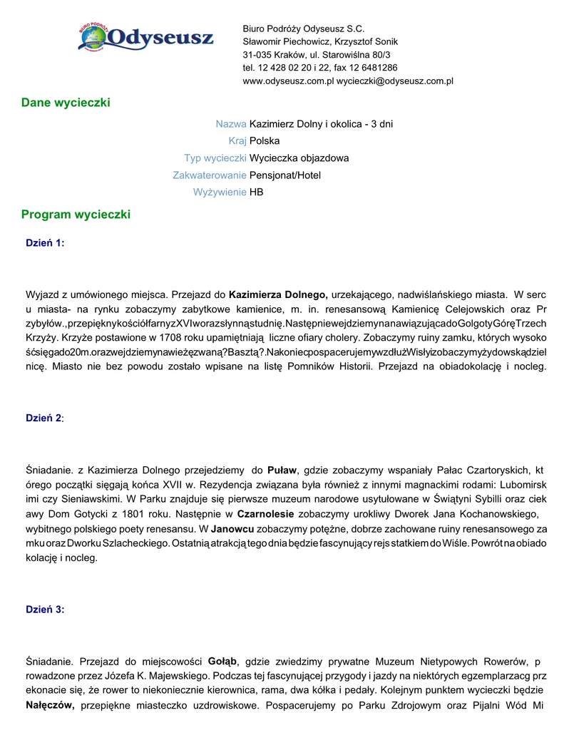 Biuro Podróży Odyseusz S.C. Sławomir Piechowicz, Krzysztof Sonik 31-035 Kraków, ul. Starowiślna 80/3 tel. 12 428 02 20 i 22, fax 12 6481286 www.odyseusz.com.pl [email protected] Dane wycieczki Nazwa Kazimierz Dolny i okolica - 3 dni Kraj Polska Typ wycieczki Wycieczka objazdowa Zakwaterowanie Pensjonat/Hotel Wyżywienie HB Program wycieczki Dzień 1: Wyjazd z umówionego miejsca. Przejazd do Kazimierza Dolnego, urzekającego, nadwiślańskiego miasta. W serc u miasta- na rynku zobaczymy zabytkowe kamienice, m. in. renesansową Kamienicę Celejowskich oraz Pr zybyłów.,przepięknykościółfarnyzXVIworazsłynnąstudnię.NastępniewejdziemynanawiązującadoGolgotyGóręTrzech Krzyży. Krzyże postawione w 1708 roku upamiętniają liczne ofiary cholery. Zobaczymy ruiny zamku, których wysoko śćsięgado20m.orazwejdziemynawieżęzwaną?Basztą?.NakoniecpospacerujemywzdłużWisłyizobaczymyżydowskądziel nicę. Miasto nie bez powodu zostało wpisane na listę Pomników Historii. Przejazd na obiadokolację i nocleg. Dzień 2: Śniadanie. z Kazimierza Dolnego przejedziemy do Puław, gdzie zobaczymy wspaniały Pałac Czartoryskich, kt órego początki sięgają końca XVII w. Rezydencja związana była również z innymi magnackimi rodami: Lubomirsk imi czy Sieniawskimi. W Parku znajduje się pierwsze muzeum narodowe usytułowane w Świątyni Sybilli oraz ciek awy Dom Gotycki z 1801 roku. Następnie w Czarnolesie zobaczymy urokliwy Dworek Jana Kochanowskiego, wybitnego polskiego poety renesansu. W Janowcu zobaczymy potężne, dobrze zachowane ruiny renesansowego za mku oraz Dworku Szlacheckiego. Ostatnią atrakcją tego dnia będzie fascynujący rejs statkiem do Wiśle. Powrót na obiado kolację i nocleg. Dzień 3: Śniadanie. Przejazd do miejscowości Gołąb, gdzie zwiedzimy prywatne Muzeum Nietypowych Rowerów, p rowadzone przez Józefa K. Majewskiego. Podczas tej fascynującej przygody i jazdy na niektórych egzemplarzacg prz ekonacie się, że rower to niekoniecznie kierownica, rama, dwa kółka i pedały. Kolejnym punktem wycieczki będzie Nałęczów, przepiękne miasteczko uzdrowiskowe. Pospacerujemy po Parku Zdrojowym oraz Pijalni Wód Mi neralnych. Wyjazd w drogę powrotną. Zakończenie wycieczki w godzinach wieczornych. Cena zawiera: przejazd komfortowym autokarem, 2 noclegi w pensjonacie lub hotelu, 2 śniadania, 2 obiadokolacje, opiekę pilota ? przewodnika, ubezpieczenie NNW, wszystkie opłaty drogowe oraz parkingi. Cena nie zawiera: biletów wstępu do zwiedzanych obiektów. Uwaga !!! Jeżeli szkoła jest z poza Krakowa lub Katowic przygotowujemy indywidualną kalkulację w równie atrak cyjnych cenach. Gwarantujemy konkurencyjne ceny i dobrą jakość usług. Cena Miasto wyjazdu Katowice Kraków Rzeszów Cena w przypadku 30os. 420.00 zł 415.00 zł 400.00 zł Cena w przypadku 44os. 345.00 zł 340.00 zł 335.00 zł