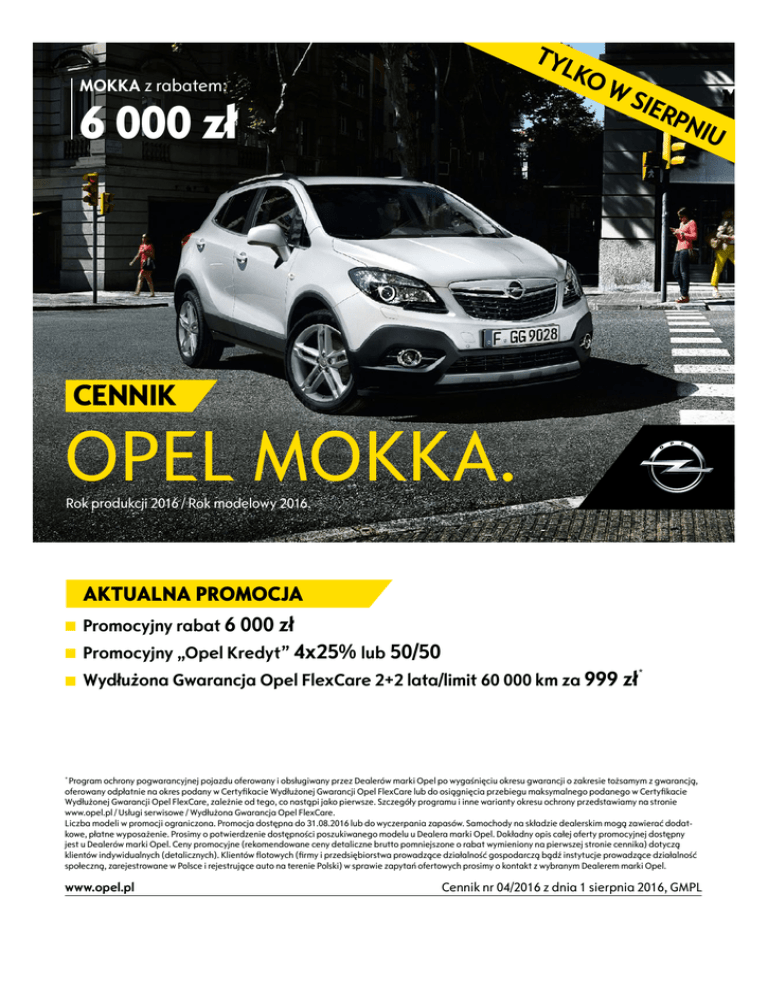 TYL KO W MOKKA z rabatem: 6 000 zł SIE RPN IU CENNIK OPEL MOKKA. Rok produkcji 2016 / Rok modelowy 2016. AKTUALNA PROMOCJA Promocyjny rabat 6 000 zł Promocyjny „Opel Kredyt” 4x25% lub 50/50 Wydłużona Gwarancja Opel FlexCare 2+2 lata/limit 60 000 km za 999 zł * Program ochrony pogwarancyjnej pojazdu oferowany i obsługiwany przez Dealerów marki Opel po wygaśnięciu okresu gwarancji o zakresie tożsamym z gwarancją, oferowany odpłatnie na okres podany w Certyfikacie Wydłużonej Gwarancji Opel FlexCare lub do osiągnięcia przebiegu maksymalnego podanego w Certyfikacie Wydłużonej Gwarancji Opel FlexCare, zależnie od tego, co nastąpi jako pierwsze. Szczegóły programu i inne warianty okresu ochrony przedstawiamy na stronie www.opel.pl / Usługi serwisowe / Wydłużona Gwarancja Opel FlexCare. Liczba modeli w promocji ograniczona. Promocja dostępna do 31.08.2016 lub do wyczerpania zapasów. Samochody na składzie dealerskim mogą zawierać dodatkowe, płatne wyposażenie. Prosimy o potwierdzenie dostępności poszukiwanego modelu u Dealera marki Opel. Dokładny opis całej oferty promocyjnej dostępny jest u Dealerów marki Opel. Ceny promocyjne (rekomendowane ceny detaliczne brutto pomniejszone o rabat wymieniony na pierwszej stronie cennika) dotyczą klientów indywidualnych (detalicznych). Klientów flotowych (firmy i przedsiębiorstwa prowadzące działalność gospodarczą bądź instytucje prowadzące działalność społeczną, zarejestrowane w Polsce i rejestrujące auto na terenie Polski) w sprawie zapytań ofertowych prosimy o kontakt z wybranym Dealerem marki Opel. * www.opel.pl Cennik nr 04/2016 z dnia 1 sierpnia 2016, GMPL Cennik – Opel Mokka Rok produkcji 2016, rok modelowy 2016 Ceny promocyjne* Active Enjoy Cosmo 1.6 Ecotec 115 KM Start/Stop M5 64 450 67 200 72 700 1.4 Turbo 140 KM Start/Stop M6 – 72 750 78 250 1.4 Turbo 140 KM LPGTEC M6 – 79 250 84 750 1.4 Turbo 140 KM A6 – 77 150 82 650 1.4 Turbo 140 KM Start/Stop 4x4 M6 – 80 750 86 250 1.6 CDTI 110 KM Start/Stop M6 – 80 450 85 950 1.6 CDTI 136 KM Start/Stop M6 – 83 250 88 750 1.6 CDTI 136 KM A6 – 85 950 91 450 1.6 CDTI 136 KM Start/Stop 4x4 M6 – 89 950 95 450 * Liczba modeli w promocji ograniczona. Promocja dostępna do 31.08.2016 lub do wyczerpania zapasów. Samochody na składzie dealerskim mogą zawierać dodatkowe, płatne wyposażenie. Prosimy o potwierdzenie dostępności poszukiwanego modelu u Dealera marki Opel. Dokładny opis całej oferty promocyjnej dostępny jest u Dealerów marki Opel. Ceny promocyjne (rekomendowane ceny detaliczne brutto pomniejszone o rabat wymieniony na pierwszej stronie cennika) dotyczą klientów indywidualnych (detalicznych). Klientów flotowych (firmy i przedsiębiorstwa prowadzące działalność gospodarczą bądź instytucje prowadzące działalność społeczną, zarejestrowane w Polsce i rejestrujące auto na terenie Polski) w sprawie zapytań ofertowych prosimy o kontakt z wybranym Dealerem marki Opel. Ceny katalogowe Active Enjoy Cosmo 1.6 Ecotec 115 KM Start/Stop M5 70 450 73 200 78 700 1.4 Turbo 140 KM Start/Stop M6 – 78 750 84 250 1.4 Turbo 140 KM LPGTEC M6 – 85 250 90 750 1.4 Turbo 140 KM A6 – 83 150 88 650 1.4 Turbo 140 KM Start/Stop 4x4 M6 – 86 750 92 250 1.6 CDTI 110 KM Start/Stop M6 – 86 450 91 950 1.6 CDTI 136 KM Start/Stop M6 – 89 250 94 750 1.6 CDTI 136 KM A6 – 91 950 97 450 1.6 CDTI 136 KM Start/Stop 4x4 M6 – 95 950 101 450 Cennik Opla Mokki rok produkcji 2016, rok modelowy 2016, nr 04/2016 z dnia 1 sierpnia 2016 1/3 Active Enjoy Cosmo S S S JL4/JL6 S S S AYC C67 UZZ W1Y/NZA U68 + K33 ATG+N08+UTJ AXG+AEF DG6 RRY UJM AH3 A77+UQK T3N UNM AXG+AEF+AER T3U WQX N34 CJ2 UE1 S S S S S S S S S S S S S – – – – – – – S S – S S S – S – S S S S S S S S S P 1 950 S – – S S S – S – S S S S – S S – S S S UFW – 1 600 S UD5 RV8 CE1 DL7 TQ5 DD8 AKo – – – – – – – P – P P P P 550 S S S S S S S T95 CF5 2 350 2 700 – – 2 350 2 700 5 200 3 100 2 350 2 700 5 200 3 100 D7D – 3 200 3 200 RVZ 500 500 500 – 6 500 6 100 AE4 – 3 000 3 000 C32 – 1 000 1 000 Y3i – 3 750 2 150 U2Q/U4D 800 800/900 800/900 oBT – 2 900 2 900 UVC – 1 000 1 000 LPQ1 / LPQ0 – 4 600 / 6 150 – LPQ0 – – 2 600 LP33 – – 4 950 oBY – 1 800 – oCP – 1 100 – oCK – 1 300 1 300 LP34 – 1 000 1 000 oGD – 1 800 – Wyposażenie standardowe Tapicerka materiałowa czarna lub brązowa (dostępność w zależności od wybranego poziomu wyposażenia i koloru) Układ ABS oraz stabilizacji toru jazdy ESP®. W wersjach z napędem 4x4 zawiera układ kontroli zjazdu ze wzniesień HDC oraz wspomagania ruszania na pochyłościach HSA. Przednie i boczne poduszki powietrzne kierowcy i pasażera oraz kurtynowe poduszki powietrzne Klimatyzacja sterowana manualnie Radioodtwarzacz CD/MP3 400 ze złączem AUX-in Przyciski sterowania na kierownicy Komputer pokładowy, tempomat Zdalnie sterowany zamek centralny, alarm Elektrycznie sterowane szyby przednie Elektrycznie sterowane i podgrzewane lusterka zewnętrze w kolorze nadwozia Obręcze kół stalowe 16" System monitorujący ciśnienie w oponach Fotel kierowcy z regulacją w 6 kierunkach (wzdłużną, wysokości, pochylenia oparcia) Tylna kanapa dzielona w proporcji 60/40 z mocowaniem fotelika ISOFIX Światła do jazdy dziennej Radioodtwarzacz CD/MP3 450BT z łączami USB i Bluetooth® Elektrycznie sterowane szyby przednie i tylne Przednie reflektory przeciwmgielne Obręcze kół ze stopów lekkich 17” Koło kierownicy pokryte skórą Klimatyzacja dwustrefowa sterowana elektronicznie System Opel OnStar® (tylko z systemami IntelliLink) System multimedialny CD600 IntelliLink z łączami Bluetooth®, USB, AUX-in. Zawiera: 6 głośników , wyświetlacz kolorowy 7” Czujnik parkowania przód/tył Obręcze kół ze stopów lekkich 18” Czujnik deszczu Elektrycznie składane lusterka zewnętrzne Automatyczne sterowanie światłami z czujnikiem oświetlenia (tunelowy