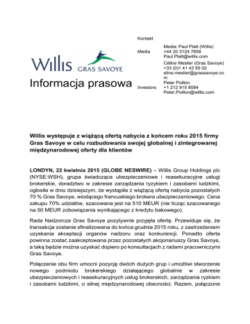 Kontakt Media Informacja prasowa Investors Media: Paul Platt (Willis) +44 20 3124 7659 [email protected] Céline Meslier (Gras Savoye) +33 (0)1 41 43 55 02 [email protected] m Peter Poillon +1 212 915 8084 [email protected] Willis występuje z wiążącą ofertą nabycia z końcem roku 2015 firmy Gras Savoye w celu rozbudowania swojej globalnej i zintegrowanej międzynarodowej oferty dla klientów LONDYN, 22 kwietnia 2015 (GLOBE NESWIRE) – Willis Group Holdings plc (NYSE:WSH), grupa świadcząca ubezpieczeniowe i reasekuracyjne usługi brokerskie, doradztwo w zakresie zarządzania ryzykiem i zasobami ludzkimi, ogłosiła w dniu dzisiejszym, że wystąpiła z wiążącą ofertą nabycia pozostałych 70 % Gras Savoye, wiodącego francuskiego brokera ubezpieczeniowego. Cena zakupu 70% udziałów, szacowana jest na 510 MEUR (nie licząc szacowanego na 50 MEUR zobowiązania wynikającego z kredytu bakowego). Rada Nadzorcza Gras Savoye pozytywnie przyjęła ofertę. Przewiduje się, że transakcja zostanie sfinalizowana do końca grudnia 2015 roku, z zastrzeżeniem uzyskania akceptacji organów nadzoru oraz konkurencji. Ponadto oferta powinna zostać zaakceptowana przez pozostałych akcjonariuszy Gras Savoye, a taką będzie można uzyskać dopiero po konsultacjach z radami pracowniczymi Gras Savoye. Połączenie obu firm umocni pozycję dwóch dużych grup i umożliwi stworzenie nowego podmiotu brokerskiego działającego globalnie w zakresie ubezpieczeniowych i reasekuracyjnych usług brokerskich, zarządzania ryzkiem i zasobami ludzkimi, o silnej międzynarodowej obecności. Razem, połączone firmy obejmą swoim zasięgiem 131 krajów, z czego 84 będą całkowicie zależne od nowego pomiotu. Nowy podmiot umożliwi stworzenie grupy dysponującej: • Silną sięcią we Francji, gdzie Gras Savoye jest największym brokerem i cieszy się wiodącą pozycją na rynku średnich przedsiębiorstw, z dużą możliwością rozwoju • Doświadczenie i osiągnięcia w obsłudze korporacji międzynarodowych, w tym przedsiębiorstw znajdujących się na terenie Francji, gdzie swoje siedziby ma 31 firm z listy Fortune Global 500 - ta wartość plasuje Francję na czwartym miejscu w skali światowej i na pierwszym miejscu w skali europejskiej. • Dostęp do dynamicznie rozwijających się gospodarek i rynków ubezpieczeniowych, w tym do rynku Europy Centralnej i Wschodniej oraz Bliskiego Wschodu, oraz do kompleksowej sieci 42 oddziałów znajdujących się w 31 krajach w Afryce. • Duży potencjał w zakresie produktów ubezpieczeń majątkowych i osobowych Komplementarność działalności Gras Savoye i Willis wynika z 40 lat partnerstwa. Wzajemna znajomość firm powinna ułatwić i przyspieszyć operacyjne działania połączenia podmiotów. Doświadczenie jakim dysponuje Gras Savoye w kluczowych sektorach oraz pozycja na dynamicznie rozwijających się rynkach w połączeniu z wyspecjalizowaniem i globalnymi możliwościami Willis przyniesie efekt w postaci zróżnicowanej oferty produktowej i usługowej, które stanowić będą istotną wartość dodaną dla klientów. Po zakończeniu tej operacji, Gras Savoye dołączy do Grupy Willis, zachowując przy tym swoją nazwę oraz markę na kluczowych rynkach, w tym na rynku francuskim. Paryż stanie się jednym z najcenniejszych centrów kompetencyjnych Grupy. Dominik Casserley, Prezes Dyrektor Generalny Willis Group „Nasi klienci postrzegają nas jako międzynarodowego doradcę w zarządzaniu ryzykiem oraz cenionego brokera. Na kolejnym etapie naszego wieloletniego partnerstwa, Willis i Gras Savove rozszerzy ofertę usług świadczonych klientowi, poszerzy zasięg oraz kompetencje. Będziemy towarzyszyć klientom zarówno na rozwijających się rynkach jak i na dojrzałych. Transakcja ta ujednolici dwie komplementarne globalne sieci, wiedzę analityczną obu organizacji oraz zunifikuje dwa, oparte na wypracowanych wartościach modele operacyjne, tak aby realizować nasz wspólny nadrzędny cel – dostarczać coraz więcej naszym Klientom”. Patrick Lucas, Prezes Gras Savoye „Zarząd Gras Savoye cieszy się z otrzymanej od Willis Group oferty. Współpracujemy razem od 40 lat i oferta ta jest naturalnym następstwem dotychczasowych działań. Razem będziemy silniejsi i będziemy mogli zaoferować klientom wyjątkową kompleksową ofertę, a naszym pracownikom z Gras Savoye oraz Willis większe możliwości rozwoju zawodowego. Gras Savoye zostanie zaszczycony honorem piastowania pozycji jednego z wiodących doradców w zakresie zarządzania ryzkiem oraz świadczącego usługi brokerskie na świecie” Tim Wright, Prezes Dyrektor Generalny Willis International mówi „Razem, Willis i Gras Savoye będą mogli zaoferować obecnym i potencjalnym klientom bardziej dopasowane i wyspecjalizowane produkty. Francja jest piątym co do wielkości rynkiem ubezpieczeniowym na świecie z dużą ofertą i wieloma międzynarodowymi korporacjami. Będziemy mogli zaoferować naszym Klientom pełną ofertę zawierającą również specjalistyczne francuskie produkty ubezpieczeniowe i towarzyszyć naszym Klientom w ich rozwoju” François Varagne, Dyrektor Generalny Gras Savoye „Ta operacja pozwoli Gras Savoye na skorzystanie z światowych kompetencji eksperckich Willis, umożliwiając zróżnicowanie oferty zarówno dla klientów jak i dla ubezpieczycieli. Pracownicy Gras Savoye będą mogli rozwijać się w ramach jeszcze większego międzynarodowego przedsiębiorstwa, dającego większe możliwości zawodowe.” Warunki Przejęcia Do finalizacji transakcji może dojść pod koniec grudnia 2015, a nie jak początkowo zakładano w czerwcu 2016. Willis zdecydował się na przyspieszenie przejęcia w celu szybszego zaoferowania Klientom korzyści płynących z połączenia spółek oraz w celu możliwości skonsolidowania wyników obu podmiotów już w 2016. Dodatkowo, na wypadek gdyby oferta nie została przyjęta przez akcjonariuszy, Willis wystosował list