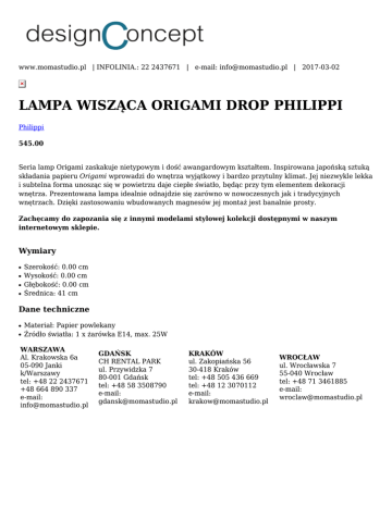 www.momastudio.pl | INFOLINIA.: 22 2437671 | e-mail: [email protected] | 2017-03-02 LAMPA WISZĄCA ORIGAMI DROP PHILIPPI Philippi 545.00 Seria lamp Origami zaskakuje nietypowym i dość awangardowym kształtem. Inspirowana japońską sztuką składania papieru Origami wprowadzi do wnętrza wyjątkowy i bardzo przytulny klimat. Jej niezwykle lekka i subtelna forma unosząc się w powietrzu daje ciepłe światło, będąc przy tym elementem dekoracji wnętrza. Prezentowana lampa idealnie odnajdzie się zarówno w nowoczesnych jak i tradycyjnych wnętrzach. Dzięki zastosowaniu wbudowanych magnesów jej montaż jest banalnie prosty. Zachęcamy do zapozania się z innymi modelami stylowej kolekcji dostępnymi w naszym internetowym sklepie. Wymiary ● ● ● ● Szerokość: 0.00 cm Wysokość: 0.00 cm Głębokość: 0.00 cm Średnica: 41 cm Dane techniczne ● ● Materiał: Papier powlekany Źródło światła: 1 x żarówka E14, max. 25W WARSZAWA Al. Krakowska 6a 05-090 Janki k/Warszawy tel: +48 22 2437671 +48 664 890 337 e-mail: [email protected] GDAŃSK CH RENTAL PARK ul. Przywidzka 7 80-001 Gdańsk tel: +48 58 3508790 e-mail: [email protected] KRAKÓW ul. Zakopiańska 56 30-418 Kraków tel: +48 505 436 669 tel: +48 12 3070112 e-mail: [email protected] WROCŁAW ul. Wrocławska 7 55-040 Wrocław tel: +48 71 3461885 e-mail: [email protected]