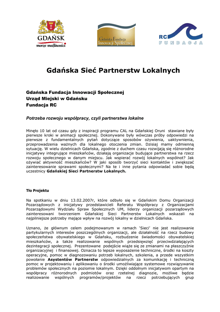 Gdańska Sieć Partnerstw Lokalnych Gdańska Fundacja Innowacji Społecznej Urząd Miejski w Gdańsku Fundacja RC Potrzeba rozwoju współpracy, czyli partnerstwa lokalne Minęło 10 lat od czasu gdy z inspiracji programu CAL na Gdańskiej Oruni stawiane były pierwsze kroki w animacji społecznej. Dokonywane były wówczas próby odpowiedzi na pierwsze z fundamentalnych pytań dotyczące sposobów oŜywienia, uaktywnienia, przeprowadzenia waŜnych dla lokalnego otoczenia zmian. Dzisiaj mamy odmienną sytuację. W wielu dzielnicach Gdańska, zgodnie z duchem czasu rozwijają się róŜnorodne inicjatywy integrujące mieszkańców, działają organizacje budujące partnerstwa na rzecz rozwoju społecznego w danym miejscu. Jak wspierać rozwój lokalnych wspólnot? Jak oŜywiać aktywność mieszkańców? W jaki sposób tworzyć sieci kontaktów i zwiększać zainteresowanie sprawami społecznymi? Na te i inne pytania odpowiadać sobie będą uczestnicy Gdańskiej Sieci Partnerstw Lokalnych. Tło Projektu Na spotkaniu w dniu 13.02.2007r, które odbyło się w Gdańskim Domu Organizacji Pozarządowych z inicjatywy przedstawicieli Referatu Współpracy z Organizacjami Pozarządowymi Wydziału Spraw Społecznych UM, liderzy organizacji pozarządowych zainteresowani tworzeniem Gdańskiej Sieci Partnerstw Lokalnych wskazali na najpilniejsze potrzeby mające wpływ na rozwój lokalny w dzielnicach Gdańska. Uznano, Ŝe głównym celem podejmowanym w ramach ‘Sieci’ nie jest realizowanie partykularnych interesów poszczególnych organizacji, ale działalność na rzecz budowy społeczeństwa obywatelskiego w Gdańsku, rozbudzenie świadomości obywatelskiej mieszkańców, a takŜe realizowanie wspólnych przedsięwzięć przeciwdziałających dezintegracji społecznej. Prezentowane podejście wiąŜe się ze zmianami na płaszczyźnie organizacyjnej i finansowej. Oznacza to lepsze wyposaŜenie techniczne, środki na koszty operacyjne, pomoc w diagnozowaniu potrzeb lokalnych, szkolenia, a przede wszystkim powołanie Asystentów Partnerstw odpowiedzialnych za komunikację i techniczną pomoc w projektowaniu i aplikowaniu o środki umoŜliwiające systemowe rozwiązywanie problemów społecznych na poziomie lokalnym. Dzięki oddolnym inicjatywom opartym na współpracy róŜnorodnych podmiotów oraz rzetelnej diagnozie, moŜliwe będzie realizowanie wspólnych programów/projektów na rzecz potrzebujących grup mieszkańców dzielnic oraz rozwiązywanie dotkliwych społecznie problemów hamujących rozwój lokalny. Kluczem do powodzenia podejmowanych działań będzie podtrzymywanie i rozwój współpracy w osobie partnerów zarówno wśród organizacji pozarządowych jak równieŜ instytucji samorządowych i przedstawicieli biznesu. We współpracy z róŜnorodnymi partnerami lokalni liderzy - organizacje przystępujące do Gdańskiej Sieci Partnerstw Lokalnych, długofalowo wspierać będą rozwój społeczności w poszczególnych dzielnicach Gdańska. Sieć stanie się swoistym bankiem dobrych praktyk i projektów w Gdańsku. W ten sposób ułatwiony zostanie takŜe przepływ dobrych doświadczeń. Projekt Gdańska Sieć Partnerstw Lokalnych skierowany jest do organizacji działających lokalnie w 10 dzielnicach Gdańska: Stogi, Dolne Miasto, Śródmieście, Orunia, Ujeścisko, Morena, Wrzeszcz, Oliwa, Nowy Port, Przymorze. Organizacje poprzez udział w projekcie i uzyskane merytoryczne i organizacyjne wsparcie zamierzają propagować ideę społeczeństwa obywatelskiego i współdziałać w sieci na rzecz tworzenia domów sąsiedzkich rozumianych jako centra społecznościowe, animujące aktywność mieszkańców z ofertą wynikającą z charakteru dzielnic i potrzeb jej mieszkańców. Działania projektowe: Działaniem rozpoczynającym projekt będzie rekrutacja uczestników projektu, reprezentujących dziesięć dzielnic Gdańska. Priorytetowo traktowane będą dzielnice wskazane w Gdańskim programie rewitalizacji obszarów miejskich takie jak: Dolne Miasto, Nowy Port, Letniewo, Orunia, Stogi, Oliwa, Wrzeszcz oraz tzw. ‘sypialnie miasta’ ze słabo rozwiniętą infrastrukturą społeczną m.in. Ujeścisko, Morena, Przymorze. Rozpowszechnienie informacji na temat projektu nastąpiło na konferencji organizowanej przez partnerów projektu pt. „Aktywność Społeczna , Partnerstwo, Ekonomia Społeczna a Rozwój Lokalny” w kwietniu 2008r. W dalszych etapach wskazane przez organizacje uczestniczące w projekcie osoby zostaną przygotowane do pełnienia roli Asystentów Partnerstw Lokalnych. W tym celu 20 osób zostanie włączonych do cyklu szkoleniowego organizowanego przez Fundację RC w ramach Gdańskiej Szkoły Liderów. Zasadniczym działaniem projektu będzie zatrudnienie oraz aktywność dziesięciu Asystentów wykonujących pracę na rzecz Lokalnych Partnerstw, w dziesięciu dzielnicach Gdańska. Podczas spotkań ‘Sieci’ zostanie wypracowana Karta Pracy, określająca zakres wykonywanych przez Asystenta działań. Z załoŜenia praca Asystentów koncentrować się będzie na realnym wsparciu działań podejmowanych przez lokalne partnerstwa oraz wypracowaniu koncepcji projektów będących odpowiedzią na zdiagnozowane potrzeby lokalnych społeczności. Podczas seminarium podsumowującego projekt, na którym zostaną zaprezentowane rezultaty projektu zostaną wypracowane postulaty oraz propozycje stanowiące podstawę do podejmowania kolejnych działań w ramach Gdańskiej Sieci Lokalnych Partnerstw. Planowany okres realizacji: kwiecień 2008r – grudzień 2009r Po uzyskaniu dofinansowania z EFS moŜliwe będzie zatrudnienie asystentów partnerstw lokalnych oraz uzyskanie dofinansowania na wsparcie techniczne. Magdalena Skiba – Urząd Miejski w Gdańsku Marianna Sitek-Wróblewska - Gdańska Fundacja Innowacji Społecznej