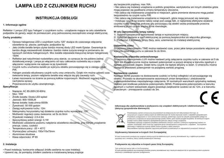 INSTRUKCJA OBSŁUGI 1. Informacje ogólne Reflektor / Lampa LED typu 'halogen' z czujnikiem ruchu - urządzenie mające na celu oświetlanie podjazdów do garaży, wejść do pomieszczeń, przy jednoczesnej oszczędności energii elektrycznej. Napięcie: AC 85-265V,50-60Hz Moc: 10W Źródło światla: Dioda LED epiled Jasność: 900-1000LM Barwa światła: biała zimna 6000k Żywotność: 50 000 godzin Zasięg wykrywania ruchu: 12m Maksymalny horyzontalny kąt działania czujnika ruchu wynoszący: 120° Możliwość regulacji czasu świecenia: od 5s do 8min Wysokość instalacji: 2,5-4,5m Spoczynkowy pobór energii: 0,1W Możliwość ustawienia poziomu natężenia oświetlenia otoczenia, przy którym urządzenie pracuje, czasu, czułości Temperatura pracy: -20 + 40°C Wymiary(bez uchwytu): 150x115x75mm Aluminiowa obudowa Klasa odporności: IP 65 WWW • • • • Ustawienie czasu Za pomocą potencjometru TIME można nastawiać czas, przez jakie lampa pozostanie włączono po wykryciu ostatniego ruchu w zakresie 5s do 8min. Nastawianie włącznika zmierzchowego Za pomocą potencjometru LUX można nastawić próg załączenia czujnika ruchu w zakresie od 5 do 1000 lux. Prowizorycznie można nastawić potencjometr w pozycji skrajnej w kierunku zgodnym z ruchem wskazówek zegara. Dzięki temu czujnik nie będzie aktywny w dzień. O zmierzchu można następnie przestawić potencjometr na pożądaną wartość progową. .ALLTR • Oprawa halogenowa LED z czujnikiem ruchu 120° służąca do czasowego włączania oświetlenia np. placów, parkingów, podjazdów itp. • Jako źródła światła lampa używa bardzo mocnej diody LED marki Epistar. Gwarantuje to bardzo długą niezawodność działania i bardzo niskie zużycie energii w porównaniu do typowych żarników halogenowych. Moc światła odpowiada klasycznej lampie halogenowej 150W. • Reflektor jest natychmiast rozświetlany przy starcie, co oznacza że nie pobiera żadnej dodatkowej energii. Lampa po włączeniu od razu całkowicie rozświetla się a częste włączanie i wyłączanie nie wpływa na jej żywotność • Czujnik ruchu uruchamia światło po wykryciu obiektu poruszającego się w zasięgu czujki PIR. • Halogen posiada wbudowany czujnik ruchu oraz zmierzchu. Dzięki nim można ustawić czas świecenia lampy, poziom natężenia światła oraz włącza się gdy zauważy ruch. • Łatwe mocowanie na ścianie za pomocą kołków rozporowych. Możliwość regulacji kąta nachylenia oprawy. • Przeznaczona do użytku zewnętrznego. Specyfikacja: • • • • • • • • • • • • W celu zamontowania lampy należy: 1/. Solidnie i bezpiecznie zamontować lampę w wyznaczonym miejscu. 2/. Odłączyć zasilanie w sieci elektrycznej za pomocą bezpiecznika lub włącznika głównego. 3./ Podłączyć 3 przewody lampy (fazy, zera, uziemienia) do instalacji elektrycznej. ONIX. Cechy produktu: PL się bezpiecznik prądowy, max.16A.. • Nie zaleca się instalacji urządzenia w pobliżu grzejników, wentylatorów ani innych obiektów gdzie mogą pojawiać się gwałtowne zmiany temperatury otoczenia. • Nie zaleca się instalowania urządzenia w miejscach, gdzie promienie słoneczne mogą padać bezpośrednio na czujnik ruchu PIR. • Nie zaleca się instalowania urządzenia w miejscach, gdzie mogą poruszać się zwierzęta. • Instalując czujnik na ścianie należy wziąć pod uwagę fakt, iż najbardziej efektywne działanie czujnika ruchu następuje podczas gdy poruszający się obiekt/ osoba prostopadle przecina emitowaną przez czujnik wiązkę, a nie równolegle. LAMPA LED Z CZUJNIKIEM RUCHU 2. Instalacja • Przed instalacją koniecznie odłączyć źródło zasilania na czas instalacji. • Upewnić się, że pomiędzy źródłem zasilania a instalowaną lampą znajduje Nastawianie czułości Nastawa SENS pozwala na dostosowanie czułości w funkcji odległości od poruszającego się obiektu. Pozwala na skompensowanie sezonowych zmian temperatury i zredukowanie prawdopodobieństwa niepożądanego załączenia. W normalnych warunkach optymalną nastawą czułości jest środkowe położenie potencjometru SENS. Przekręcenie potencjometru w kierunku zgodnym z ruchem wskazówek zegara powoduje zwiększenie czułości aż do 12m, a w kierunku przeciwnym - zmniejszenie czułości do 3m.