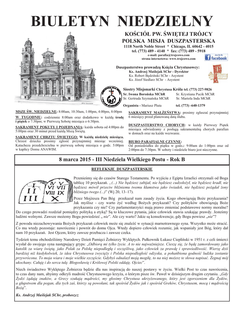 BIULETYN NIEDZIELNY KOĝCIÓà PW. ĝWIĉTEJ TRÓJCY POLSKA MISJA DUSZPASTERSKA 1118 North Noble Street * Chicago, IL 60642 - 4015 tel. (773) 489 - 4140 * fax: (773) 489 - 5918 e-mail: [email protected] strona internetowa: www.trojcowo.com Duszpasterstwo prowadzą KsiĊĪa Chrystusowcy: Ks. Andrzej MaĞlejak SChr - Dyrektor Ks. Robert BĊdziĔski SChr - Asystent Ks. Józef Siedlarz SChr - Asystent Siostry Misjonarki Chrystusa Króla tel. (773) 227-9826 Sr. Iwona BoroĔska MChR Sr. Gertruda SzymaĔska MChR Sr. Krystiana Pucik MChR Sr. Mariola Inda MChR Organista - Mariusz Pluta tel. (773) -640-1379 MSZE ĝW. NIEDZIELNE: 8:00am, 10:30am, 1:00pm, 4:00pm, 8:00pm W TYGODNIU: codziennie 8:00am oraz dodatkowo w kaĪdą ĞrodĊ i piątek o 7:30pm; w Pierwszą SobotĊ miesiąca o 6:30pm. SAKRAMENT POKUTY I POJEDNANIA: kaĪda sobota od 4:00pm do 5:00pm oraz 30 minut przed kaĪdą Mszą ĝwiĊtą. SAKRAMENT CHRZTU ĝWIĉTEGO: W kaĪdą niedzielĊ miesiąca. Chrzest dziecka prosimy zgáosiü przynajmniej miesiąc wczeĞniej. Katacheza przedchrzcielna w pierwszą sobotĊ miesiąca o godz. 5:00pm w kaplicy Domu ANAWIM. SAKRAMENT MAàĩEēSTWA: prosimy zgáaszaü przynajmniej 6 miesiĊcy przed planowaną datą Ğlubu. DUSZPASTERSTWO CHORYCH: w kaĪdy Pierwszy Piątek miesiąca odwiedzamy z posáugą sakramentalną chorych parafian w domach oraz na kaĪde wezwanie. BIURO PARAFIALNE CZYNNE: Od poniedziaáku do piątku w godz.: 9:00am do 1:00pm oraz od 2:00pm do 7:30pm. W soboty i niedziele biuro jest nieczynne. 8 marca 2015 - III Niedziela Wielkiego Postu - Rok B REFLEKSJE DUSZPASTERSKIE PrzenieĞmy siĊ do czasów Starego Testamentu. Po wyjĞciu z Egiptu Izraelici otrzymali od Boga tablicĊ 10 przykazaĔ. „(...) Nie bĊdziesz zabijaá, nie bĊdziesz cudzoáoĪyá, nie bĊdziesz kradá, nie bĊdziesz mówiá przeciw bliĨniemu twemu káamstwa jako Ğwiadek, nie bĊdziesz poĪądaá Īony bliĨniego twego (...)” (Wj 20, 13–17). Przez MojĪesza Pan Bóg przekazaá nam zasady Īycia. Kogo obowiązują BoĪe przykazania? Jak myĞlisz - czy warto Īyü wedáug BoĪych przykazaĔ? Czy polityków obowiązują BoĪe przykazania czy nie? Czy parlamentarzyĞci mają prawo zmieniaü podstawowe normy moralne? Do czego prowadzi rozdziaá pomiĊdzy polityką a etyką? Są to kluczowe pytania, jakie czáowiek stawia szukając prawdy. JesteĞmy ludĨmi wolnymi. Zawsze moĪemy Bogu powiedzieü „ nie”. Ale czy warto? Jakie są konsekwencje, gdy Bogu powiesz „nie”? Z powodu niezachowywania BoĪych przykazaĔ czáowiek moĪe siĊ znaleĨü w sytuacji marnotrawnego syna. Wszystko moĪe straciü. Co mu wtedy pozostaje: nawrócenie i powrót do domu Ojca. Wtedy dopiero czáowiek rozumie, jak wspaniaáy jest Bóg, który daá nam 10 przykazaĔ. Jest Ojcem, który zawsze przebacza i zawsze czeka. TydzieĔ temu obchodziliĞmy Narodowy DzieĔ PamiĊci ĩoánierzy WyklĊtych. Puákownik àukasz CiepliĔski w 1951 r. z celi Ğmierci wysáaá do swojego syna nastĊpujący gryps: „Odbiorą mi tylko Īycie. A to nie najwaĪniejsze. CieszĊ siĊ, Īe bĊdĊ zamordowany jako katolik za wiarĊ ĞwiĊtą, jako Polak za PolskĊ niepodlegáą i szczĊĞliwą, jako czáowiek za prawdĊ i sprawiedliwoĞü. WierzĊ dziĞ bardziej niĪ kiedykolwiek, Īe idea Chrystusowa zwyciĊĪy i Polska niepodlegáoĞü odzyska, a pohaĔbiona godnoĞü ludzka zostanie przywrócona. To moja wiara i moje wielkie szczĊĞcie. GdybyĞ odnalazá moją mogiáĊ, to na niej moĪesz te sáowa napisaü. ĩegnaj mój ukochany. CaáujĊ i do serca tulĊ. BáogosáawiĊ i Królowej Polski oddajĊ. Ojciec”. Niech Ğwiadectwo WyklĊtego ĩoánierza bĊdzie dla nas inspiracją do naszej postawy w Īyciu. Wielki Post to czas nawrócenia, to czas dany nam, abyĞmy odkryli madroĞü Chrystusowego krzyĪa, o którym pisze Ğw. Paweá w dzisiejszym drugim czytaniu. „Gdy ĩydzi Īądają znaków, a Grecy szukają mądroĞci, my gáosimy Chrystusa ukrzyĪowanego, który jest zgorszeniem dla ĩydów, a gáupstwem dla pogan, dla tych zaĞ, którzy są powoáani, tak spoĞród ĩydów jak i spoĞród Greków, Chrystusem, mocą i mądroĞcią BoĪą”. Ks. Andrzej MaĞlejak SChr, proboszcz INTENCJE MSZALNE 8 marca 2015 - III Niedziela Wielkiego Postu 8:00 +Helena Szlaga i zmarli z rodziny 8:00 +Julian Jagielnik w 2 rocznicĊ Ğmierci 10:30 +Wacáaw Moniuszko w 2 rocznicĊ Ğmierci 10:30 ++Ludwika i Mieczysáaw Koszyk 10:30 +Stanisáaw Tomczak w rocznicĊ Ğmierci 1:00 +Stanisáaw Rutkowski w 15 rocznicĊ Ğmierci 4:00 O BoĪe báogosáawieĔstwo i opiekĊ dla syna 8:00 +Wacáaw BrzeziĔski w rocz. Ğmierci intencja od rodziny 8:00 +Barbara Markowska i +Zbigniew Barcik 9 marca 2015 - Poniedziaáek 8:00 O BoĪe báogosáawieĔstwo i o ochronĊ dla redaktora Wojciecha SumliĔskiego 8:00 Za dusze w czyĞücu cierpiące 8:00 +ks. Marian Baranowski 10 marca 2015 - Wtorek 8:00 O BoĪe báog.i o ochronĊ dla red. Wojciecha SumliĔskiego 8:00 Za dusze w czyĞücu cierpiące 7:30 Za OjczyznĊ i polegáych w SmoleĔsku 11 marca 2015 - ĝroda 8:00 O BoĪe báog.i o ochronĊ dla red. Wojciecha SumliĔskiego 8:00 Za dusze w czyĞücu cierpiące 7:30 W int. Parafian, Przyjacióá i Dobrodziejów, za zmaráych Parafian, Przyjacóá i Dobrodziejów, z podziĊk. za otrzymane áaski dla GraĪyny i jej rodziny, o BoĪe báog. i potrzebne áaski dla Dominiki i jej rodziny, dziĊkcz. dobremu Bogu za opiekĊ za wstaw. Maryi i Ğw. Anioáów, o áaskĊ wytrwania w dobrym dla ludzi uzaleĪnionych w rodzinie, za zmaráych z rodziny, o BoĪe báog. i potrzebne áaski przez wstaw. Maryi dla KsiĊĪy i Sióstr w naszej parafii, +ks. Marian Kurnyta, o pomoc i opiekĊ dla Katarzyny i jej dzieci: Ani i Wojciecha, w int. dzieci z podziĊkowanie za nie i proĞbą o potrzebne áaski dla nich i nas rodziców w prowadzeniu ich do Boga, w int. braci, sióstr i ich rodzin oraz naszej rodziny, w int. ks. Tomasza Ludwickiego przez wst. Ğw. Antoniego - P.Malec, w int. ks. Józefa Siedlarz przez wst. Ğw.