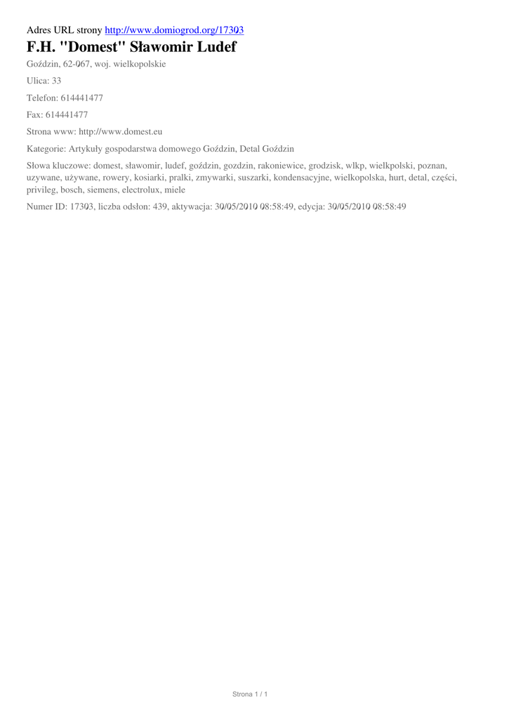 Adres URL strony http://www.domiogrod.org/17303 F.H. "Domest" Sławomir Ludef Goździn, 62-067, woj. wielkopolskie Ulica: 33 Telefon: 614441477 Fax: 614441477 Strona www: http://www.domest.eu Kategorie: Artykuły gospodarstwa domowego Goździn, Detal Goździn Słowa kluczowe: domest, sławomir, ludef, goździn, gozdzin, rakoniewice, grodzisk, wlkp, wielkpolski, poznan, uzywane, używane, rowery, kosiarki, pralki, zmywarki, suszarki, kondensacyjne, wielkopolska, hurt, detal, części, privileg, bosch, siemens, electrolux, miele Numer ID: 17303, liczba odsłon: 439, aktywacja: 30/05/2010 08:58:49, edycja: 30/05/2010 08:58:49 Strona 1 / 1