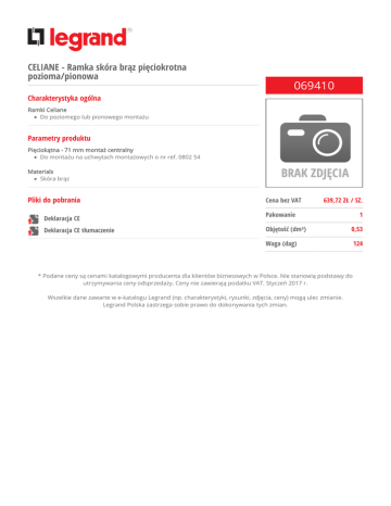 CELIANE - Ramka skóra brąz pięciokrotna pozioma/pionowa 069410 Charakterystyka ogólna Ramki Celiane Do poziomego lub pionowego montażu Parametry produktu Pięciokątna - 71 mm montaż centralny Do montażu na uchwytach montażowych o nr ref. 0802 54 Materials Skóra brąz Pliki do pobrania Deklaracja CE Deklaracja CE tłumaczenie Cena bez VAT 639,72 ZŁ / SZ. 1 Pakowanie Objętość (dm³) 0,53 Waga (dag) 124 * Podane ceny są cenami katalogowymi producenta dla klientów biznesowych w Polsce. Nie stanowią podstawy do utrzymywania ceny odsprzedaży. Ceny nie zawierają podatku VAT. Styczeń 2017 r. Wszelkie dane zawarte w e-katalogu Legrand (np. charakterystyki, rysunki, zdjęcia, ceny) mogą ulec zmianie. Legrand Polska zastrzega sobie prawo do dokonywania tych zmian.