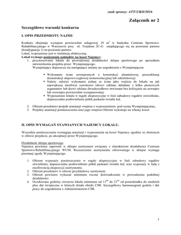 znak sprawy: ATT/2/KO/2016 Załącznik nr 2 Szczegółowe warunki konkursu I. OPIS PRZEDMIOTU NAJMU Konkurs obejmuje wynajem powierzchni usługowej 18 m2 w budynku Centrum SportowoRehabilitacyjnego w Warszawie przy ul. Trojdena 2C-G znajdującego się na poziomie parteru (kondygnacja 1) na poziomie parteru. Lokal, wyposażony jest w instalację elektryczną. Lokal wymaga poniesienia nakładów na koszt Najemcy: 1. przystosowanie lokalu do prowadzonej działalności sklepu sportowego po uprzednim zatwierdzeniu projektu przez Wynajmującego. Wynajmujący dopuszcza się następujące zmiany po uzgodnieniu z Wynajmującym Wykonanie ścian zewnętrznych o konstrukcji aluminiowej, przeszklonej (konstrukcji słupowo-ryglowej termoizolacyjnej lub szkieletowej) Należy założyć wykonanie jednej ze ścian jako wejścia do lokalu na jak największej możliwie szerokości (drzwi szklane składane z kilku pionowych segmentów lub drzwi szklane dwuskrzydłowe otwierane bez kolizyjnie na zewnątrz lub wewnątrz powierzchni wynajmowanej. Wyposażenie lokalu w regały ekspozycyjne w linii zabudowy regałów oświetlenie, dopuszczalne podświetlenie półek paskami światła led, 2. Oferent przedstawi projekt aranżacji wnętrza z wyposażeniem pod ocenę Wynajmującemu,. 3. Projekty aranżacji pomieszczenia oraz jego wnętrza Oferent wykonuje na własny koszt. II. OPIS WYMAGAŃ STAWIANYCH NAJEMCY LOKALU. Wszystkie pomieszczenie wymagają aranżacji i wyposażenia na koszt Najemcy zgodnie ze złożonym w ofercie projekcie, po akceptacji przez Wynajmującego. Działalność sklepu sportowego Najemca powinien zapewnić w sklepie asortyment związany z charakterem działalności Centrum Sportowo-Rehabilitacyjnego WUM. Rozszerzenie asortymentu oferowanego w sklepie wymaga pisemnej zgody Wynajmującego. 1. Oferent wyposaży pomieszczenie w regały ekspozycyjne w linii zabudowy regałów oświetlenie, dopuszczalne podświetlenie półek paskami światła led, oraz wyposaży w ladę z możliwością ekspozycji asortymentu. 2. Oferent przedstawi w ofercie przykładowy asortyment. 3. Oferent powinien wykazać minimum roczne doświadczenie w prowadzeniu podobnej działalności. 4. Oczekiwane godziny otwarcia lokalu minimum od 1100 do 2100 od poniedziałku do niedzieli plus dni świąteczne w których działa obiekt CSR. Szczegółowy harmonogram godzin i dni pracy do uzgodnienia z Administratorem CSR. 1 znak sprawy: ATT/2/KO/2016 Załącznik nr 2 OCZEKIWANIA WYNAJMUJĄCEGO WOBEC CHARAKTERU DZIAŁALNOŚCI SKLEPU SPORTOWEGO W CSR. CHARAKTER WNĘTRZA - ZAŁOŻENIA - wnętrze odpowiadające aktualnym trendom sprzedaży towarów sportowych - sklep sportowy usytuowany w holu przylegającym do hali basenowej (lokalizacja pomieszczenia dostępna w administracji budynku) CHARAKTER POMIESZCZENIA - zabudowa szklana typu akwarium, jedną stroną przyklejona do ściany holu - z pozostałych 3 ścian – jedna mobilna/składana/rozsuwana, powodująca otwarcie sklepu z możliwością penetracji towarów przez klienta - aranżacja wnętrza – przejrzysta, nowoczesna dostosowana do samoobsługi - asortyment związany z charakterem CSR: towary pływackie (kostiumy kąpielowe, klipsy na nos, zatyczki do uszu, czepki kąpielowe, okulary, klapki, ręczniki i szlafroki, opaski kompresyjne, rurki czołowe, worki/torby/plecaki na sprzęt) towary higieniczne (mydło, płyn do kąpieli, szampon, higiena intymna, pieluchomajtki dla dzieci) ELEMENTY DEKORACYJNE - elementy graficzne nawiązujące do charakteru elewacji budynków i specyfiki obiektu, tzn. sport akademicki (sekcje) i wyczynowy (pływanie, gry zespołowe: piłka siatkowa, koszykowa, ręczna, tenis ziemny). - możliwość wykorzystania pomysłów aranżacyjnych zastosowanych zarówno w elewacji, jak i we wnętrzach (zieleń na ścianie itp.) - uwzględnienie w wystroju loga Warszawskiego Uniwersytetu Medycznego i Centrum Sportowo-Rehabilitacyjnego III. OGRANICZENIA DOTYCZĄCE PROWADZENIA DZIAŁALNOŚCI: a. wykluczone instalowanie automatów do gier i do gier o niskich wygranych, b. wykluczone prowadzenie działalności handlowej, w tym promocyjnej i informacyjnej, produktami powodującymi lub mogącymi powodować działanie podobne do substancji psychotropowych lub odurzających, w szczególności tzw. dopalaczami, nawet jeżeli produkty te nie są przeznaczone do spożycia – Stanowiskiem nr 170/10 Zarządu Dzielnicy Śródmieście m.st. Warszawy z dnia 14.07.2010 r., 2 znak sprawy: ATT/2/KO/2016 Załącznik nr 2 IV. ZAWARTOŚĆ OFERTY 1. załącznik nr 1 oferty stanowią dokumenty ujęte w §5 regulaminu konkursu ofert (regulamin konkursu podany jako załącznik nr 3 ogłoszenia o konkursie). 2. załącznik nr 2 oferty stanowi wypełniony formularz oferty (podany jako załącznik nr 4 ogłoszenia o konkursie), 3. załącznik nr 3 oferty stanowi projekt aranżacji i wystroju lokalu zaproponowany przez Oferenta, 4. załącznik nr 4 oferty stanowi opis funkcjonowania lokalu (ilość i funkcje zatrudnionego personelu) przedstawiony przez Oferenta, 5. załącznik nr 5 oferty stanowi propozycja Oferenta w zakresie asortymentu. V. ZASADY WYŁONIENIA ZWYCIĘZCY 1. Podstawę oceny będą stanowiły: - wysokość oferowanego czynszu – 60% - aranżacja lokalu wraz z wyposażeniem wnętrza – 20%. - Dotychczasowe doświadczenia w wymaganej działalności, referencje – 20% 2. Konkurs ofert składa się z dwóch części: jawnej i niejawnej. 3. Część niejawna konkursu zawiera prace komisji konkursowej. 4. Zapis Regulaminu Konkursu Ofert na Wynajem Powierzchni Użytkowych dotyczący ceny wywoławczej w przedmiotowym konkursie nie ma zastosowania. 5. Zapis Regulaminu dotyczący licytacji stawki w przedmiotowym konkursie nie ma zastosowania. 6. Zapis §6 Regulaminu w przedmiotowym konkursie nie ma zastosowania. 7. Oferent jest związany ofertą w ciągu 100 dni od dnia otwarcia ofert. 7.1. Oferent samodzielnie lub na wniosek Wynajmującego może przedłużyć termin związania ofert