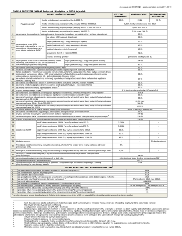 obowiązuje od 2012.10.24 – zastępuje tabelę z dnia 2011.09.19 TABELA PROWIZJI I OPŁAT Pożyczek i Kredytów w SKOK Kujawiak OPŁATY - POŻYCZKI/KREDYTY1 POŻYCZKI ODNAWIALNE Kwota wnioskowanej pożyczki/kredytu do 8000 ZŁ 1 Przygotowawcza 2 KONSUMPCYJNE 20 ZŁ Kwota wnioskowanej pożyczki/kredytu powyżej 8000 do 80 000 ZŁ 25 ZŁ 0,5% max 500 ZŁ Kwota wnioskowanej pożyczki/kredytu powyżej 300 000 ZŁ 0,3% max 1500 ZŁ 2 za wezwanie do uzupełnienia / zaktualizowania dokumentacji udzielonej pożyczki/kredytu i jej/jego zabezpieczeń 20 ZŁ 3 za odpis z KRS/ewidencji działalności 50 ZŁ odpis (elektroniczny) z ksiąg wieczystych zupełny 70 ZŁ odpis (elektroniczny) z ksiąg wieczystych aktualny 40 ZŁ odpis z ksiąg wieczystych (za stronę) 10 ZŁ pozyskanie danych w rejestrze PESEL 40 ZŁ 5 6 za pozyskanie przez SKOK informacji, dokumentów w celu ich uzupełnienia (nie dostarczonych przez klienta na żądanie SKOK) 7 8 9 10 11 12 13 14 15 16 17 18 19 20 21 22 23 24 25 26 27 28 wypis z ewidencji gruntów za pozyskanie przez SKOK na wniosek (zlecenie) klienta informacji, dokumentów w celu ich uzupełnienia w dokumentacji pożyczkowo kredytowej poniesiona opłata plus 10 ZŁ odpis (elektroniczny) z ksiąg wieczystych zupełny 100 ZŁ odpis (elektroniczny) z ksiąg wieczystych aktualny 80 ZŁ za wydanie opinii dotyczącej historii kredytowej Członka Kasy Wydanie zaświadczenia o wysokości zapłaconych odsetek i opat związanych pożyczką /kredytem Opłata za zbadanie treści księgi wieczystej nieruchomości, dokonane przez pracownika Kasy będące wynikiem braku dostarczania wymaganego odpisu z KW przez kredytobiorcę/Pożyczkobiorcę, potwierdzającego dokonanie wpisu ustanawiającego zabezpieczenie lub potwierdzającego dokonane zmiany za wydanie zaświadczenia lub innej informacji o posiadanym kredycie/pożyczce i stanie zadłużenia z wyjątkiem wydruku z operacji 412 za wydanie zaświadczenia o spłacie / zamknięciu / stanie zadłużenia rachunku pożyczki /kredytu za zmianę (modyfikacją) planu (harmonogramu) spłaty pożyczki/kredytu – na wniosek klienta za zmianę warunków umowy sporządzenie aneksu 50 ZŁ 25 ZŁ 50 ZŁ 20 ZŁ 20 ZŁ 50 ZŁ 50 ZŁ 3 4 1 % kwoty wypłacanej pożyczki/kredytu/linii 250 ZŁ 50 ZŁ z tytułu podwyższonego ryzyka za wystawienie zaświadczenia zawierającego zgodę na: wykreślenie / zamianę/ zmniejszenie sumy hipoteki5 za wystawienie zaświadczenia zawierającego zgodę na: wykreślenie zastawu rejestrowego 6 za zmianę/zwolnienie zabezpieczenia rzeczowego pożyczki/kredytu w trakcie trwania danej pożyczki/kredytu dla salda zaangażowań do 50 000 ZŁ za zmianę/zwolnienie zabezpieczenia rzeczowego pożyczki/kredytu w trakcie trwania danej pożyczki/kredytu dla salda zaangażowań pow. 50 001 ZŁ do 500 000 ZŁ za zmianę/zwolnienie zabezpieczenia rzeczowego pożyczki/kredytu w trakcie trwania danej pożyczki/kredytu dla salda zaangażowań pow.500 000 ZŁ za zmianę poręczyciela w trakcie trwania umowy pożyczki/kredytu za wydanie zaświadczenia o wygaśnięciu zobowiązania zabezpieczonego przewłaszczeniem z tytułu czynności związanych z ustanawianiem zastawu rejestrowego za dokonanie przez SKOK oszacowania wartości nieruchomości mającej stanowić zabezpieczenia pożyczki/kredytu z tytułu przeprowadzonej kontroli wartości zabezpieczenia w trakcie trwania kredytu/pożyczki 30 ZŁ 0,35% kwoty wnioskowanej min. 30 zł Kwota wnioskowanej pożyczki/kredytu powyżej 80 000 ZŁ do 300 000 ZŁ 4 MIESZKANIOWE/ HIPOTECZNE 50 ZŁ 0,5% max 500 ZŁ 1000 ZŁ 50 ZŁ za każdego poręczyciela 20 ZŁ 100 ZŁ 250 ZŁ 250 ZŁ 7 29 część nieoprocentowana 250 ZŁ / wymóg wydania kartą 125 ZŁ 3,75 ZŁ - - 30 część nieoprocentowana 500 ZŁ / wymóg wydania kartą 250 ZŁ 7,50 ZŁ - - część nieoprocentowana 1 000 ZŁ / wymóg wydania kartą 500 ZŁ 15 ZŁ - - część nieoprocentowana 2 000 ZŁ / wymóg wydania kartą 1 000 ZŁ 30 ZŁ - - część nieoprocentowana 3 000 ZŁ / wymóg wydania kartą 1 500 ZŁ 45 ZŁ - - - - 3% kwoty pożyczki 3% - - 1,5% - - 31 dodatkowa dla LPP 32 33 34 Wydanie promesy 35 Prowizja za przedłużenie umowy pożyczki odnawialnej „chwilówki” na kolejny okres roczny naliczana od kwoty przyznanego limitu 36 Prowizja za przedłużenie umowy pożyczki odnawialnej na kolejny okres roczny naliczana od kwoty przyznanego limitu 37 38 39 40 za wizytę u klienta w celu weryfikacji wyceny wartości nieruchomości mającej stanowić zabezpieczenie pożyczki/kredytu oprocentowanie pożyczek przeterminowanych w skali roku Sporządzenie rozliczenia pożyczki/kredytu Sporządzenie odpisu lub potwierdzonej za zgodność z oryginałem kopii dokumentu związanego z umową pożyczki/kredyty w tym umowy/ aneksu 200 ZŁ czterokrotność stopy kredytu lombardowego NBP 120 ZŁ 25 ZŁ OPŁATY WINDYKACYJNE I RESTRUKTURYZACYJNE8 1. 2. 3. 4. 5. 6. 7. 8. 9. 10. 11. 1za upomnienie lub wezwanie do zapłaty wysłane do pożyczko/kredytobiorcy 2za zawiadomienie wysłane do poręczyciela 3za wezwanie do wykupu weksla9 za sporządzenie monitu wzywającego do uregulowania powstałego niedopuszczalnego salda debetowego na rachunku 4za czynności windykacji terenowej dla kwoty wymaganej 10 5za monit telefoniczny/sms 6za wniosek o udostępnienie danych meldunkowych (z tytułu ustalenia adresu) 7za restrukturyzację (naliczana od kwoty zadłużenia pozostającego do spłaty) 8odsetki umowne od zawartej (ugody) restrukturyzacji (nie mniej niż odsetki ustawowe) 9prowizja z tytułu renegocjacji pożyczki/kredytu (przeterminowanego*) w dniu renegocjacji) prowizja z tytułu renegocjacji pożyczki/kredytu (nie przeterminowanego*) w dniu renegocjacji) 35 ZŁ 25 ZŁ 35 ZŁ 10 ZŁ 5% kwoty min 50 ZŁ max 500 ZŁ 10 ZŁ/5 ZŁ 50 ZŁ 1% nie mniej niż 50 i nie więcej niż 500 zł 18,5% 3% 1% *) przeterminowanie uznaje się zobowiązanie (ratę) w dniu następnym po dniu, w którym przypadał termin spłaty (ustalony zgodnie z planem spłaty). 
