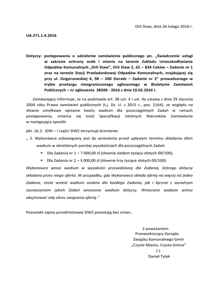 Orli Staw, dnia 26 lutego 2016 r. UA.271.1.4.2016 Dotyczy: postępowania o udzielenie zamówienia publicznego pn. „Świadczenie usługi w zakresie ochrony osób i mienia na terenie Zakładu Unieszkodliwiania Odpadów Komunalnych „Orli Staw”, Orli Staw 2, 62 – 834 Ceków – Zadanie nr 1 oraz na terenie Stacji Przeładunkowej Odpadów Komunalnych, znajdującej się przy ul. Dzigorzewskiej 4, 98 – 200 Sieradz – Zadanie nr 2” prowadzonego w trybie przetargu nieograniczonego ogłoszonego w Biuletynie Zamówieo Publicznych – nr ogłoszenia 38200 - 2016 z dnia 19.02.2016 r. Zamawiający informuje, że na podstawie art. 38 ust. 4 i ust. 4a ustawy z dnia 29 stycznia 2004 roku Prawo zamówieo publicznych (t.j. Dz. U. z 2015 r., poz. 2164), ze względu na słowne omyłkowe opisanie kwoty wadium dla poszczególnych Zadao w ramach postępowania, zmienia się treśd Specyfikacji Istotnych Warunków Zamówienia w następujący sposób: pkt. 16.2. IDW – I części SIWZ otrzymuje brzmienie: „ 2. Wykonawca zobowiązany jest do wniesienia przed upływem terminu składania ofert wadium w określonych poniżej wysokościach dla poszczególnych Zadao: Dla Zadania nr 1 – 7 000,00 zł (słownie siedem tysięcy złotych 00/100), Dla Zadania nr 2 – 3 000,00 zł (słownie trzy tysiące złotych 00/100). Wykonawca wnosi wadium w wysokości przewidzianej dla Zadania, którego dotyczy składana przez niego oferta. W przypadku, gdy Wykonawca składa ofertę na więcej niż jedno Zadanie, może wnieśd wadium osobno dla każdego Zadania, jak i łącznie z wyraźnym zaznaczeniem jakich Zadao wniesione wadium dotyczy. Wniesione wadium winno obejmowad cały okres związania ofertą.” Pozostałe zapisy przedmiotowej SIWZ pozostają bez zmian. Z poważaniem Przewodniczący Zarządu Związku Komunalnego Gmin „Czyste Miasto, Czysta Gmina” (-) Daniel Tylak