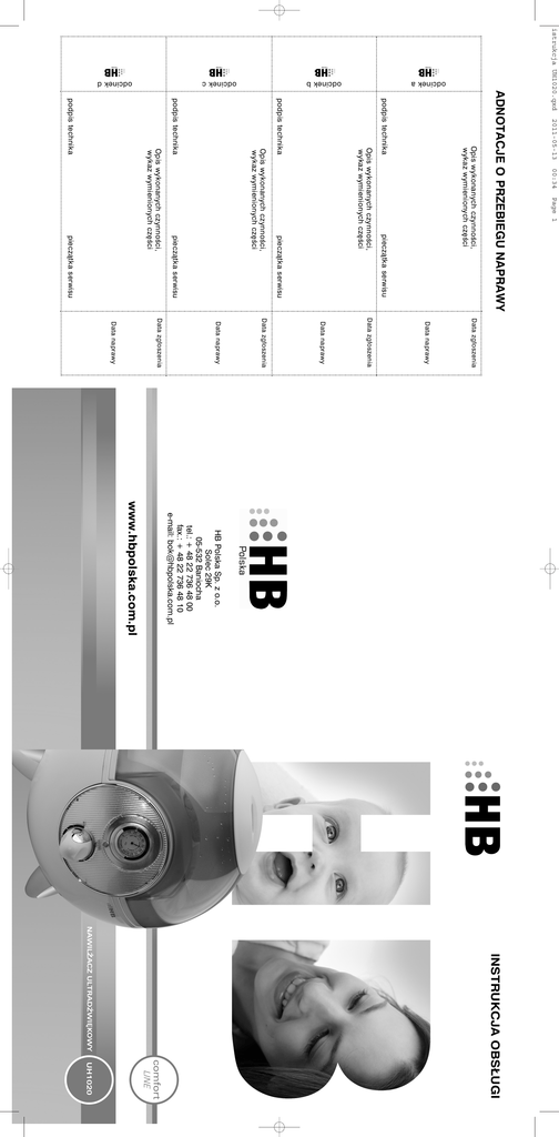 istrukcja UH1020.qxd 2011-05-13 00:34 Page 1 ADNOTACJE O PRZEBIEGU NAPRAWY pieczątka serwisu Opis wykonanych czynności, wykaz wymienionych części podpis technika odcinek a pieczątka serwisu Opis wykonanych czynności, wykaz wymienionych części podpis technika odcinek b pieczątka serwisu Opis wykonanych czynności, wykaz wymienionych części podpis technika odcinek c pieczątka serwisu Opis wykonanych czynności, wykaz wymienionych części podpis technika Data zgłoszenia Data naprawy Data zgłoszenia Data naprawy Data zgłoszenia Data naprawy Data zgłoszenia Data naprawy HB Polska Sp. z o.o. Solec 29K 05-532 Baniocha tel.: + 48 22 736 48 00 fax.: + 48 22 736 48 10 e-mail: [email protected] www.hbpolska.com.pl INSTRUKCJA OBSŁUGI odcinek d istrukcja UH1020.qxd 2011-05-13 GRATULUJEMY! 00:34 Page 4 Kupując nawilżacz marki HB, wybrali Państwo jeden z najlepszych nawilżaczy powietrza dostępnych obecnie na rynku. Przepisy bezpieczeństwa: Przed rozpoczęciem użytkowania nawilżacza, należy dokładnie zapoznać się z niniejszą instrukcją obsługi i bezwzględnie jej przestrzegać. Instrukcję obsługi wraz z dowodem zakupu należy przechowywać w łatwo dostępnym miejscu. z z z z z z z z z z z z z z z z z z z z z z Należy upewnić się, że napięcie w sieci jest takie samo jak wskazane na urządzeniu. Zbiornik należy napełniać tylko czystą, zimną najlepiej filtrowaną wodą. W celu uniknięcia pożaru, względnie wstrząsu elektrycznego należy podłączyć urządzenie bezpośrednio do gniazdka elektrycznego całkowicie wsuwając do niego wtyczkę. Nie należy używać kabla przedłużającego. Zawsze należy wyłączać urządzenie ze źródła prądu, jeżeli następuje napełnianie albo opróżnianie zbiornika wodą, zamiana akcesoriów lub czyszczenie urządzenia. Niniejszy sprzęt nie jest przeznaczony do użytkowania przez osoby (w tym dzieci) o ograniczonej zdolności fizycznej, czuciowej lub psychicznej, osoby nie mające doświadczenia lub znajomości sprzętu, chyba, że odbywa się to pod nadzorem lub zgodnie z instrukcją użytkowania sprzętu, przekazaną przez osoby odpowiadające za ich bezpieczeństwo. Należy zwrócić uwagę, aby dzieci nie bawiły się sprzętem. NIE WOLNO wyciągać wtyczki nawilżacza wilgotnymi rękami. NIE WOLNO uruchamiać urządzenia, jeśli zbiornik jest pusty. Urządzenie przeznaczone jest wyłącznie do użytku przez osoby dorosłe i powinno znajdować się poza zasięgiem dzieci. Przed przesunięciem urządzenia lub podniesieniem zbiornika należy je wyłączyć i wyciągnąć wtyczkę z gniazdka. Przed użyciem należy sprawdzić, czy urządzenie nie jest uszkodzone, należy zwrócić szczególną uwagę na przewód zasilający. Jeżeli jakakolwiek część jest uszkodzona, NIE WOLNO korzystać z urządzenia. NIE WOLNO włączać urządzenia, gdy w pobliżu znajdują się wybuchowe i/lub łatwopalne opary. Nie należy wystawiać urządzenia na działanie promieni słonecznych, gorących powierzchni, wilgoci, ostrych krawędzi i tym podobnych. Nie stawiać nawilżacza w pobliżu nieosłoniętego płomienia, ani w pobliżu urządzeń kuchennych lub grzewczych. W celu zapewnienia właściwego działania urządzenia należy upewnić się, czy zostało ono umieszczone na twardej, wyrównanej oraz wodoszczelnej powierzchni. Przewód zasilający nie powinien zwisać ze stołu, blatu lub tp., ani dotykać żadnych rozgrzanych powierzchni. Urządzenie przeznaczone jest WYŁĄCZNIE do użytku domowego. NIE WOLNO zanurzać urządzenia w wodzie lub jakimkolwiek innym roztworze. Do nawilżacza NIE WOLNO nalewać żadnego rodzaju olejków eterycznych ani zapachowych. Przed pierwszym użyciem urządzenia, należy upewnić się czy wszystkie zabezpieczenia zostały z niego usunięte (folia itp.). Jeżeli nawilżacz nie będzie używany przez dłuższy okres czasu, należy wylać wodę ze zbiornika, a następnie wyczyścić i wysuszyć dokładnie urządzenie. Urządzenie nie jest przeznaczone do użytku na dworze. W przypadku awarii lub uszkodzenia urządzenia albo któregokolwiek z jego elementów, urządzenie należy dostarczyć Sprzedawcy albo Autoryzowanemu Punktowi Serwisowemu w celu przeprowadzeniu naprawy albo wymiany. 1 Życzymy satysfakcji z użytkowania zakupionego urządzenia i zapraszamy do zapoznania się z pozostałą ofertą naszej firmy na stronie internetowej www.hbpolska.com.pl. Dane techniczne: Wydajność 10–320 ml/h Pojemność zbiornika 3.3 l. Max. czas pracy przy najwyższej wydajności 10 h Płynna regulacja mocy nawilżania Funkcja jonizatora powietrza Miernik wilgotności powietrza Automatyczne wyłączanie po opróżnieniu zbiornika Napięcie: 220–240 V; 50/60 Hz Moc: 30 W Moc jonizacji: < – 0.05 PPM Głośność urządzenia: <35dB (A) Wymienny wkład filtrujący wodę WCF100 Waga produktu: 1,73 kg KARTA GWARANCYJNA MODEL PRODUKTU . . . . . . . . . . . . . . . . . . . . . . . . . . . . . . . . . . . . . . . NR SERYJNY . . . . . . . . . . . . . . . . . . . . . . . . . . . . . . . . . . . . . . . . . . . . . . . DATA SPRZEDAŻY . . . . . . . . . . . . . . . . . . . . . . . . . . . . . . . . . . . . . . . . Na produkt udziela się gwarancji na okres 24 miesięcy, która obejmuje wady powstałe z przyczyn tkwiących w sprzedanym urządzeniu. Gwarant zobowiązuje się do bezpłatnego usunięcia ewentualnej niesprawności urządzenia, pod warunkiem wykorzystywania go zgodnie z przeznaczeniem i zaleceniami Instrukcji Obsługi oraz przedstawienia prawidłowo wypełnionej karty gwarancyjnej wraz oryginalnym dowodem zakupu. Naprawa gwarancyjna urządzenia zostanie wykonana w możliwie najkrótszym terminie, nie przekraczającym 14 dni roboczych od daty zgłoszenia usterki. Termin ten może w wyjątkowych przypadkach ulec wydłużeniu do 21 dni roboczych, jeżeli naprawa będzie wymagać sprowadzenia części zamiennych z zagranicy. Zakres niniejszej Gwarancji nie obejmuje żadnych uszkodzeń mechanicznych. z z z z