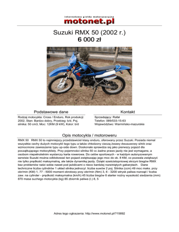Suzuki RMX 50 (2002 r.) 6 000 zł Podstawowe dane Rodzaj motocykla: Cross / Enduro, Rok produkcji: 2002, Stan: Bardzo dobry, Przebieg: b/d, Poj. silnika: 50 cm3, Moc: 12KM (9 kW), Kolor: b/d Kontakt Sprzedający: Rafał Telefon: 089/533-15-63 Województwo: Warmińsko-mazurskie Opis motocykla / motoroweru RMX 50 RMX 50 to najmniejszy przedstawiciel klasy enduro, oferowany przez Suzuki. Posiada niemal wszystkie cechy dużych motocykli tego typu a także chłodzony cieczą żwawy dwusuwowy silnik oraz wzmocnione zawieszenie typu up-side down. Doskonale sprawdza się jako pierwszy pojazd dla początkującego motocyklisty. Przy pojemności silnika 50 cc żadne prawo jazdy nie jest wymagane, a osobom niepełnoletnim wystarczy karta rowerowa. Do celów sportowych - w każdym autoryzowanym serwisie Suzuki można odblokować ten pojazd zwiększając jego moc do ok. 8 KM, co pozwala zwiększyć nie tylko prędkość maksymalną, ale także dynamikę jazdy. Dzięki sześcistopniowej skrzyni biegów RMX bez problemów radzi sobie nawet pod jeźdźcami o nieco bardziej rozwiniętych gabarytach. Dane techniczne liczba cylindrów 1 układ silnika jednocyl. liczba suwów 2 poj. Silnika (ccm) 49 moc maks. przy obr/min (KM) 1, 77 - 5000 moment obrotowy przy obr/min (Nm) 3, 6 - 3200 wtrysk paliwa rozrząd / liczba zaw. na cylinder - prędkość maksymalna (km/h) 45 liczba biegów 6 starter nożny wysokość siedzenia (mm) 870 masa suchego motocykla (kg) 85 zbiornik paliwa (l.) 8, 5 Adres tego ogłoszenia: http://www.motonet.pl/?15892