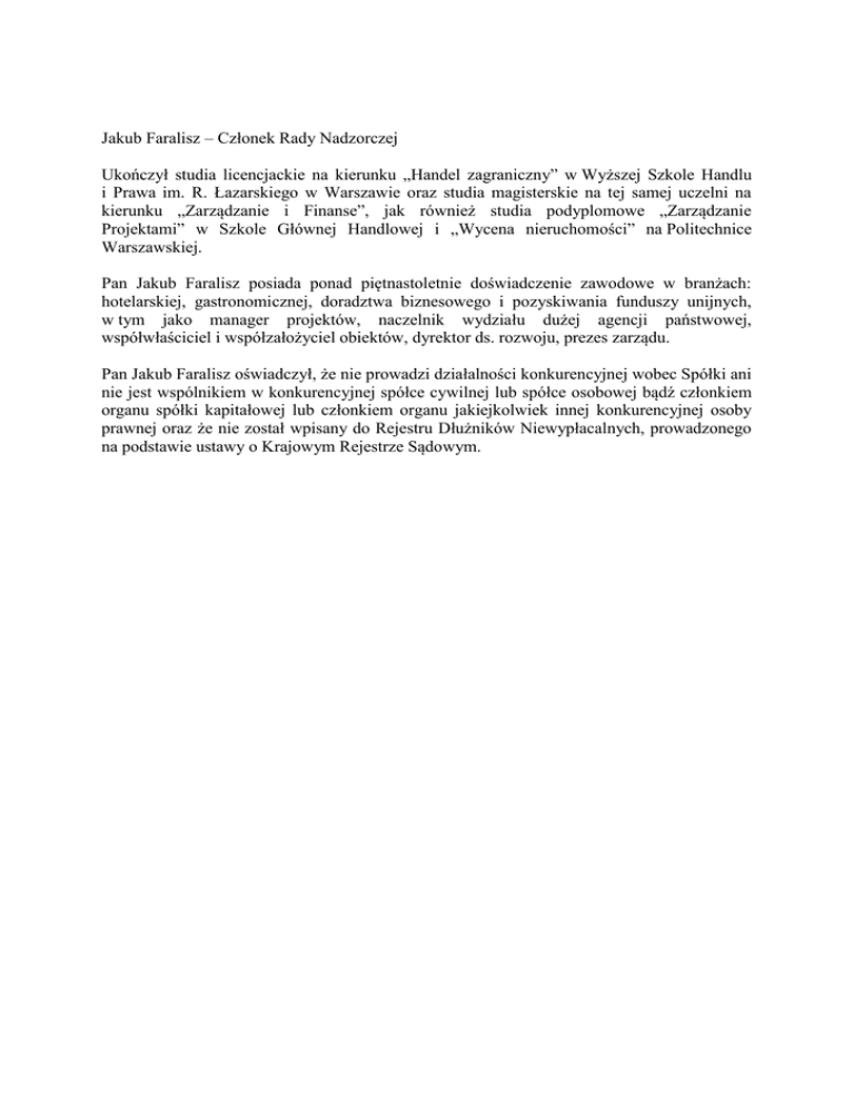 Jakub Faralisz – Członek Rady Nadzorczej Ukończył studia licencjackie na kierunku „Handel zagraniczny” w Wyższej Szkole Handlu i Prawa im. R. Łazarskiego w Warszawie oraz studia magisterskie na tej samej uczelni na kierunku „Zarządzanie i Finanse”, jak również studia podyplomowe „Zarządzanie Projektami” w Szkole Głównej Handlowej i „Wycena nieruchomości” na Politechnice Warszawskiej. Pan Jakub Faralisz posiada ponad piętnastoletnie doświadczenie zawodowe w branżach: hotelarskiej, gastronomicznej, doradztwa biznesowego i pozyskiwania funduszy unijnych, w tym jako manager projektów, naczelnik wydziału dużej agencji państwowej, współwłaściciel i współzałożyciel obiektów, dyrektor ds. rozwoju, prezes zarządu. Pan Jakub Faralisz oświadczył, że nie prowadzi działalności konkurencyjnej wobec Spółki ani nie jest wspólnikiem w konkurencyjnej spółce cywilnej lub spółce osobowej bądź członkiem organu spółki kapitałowej lub członkiem organu jakiejkolwiek innej konkurencyjnej osoby prawnej oraz że nie został wpisany do Rejestru Dłużników Niewypłacalnych, prowadzonego na podstawie ustawy o Krajowym Rejestrze Sądowym.