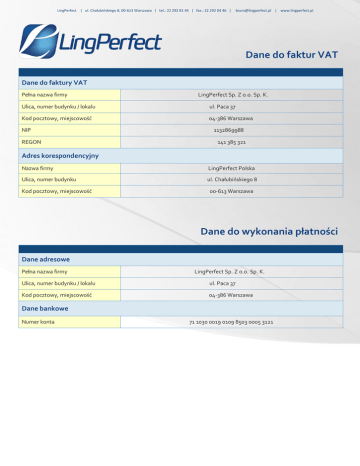 LingPerfect | ul. Chałubińskiego 8, 00-613 Warszawa | tel.: 22 292 81 44 | fax.: 22 292 04 46 | [email protected] | www.lingperfect.pl Dane do faktur VAT Dane do faktury VAT Pełna nazwa firmy LingPerfect Sp. Z o.o. Sp. K. Ulica, numer budynku / lokalu ul. Paca 37 Kod pocztowy, miejscowość 04-386 Warszawa NIP REGON 1132869988 141 385 321 Adres korespondencyjny Nazwa firmy LingPerfect Polska Ulica, numer budynku ul. Chałubińskiego 8 Kod pocztowy, miejscowość 00-613 Warszawa Dane do wykonania płatności Dane adresowe Pełna nazwa firmy LingPerfect Sp. Z o.o. Sp. K. Ulica, numer budynku / lokalu ul. Paca 37 Kod pocztowy, miejscowość 04-386 Warszawa Dane bankowe Numer konta 71 1030 0019 0109 8503 0005 3121