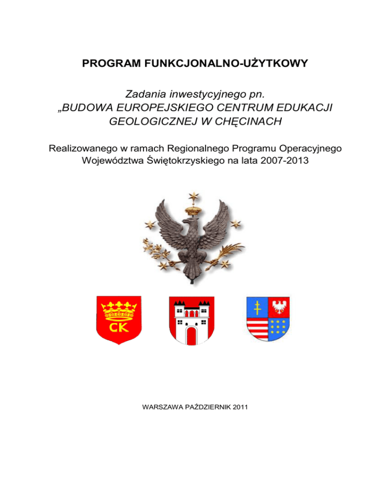 PROGRAM FUNKCJONALNO-UŻYTKOWY Zadania inwestycyjnego pn. „BUDOWA EUROPEJSKIEGO CENTRUM EDUKACJI GEOLOGICZNEJ W CHĘCINACH Realizowanego w ramach Regionalnego Programu Operacyjnego Województwa Świętokrzyskiego na lata 2007-2013 WARSZAWA PAŹDZIERNIK 2011 strona 1 Program Funkcjonalno – Użytkowy Nazwa zamówienia Budowa Europejskiego Geologicznej w Chęcinach Adres obiektu budowlanego Gmina i Miasto Chęciny dz. 373/4, 367/1 oraz 372 Nazwa i adres zamawiającego Data opracowania Centrum Edukacji Uniwersytet Warszawski ul. Krakowskie Przedmieście 26/28, 00-927 Warszawa, woj. Mazowieckie październik 2011 Nazwy i kody WSZ robót objętych przedmiotem zamówienia 71320000-7 Prace projektowe SPIS ZAWARTOŚCI Część 1 Opisowa Część 2 Informacyjna Opracowanie: BUDAR Dariusz Małowiecki ul. Królowej Marysieńki 96B, 02-954 Warszawa Budowa Europejskiego Centrum Edukacji Geologicznej w Chęcinach strona 2 Program Funkcjonalno – Użytkowy CZEŚĆ 1 CZĘŚĆ OPISOWA Budowa Europejskiego Centrum Edukacji Geologicznej w Chęcinach Program Funkcjonalno – Użytkowy strona 3 Spis treści CZĘŚĆ I OPISOWA OPIS OGÓLNY PRZEDMIOTU ZAMÓWIENIA................................................................................................. 5 1 WSTĘP ............................................................................................................................................................ 5 1.1 PODSTAWA OPRACOWANIA PROGRAMU ...................................................................................................... 5 1.2 ZAMAWIAJĄCY .......................................................................................................................................... 5 1.3 DEFINICJE POJĘĆ ZGODNIE Z ART. 3 ROZDZIAŁ 1 USTAWY PRAWO BUDOWLANE .......................................... 5 1.4 ZAKRES I PRZEDMIOT ZAMÓWIENIA ............................................................................................................ 7 1.4.1 Przedmiot zamówienia .......................................................................................................................... 7 1.4.2 Zakres zamówienia................................................................................................................................ 8 1.5 CEL INWESTYCJI ........................................................................................................................................ 8 1.6 MATERIAŁY ŹRÓDŁOWE ............................................................................................................................. 8 1.7 WYKORZYSTANIE MATERIAŁÓW ................................................................................................................. 8 2 AKTUALNE UWARUNKOWANIA WYKONANIA PRZEDMIOTU ZAMÓWIENIA .............................. 9 2.1 2.2 2.3 2.4 3 ZAKRES ZADANIA INWESTYCYJNEGO .......................................................................................................... 9 LOKALIZACJA .......................................................................................................................................... 10 MOŻLIWOŚĆ DOJAZDU W CZASIE TRWANIA BUDOWY I DOCELOWO ............................................................. 10 WARUNKI ZASILANIA W MEDIA................................................................................................................. 11 WYMAGANIA ZAMAWIAJĄCEGO W STOSUNKU DO PRZEDMIOTU ZAMÓWIENIA .................. 12 3.1 WYMAGANIA DOTYCZĄCE BUDOWY BUDYNKU GŁÓWNEGO ....................................................................... 12 3.1.1 Wymagania architektoniczno-konstrukcyjne ........................................................................................ 12 3.1.2 Wymagania instalacyjne...................................................................................................................... 13 3.1.3 Wymagania dotyczące rozplanowania pomieszczeń i wykończenia w budynku ...................................... 13 3.2 WYMAGANIA DOTYCZĄCE BUDOWY 2 BUDYNKÓW HOTELOWYCH DLA STUDENTÓW ................................... 16 3.2.1 Wymagania dotyczące architektury i konstrukcji budynków mieszkalnych ............................................ 16 3.2.2 Wymagania instalacyjne...................................................................................................................... 17 3.2.3 Wymagania dotyczące rozplanowania pomieszczeń i wykończenia w budynkach hotelowych dla studentów ........................................................................................................................................................ 17 3.3 WYMAGANIA DOTYCZĄCE BUDOWY BUDYNKU HOTELOWEGO DLA KADRY I GOŚCI OŚRODKA ..................... 19 3.3.1 Wymagania architektoniczno-konstrukcyjne budynku hotelowego dla kadry i gości ośrodka................. 19 3.3.2 Wymagania instalacyjne...................................................................................................................... 20 3.3.3 Wymagania dotyczące rozplanowania pomieszczeń i wykończenia w budynku hotelowym dla kadry i gości ośrodka .................................................................................................................................................. 20 3.4 WYMAGANIA DOTYCZĄCE BUDOWY BUDYNKU LABORATORIUM ............................................................... 22 3.4.1 Wymagania architektoniczno- konstrukcyjne budynku laboratorium .................................................... 22 3.4.2 Wymagania instalacyjne...................................................................................................................... 23 3.4.3 Wymagania dotyczące rozplanowania pomieszczeń i wykończenia w budynku laboratorium................. 24 3.5 WYMAGANIA ZAMAWIAJĄCEGO DOTYCZĄCE INSTALACJI .......................................................................... 26 3.6 OŚWIETLENIE TERENU...............