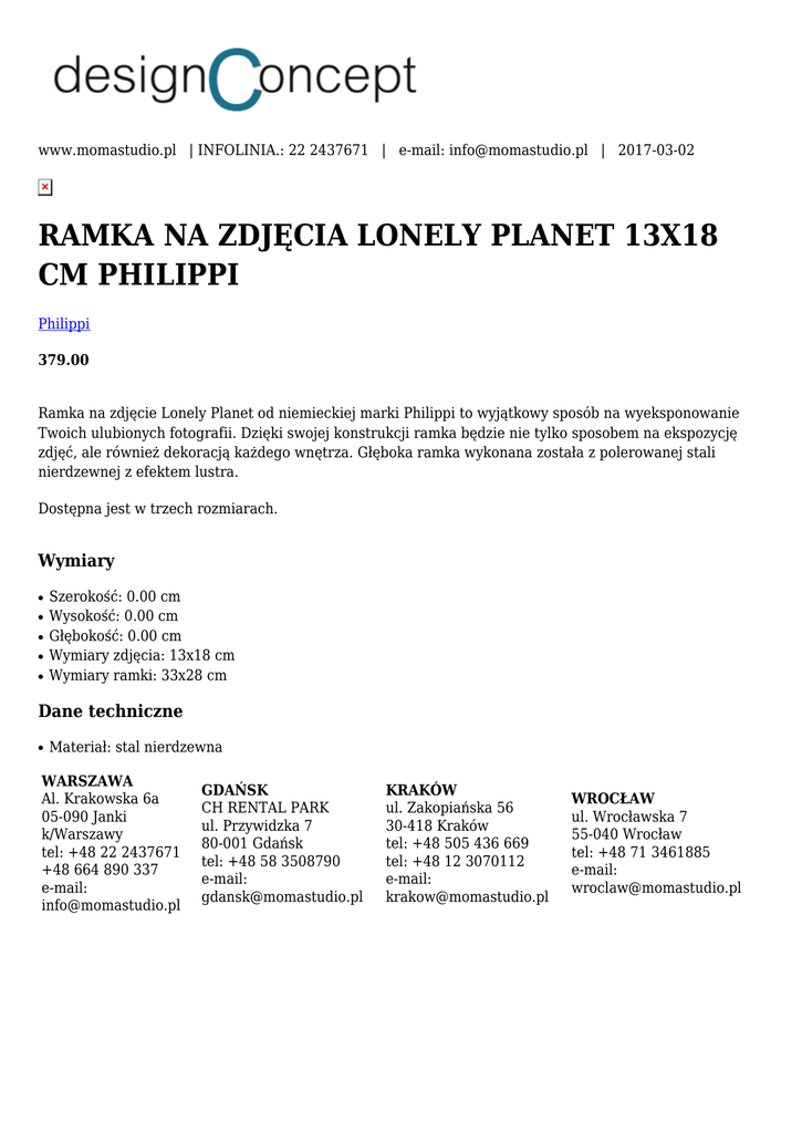 www.momastudio.pl | INFOLINIA.: 22 2437671 | e-mail: [email protected] | 2017-03-02 RAMKA NA ZDJĘCIA LONELY PLANET 13X18 CM PHILIPPI Philippi 379.00 Ramka na zdjęcie Lonely Planet od niemieckiej marki Philippi to wyjątkowy sposób na wyeksponowanie Twoich ulubionych fotografii. Dzięki swojej konstrukcji ramka będzie nie tylko sposobem na ekspozycję zdjęć, ale również dekoracją każdego wnętrza. Głęboka ramka wykonana została z polerowanej stali nierdzewnej z efektem lustra. Dostępna jest w trzech rozmiarach. Wymiary ● ● ● ● ● Szerokość: 0.00 cm Wysokość: 0.00 cm Głębokość: 0.00 cm Wymiary zdjęcia: 13x18 cm Wymiary ramki: 33x28 cm Dane techniczne ● Materiał: stal nierdzewna WARSZAWA Al. Krakowska 6a 05-090 Janki k/Warszawy tel: +48 22 2437671 +48 664 890 337 e-mail: [email protected] GDAŃSK CH RENTAL PARK ul. Przywidzka 7 80-001 Gdańsk tel: +48 58 3508790 e-mail: [email protected] KRAKÓW ul. Zakopiańska 56 30-418 Kraków tel: +48 505 436 669 tel: +48 12 3070112 e-mail: [email protected] WROCŁAW ul. Wrocławska 7 55-040 Wrocław tel: +48 71 3461885 e-mail: [email protected]