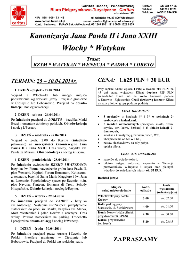 Kanonizacja Jana Pawła II i Jana XXIII Włochy * Watykan Trasa: RZYM * WATYKAN * WENECJA * PADWA * LORETO TERMIN: 25 – 30.04.2014r. CENA: 1.625 PLN + 30 EUR 1 DZIEŃ – piątek - 25.04.2014 Wyjazd z Włocławka lub innego miejsca podstawienia wg rozkładu jazdy. Przejście graniczne w Cieszynie lub Boboszowie. Przejazd na obiadokolację i nocleg k/Wenecji. Przy zapisie Klient wpłaca I ratę w kwocie 700 PLN, na 45 dni przed wyjazdem Klient dopłaca 925 PLN (w siedzibie Biura lub na konto bankowe podane w Umowie - Zgłoszeniu). Część dewizową kosztów Klient uiszcza pilotowi grupy podczas podróży. 2 DZIEŃ – sobota - 26.04.2014 Po śniadaniu przejazd do LORETO – bazylika Matki Bożej i cmentarz żołnierzy polskich. Obiado-kolacja i nocleg k/Pescary. CENA OBEJMUJE: 5 noclegów w hotelach 4* i 3* w pokojach 2osobowych z łazienkami, 5 śniadań wzmocnionych (pieczywo, masło, dżem, szynka, ser, kawa, herbata) i 5 obiado-kolacji 3daniowych, autokar z klimatyzacją, barkiem, video, WC, ubezpieczenie od NNW i KL, zestaw słuchawkowy na cały pobyt, opiekę pilota. 3 DZIEŃ – niedziela - 27.04.2014 Wyjazd o godz. 2:00 do Rzymu (śniadanie pakowane) na uroczystości kanonizacyjne Jana Pawła II i Jana XXIII. Czas wolny, bazylika św. Pawła za Murami. Obiado-kolacja i nocleg k/Rzymu. 4 DZIEŃ – poniedziałek - 28.04.2014 Po śniadaniu zwiedzanie RZYMU i WATYKANU: bazylika św. Piotra, nawiedzenie grobu Jana Pawła II, plac Wenecki, Kapitol, Forum Romanum, Koloseumz zewnątrz, bazyliki Santa Maria Maggiore i św. Jana na Lateranie. Popołudniowy spacer po Rzymie, m.in. plac Navona, Panteon, fontanna di Trevi, Schody Hiszpańskie. Obiado-kolacja i nocleg k/Rzymu. DZIEŃ – wtorek - 29.04.2014 Po śniadaniu przejazd do PADWY - bazylika św. Antoniego. Następnie WENECJA: przepłyniecie stateczkiem do placu św. Marka, bazylika św. Marka, Most Westchnień i pałac Dożów z zewnątrz. Czas wolny. Powrót stateczkiem na parking Tronchetto i przejazd na obiado-kolację i nocleg k/Wenecji. Włocławek/ przy hotelu Kujawy Koło/ parking przy Starostwie, ul. Sienkiewicza Konin Nowy (wieża ciśnień przy dworcu PKP/PKS) Kalisz/ przy bazylice św. Józefa 5 6 DZIEŃ – środa - 30.04.2014 Po śniadaniu przejazd przez Austrię i Czechy do Polski. Przejście graniczne w Cieszynie lub Boboszowie. Przyjazd do Polski wg rozkładu jazdy. CENA NIE OBEJMUJE: napojów do obiado-kolacji, biletów wstępu, autostrad, vaporetto w Wenecji, przewodników w Rzymie i Asyżu oraz płatnych wjazdów do zwiedzanych miast - ok. 55 EUR. Rozkład jazdy: Miejsce wsiadanie/wysiadanie Godz. odjazdu Godz. wysiadania (orientacyjnie) 3:00 ok. 02:00 4:00 ok. 01:00 4:30 ok. 00:30 5:20 ok. 23:45 ZAPRASZAMY