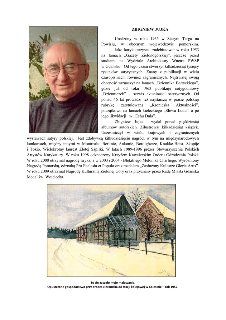 ZBIGNIEW JUJKA Urodzony w roku 1935 w Starym Targu na Powiślu, w obecnym województwie pomorskim. Jako karykaturzysta zadebiutował w roku 1953 na łamach „Gazety Zielonogórskiej”, jeszcze przed studiami na Wydziale Architektury Wnętrz PWSP w Gdańsku. Od tego czasu stworzył kilkadziesiąt tysięcy rysunków satyrycznych. Znany z publikacji w wielu czasopismach, również zagranicznych. Najtrwalej swoją obecność zaznaczył na łamach „Dziennika Bałtyckiego”, gdzie już od roku 1963 publikuje cotygodniowy „Dzienniczek” – serwis aktualności satyrycznych. Od ponad 46 lat prowadzi też najstarszą w prasie polskiej rubrykę zatytułowaną „Kroniczka Aktualności”, początkowo na łamach kieleckiego „Słowa Ludu”, a po jego likwidacji w „Echu Dnia”. Zbigniew Jujka wydał ponad pięćdziesiąt albumów autorskich. Zilustrował kilkadziesiąt książek. Uczestniczył w wielu krajowych i zagranicznych wystawach satyry polskiej. Jest zdobywcą kilkudziesięciu nagród, w tym na międzynarodowych konkursach, między innymi w Montrealu, Berlinie, Ankonie, Bordigherze, Knokke-Heist, Skopije i Tokio. Wielokrotny laureat Złotej Szpilki. W latach 1989-1996 prezes Stowarzyszenia Polskich Artystów Karykatury. W roku 1998 odznaczony Krzyżem Kawalerskim Orderu Odrodzenia Polski. W roku 2000 otrzymał nagrodę Eryka, a w 2003 i 2004 - Błękitnego Melonika Charliego. Wyróżniony Nagrodą Pomorską, odznaką Pro Ecclesia et Populo oraz medalem „Zasłużony Kulturze Gloria Artis”. W roku 2009 otrzymał Nagrodę Kulturalną Zielonej Góry oraz przyznany przez Radę Miasta Gdańska Medal św. Wojciecha. Tu się zaczęło moje malowanie. Opuszczone gospodarstwo przy drodze z Kramska do stacji kolejowej w Kolesinie – rok 1952. Zbigniew Jujka KRAMSKIE POWROTY Muszę zacząć te wspominki od retrospekcji. Minęło prawie 70 lat od czasu naszego pobytu w Nowym Kramsku, a jest to dla mnie krótki, bo krótki (1947-1951), ale najwspanialszy okres życia, który wciąż z ogromnym sentymentem wspominam, bardzo często wracam w myślach do tamtych dni. Chciałoby się przeżyć to wszystko jeszcze raz. „Zawołanie kongresowe” A jak to się stało, że znaleźliśmy się napisane na Kongres Polaków w Kramsku? Ojciec mój, Franciszek Jujka (pseudonim w Niemczech. Lech Malbor) był nauczycielem szkolnictwa polskiego Berlin – 6.03.1938 r. w Niemczech – aż po czasy hitlerowskie. Był Od mrocznych wieków ojcowie moi jednocześnie znaczącym działaczem spod znaku Rodła, poetą, autorem Hymnu Rodła i scenicznego tekstu Dzierżą przygraniczne szlaki. przygotowanego na Kongres Polaków w Niemczech Gdzie Bytów, Złotów i Babimost stoi, (Berlin, marzec 1938 r.), w którym to zawołaniu Tam krwi i potu są znaki. rodłowym wspomina również Babimojszczyznę: gdzie Czule nad nimi dzwonu dźwięk stróżuje „ojcowie nasi od mrocznych wieków dzierżą pograniczne szlaki, gdzie Bytów, Złotów Z zakrzewskiej płynący wieży. i Babimost stoi, tam krwi i potu są znaki”. Ojcom za wytrwanie niebo zwiastuje, Niemcy mieli dość takich ludzi. Po Hartu moc daje młodzieży. nieustających szykanach, aresztowaniach na koniec wyrzucili nas z Rzeszy. Ojciec dostał kierownictwo A Ojce nasi to Piasta synowie, szkoły w Kębłowie, koło Wolsztyna. Tu zastała nas To lud od sochy i pola, wojna. Ojciec już przed 1 września ukrywał się. Wiem Co w polskim zwyczaju i w polskim tylko, że w czasie wojny działał w podziemiu na terenie słowie, Wielkopolski, m.in. był szefem konspiracyjnego Tak twardy, jak jego dola! harcerstwa. Zginął zakatowany przez faszystów W tej doli jednakiej wołamy was: prawdopodobnie w Gross-Rosen. Mama została z czwórką małolatów w skrajnej nędzy, bez W gromadzie stańmy Rodacy! jakichkolwiek środków do życia. Tylko dobrym Toć krew, co w braci łączy nas, ludziom zawdzięczamy to, że żyjemy. Wyrzuceni ze To znak: Jesteśmy Polacy! szkoły tułaliśmy się w maleńkich pokoikach przygarnięci przez dobrych ludzi. Bywało, Cóż to za znak tak srebrem lśni? że woda zamarzała w wiadrze w takim lokum, To Rodło! a ogrzewane było „kozą” dla której znosiliśmy szyszki, To wiary i krwi naszej godło, suche gałęzie i wory igliwia z pobliskiego lasu. Muszę Przyszłości naszej jasne dni. tu jeszcze wspomnieć oblata o. Jerzego Machonia, który już konspiracyjnie działał na tych obszarach, a po Pod znaku tego świętym blaskiem wojnie został proboszczem w Kębłowie. Był bardzo stajem – ważnym naszym opiekunem i dobroczyńcą do chwili My Śląsk! I my z Ziem Połabskich! naszego wyjazdu do Kramska. My Westfalia i Nadrenia! A więc Nowe Kramsko! Dobrzy ludzie znaleźli I my z Warmii, Mazur i Ziemi pracę dla mamy w organizowanym Domu Dziecka. Malborskej! I my z Pogranicza! Opiekę znalazły tu przede wszystkim sieroty po Lech Malbor (Franciszek Jujka) powstańcach warszawskich, ale znaleźli się też kramszczanie, m.in. trzy Andrysówny: Urszula, Łucja i Elżbieta. Cały dom dziecka z kierownikiem - panem Isalskim. Po prawej stronie pana Isalskiego moja mama, po lewej pani Isalska i dalej pani Kuskowa. Po sześcioletniej udręce zamieszkaliśmy w niedawno zbudowanym jeszcze przez Niemców zespole budynków Grenzschuzu, przez nas nazywanym „blokchasy”. Ten przyjazd do Kramska to był przeskok cywilizacyjny. To było nasze Eldorado. Raptem trzy pokoje, kuchnia, no i łazienka z węglowym piecykiem podgrzewającym zbiornik wody! Ten zapach rozgrzanego kotła z którego ukrop leciał do wanny. Zespół tej zabudowy składał się z dwóch budynków – jeden długi, parterowy, z zagospodarowanym poddaszem, drugi piętrowy. Poświęcenie Domu Dziecka – ks. Ignacy Karolewski Budynek gospodarczy ze stertą drewna. Mirka - moja siostra, ja, nasza mama, pani Kuskowa Moja mama, pani Isalska z Jolą, Leszek, Marek, pan kierownik St. Isalski W parterowym było nasze mieszkanie, mieszkanie pp. Isalskich (p. Stanisław Isalski by