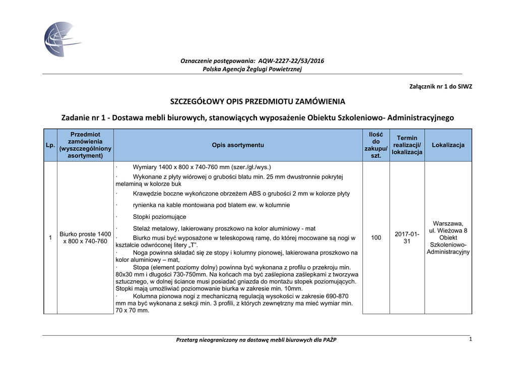 Oznaczenie postępowania: AQW‐2227‐22/53/2016 Polska Agencja Żeglugi Powietrznej Załącznik nr 1 do SIWZ SZCZEGÓŁOWY OPIS PRZEDMIOTU ZAMÓWIENIA Zadanie nr 1 ‐ Dostawa mebli biurowych, stanowiących wyposażenie Obiektu Szkoleniowo‐ Administracyjnego Przedmiot zamówienia Lp. (wyszczególniony asortyment) Opis asortymentu · Ilość Termin do realizacji/ zakupu/ lokalizacja szt. Lokalizacja Wymiary 1400 x 800 x 740-760 mm (szer./gł./wys.) · Wykonane z płyty wiórowej o grubości blatu min. 25 mm dwustronnie pokrytej melaminą w kolorze buk 1 · Krawędzie boczne wykończone obrzeżem ABS o grubości 2 mm w kolorze płyty · rynienka na kable montowana pod blatem ew. w kolumnie · Stopki poziomujące · Stelaż metalowy, lakierowany proszkowo na kolor aluminiowy - mat Biurko proste 1400 · Biurko musi być wyposażone w teleskopową ramę, do której mocowane są nogi w x 800 x 740-760 kształcie odwróconej litery „T”. · Noga powinna składać się ze stopy i kolumny pionowej, lakierowana proszkowo na kolor aluminiowy – mat, · Stopa (element poziomy dolny) powinna być wykonana z profilu o przekroju min. 80x30 mm i długości 730-750mm. Na końcach ma być zaślepiona zaślepkami z tworzywa sztucznego, w dolnej ściance musi posiadać gniazda do montażu stopek poziomujących. Stopki mają umożliwiać poziomowanie biurka w zakresie min. 10mm. · Kolumna pionowa nogi z mechaniczną regulacją wysokości w zakresie 690-870 mm ma być wykonana z sekcji min. 3 profili, z których zewnętrzny ma mieć wymiar min. 70 x 70 mm. 100 2017-0131 Warszawa, ul. Wieżowa 8 Obiekt SzkoleniowoAdministracyjny Przetarg nieograniczony na dostawę mebli biurowych dla PAŻP 1 Oznaczenie postępowania: AQW‐2227‐22/53/2016 Polska Agencja Żeglugi Powietrznej · Biurko wyposażone w osłonę dolną/blenda w kolorze biurka Tolerancja wymiarów +/- 5% · Wymiary 900 x 600 x 740-760 mm (szer./gł./wys.) · Wykonane z płyty wiórowej o grubości blatu min. 25 mm dwustronnie pokrytej melaminą w kolorze jasny szary · 2 Biurko proste 900 x 600 x 740–760 mm Krawędzie boczne wykończone obrzeżem ABS o grubości 2 mm w kolorze płyty · Nogi – stelaż metalowy w kształcie odwróconej litery „T” lakierowany proszkowo na kolor aluminiowy – mat, dolna stopa wykonana z profilu zamkniętego o długości min. 600 mm wraz z zaślepkami, poprzeczka górna wykonana z profilu o długości min. 450 mm wraz z zaślepkami, kolumna stelaża z profilu półowalnego o szerokości min. 1350 mm, rynienka na kable montowana pod blatem ew. w kolumnie · Stopki poziomujące · Wyposażenie dodatkowe: podłączenie 230V, RJ45 124 2017-0131 Warszawa, ul. Wieżowa 8 Obiekt SzkoleniowoAdministracyjny 2017-0131 Warszawa, ul. Wieżowa 8 Obiekt SzkoleniowoAdministracyjny Tolerancja wymiarów +/- 5% · Wymiary 900 x 800 x 740-760 mm (szer./gł./wys.) · Wykonane z płyty wiórowej o grubości blatu min. 25 mm dwustronnie pokrytej melaminą w kolorze jasny szary · 3 Krawędzie boczne wykończone obrzeżem ABS o grubości 2 mm w kolorze płyty · Nogi – stelaż metalowy w kształcie odwróconej litery „T” lakierowany proszkowo na Biurko proste kolor aluminiowy – mat, dolna stopa wykonana z profilu zamkniętego o długości min. 600 900x800x740-760 mm wraz z zaślepkami, poprzeczka górna wykonana z profilu o długości min. 450 mm wraz z zaślepkami, kolumna stelaża z profilu półowalnego o szerokości min. 1350 mm, rynienka na kable montowana pod blatem ew. w kolumnie · Stopki poziomujące · Wyposażenie dodatkowe: podłączenie 230V, RJ45 28 Przetarg nieograniczony na dostawę mebli biurowych dla PAŻP 2 Oznaczenie postępowania: AQW‐2227‐22/53/2016 Polska Agencja Żeglugi Powietrznej Tolerancja wymiarów +/- 5% · Wymiary 2000 x 800 x 740-760 mm (szer./gł./wys.) · Wykonane z płyty wiórowej o grubości blatu min. 25 mm dwustronnie pokrytej melaminą w kolorze buk · 4 Biurko proste 2000x800x740760 Krawędzie boczne wykończone obrzeżem ABS o grubości 2 mm w kolorze płyty · Nogi – stelaż metalowy w kształcie odwróconej litery „T” lakierowany proszkowo na kolor aluminiowy – mat, dolna stopa wykonana z profilu zamkniętego o długości min. 600 mm wraz z zaślepkami, poprzeczka górna wykonana z profilu o długości min. 450 mm wraz z zaślepkami, kolumna stelaża z profilu półowalnego o szerokości min. 1350 mm, rynienka na kable montowana pod blatem ew. w kolumnie · 2017-0131 Warszawa, ul. Wieżowa 8 Obiekt SzkoleniowoAdministracyjny 1 2017-0131 Warszawa, ul. Wieżowa 8 Obiekt SzkoleniowoAdministracyjny 5 2017-0131 Warszawa, ul. Wieżowa 8 Obiekt 2 Stopki poziomujące Tolerancja wymiarów +/- 5% · Wymiary 1000 x 800 x 740 mm (szer./gł./wys.) · Wykonane z płyty wiórowej o grubości blatu min. 25 mm dwustronnie pokrytej melaminą w kolorze buk · 5 Biurko proste 1000x800x740760 Krawędzie boczne wykończone obrzeżem ABS o grubości 2 mm w kolorze płyty · Nogi – stelaż metalowy w kształcie odwróconej litery „T” lakierowany proszkowo na kolor aluminiowy – mat, dolna stopa wykonana z profilu zamkniętego o długości min. 600 mm wraz z zaślepkami, poprzeczka górna wykonana z profilu o długości min. 450 mm wraz z zaślepkami, kolumna stelaża z profilu półowalnego o szerokości min. 1350 mm, rynienka na kable montowana pod blatem ew. w kolumnie · Stopki poziomujące Tolerancja wymiarów +/- 5% 6 Regał do sortowania · Podłogowy regał do sortowania, · Wymiar regału: szer. 915 mm, wys.2000 mm, gł. 400 mm. łącznie z cokołem Przetarg nieograniczony na dostawę mebli biurowych dla PAŻP 3 Oznaczenie postępowania: AQW‐2227‐22/53/2016 Polska Agencja Żeglugi Powietrznej · SzkoleniowoAdministracyjny Regał pionowo podzielony na 3 sekcje, w każdej sekcji po 18 schowków · Ilość schowków 54 szt., możliwość dowolnej regulacji ilości i wysokości schowków w odstępach 32 mm · Wykonane z płyty wiórowej o grubości 18 mm dwustronnie pok